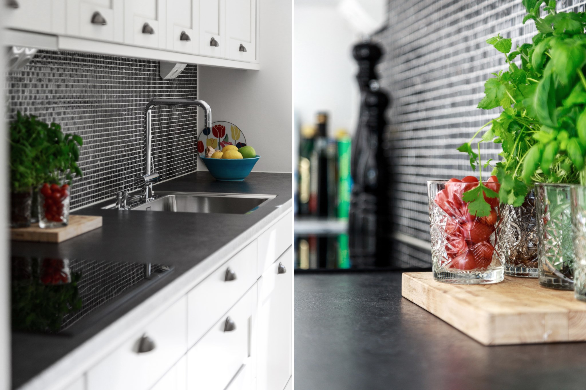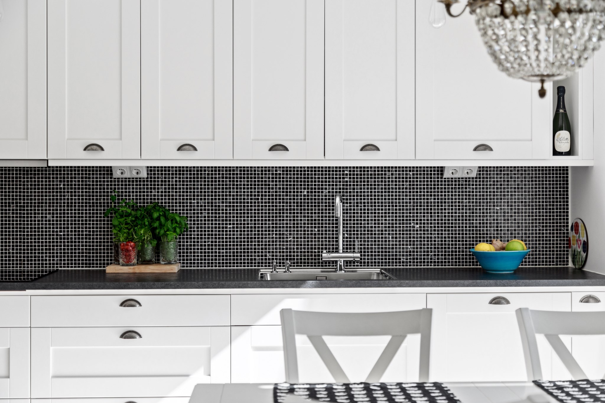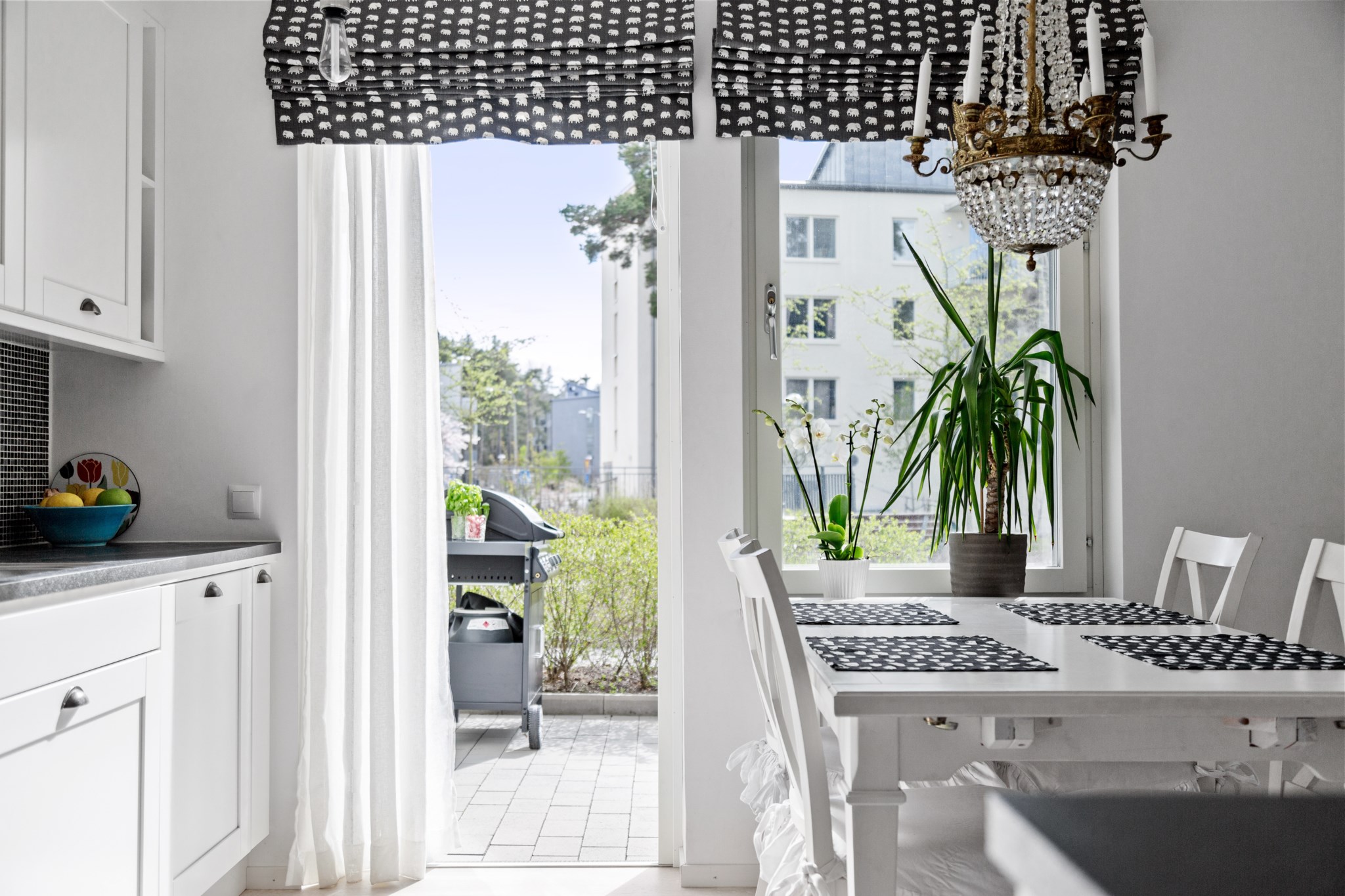 KÖK | Stort fullutrustat kök i vita och svarta kontraster från Vedum och maskinell utrustning från kvalitetsmärket Siemens. Här finns ugn, mikrovågsugn, häll, fläkt, integrerad diskmaskin samt kyl/frys. Den optimala planlösningen gör att du har gott om arbetsyta samtidigt som det finns plats för matsalsgrupp för 4-6 personer intill fönstret.