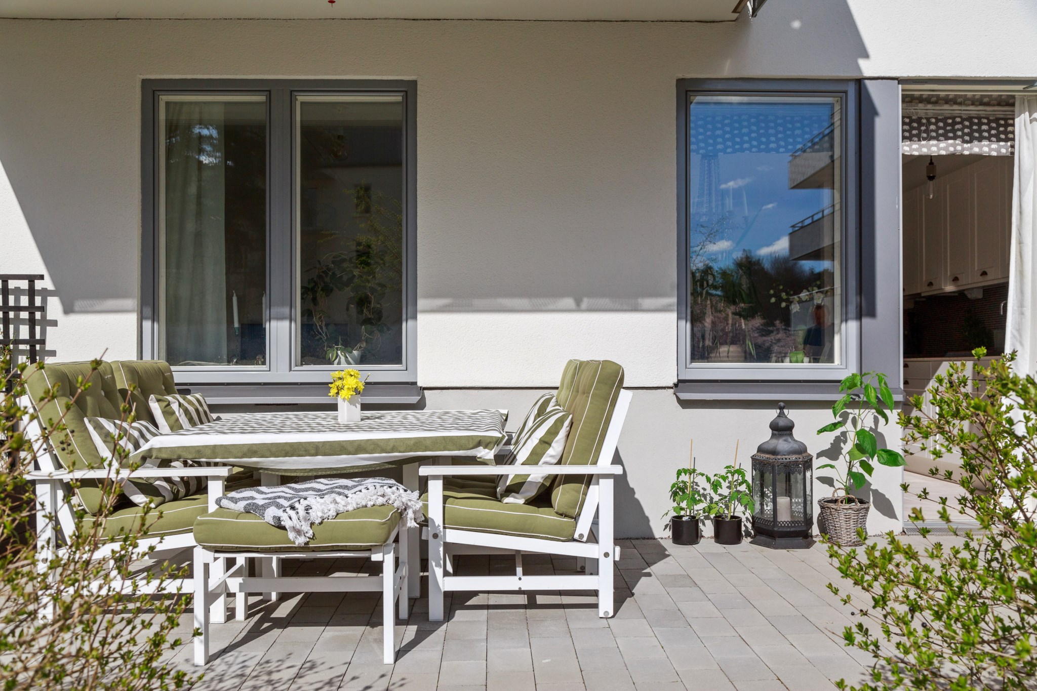 Den stora stenlagda uteplatsen om cirka 30 kvm ligger i soligt sydläge och blir en naturlig förlängning av bostaden. Här finns gott om plats för både loungedel, matgrupp och odlingar – perfekt för långa sommardagar och sociala tillställningar.