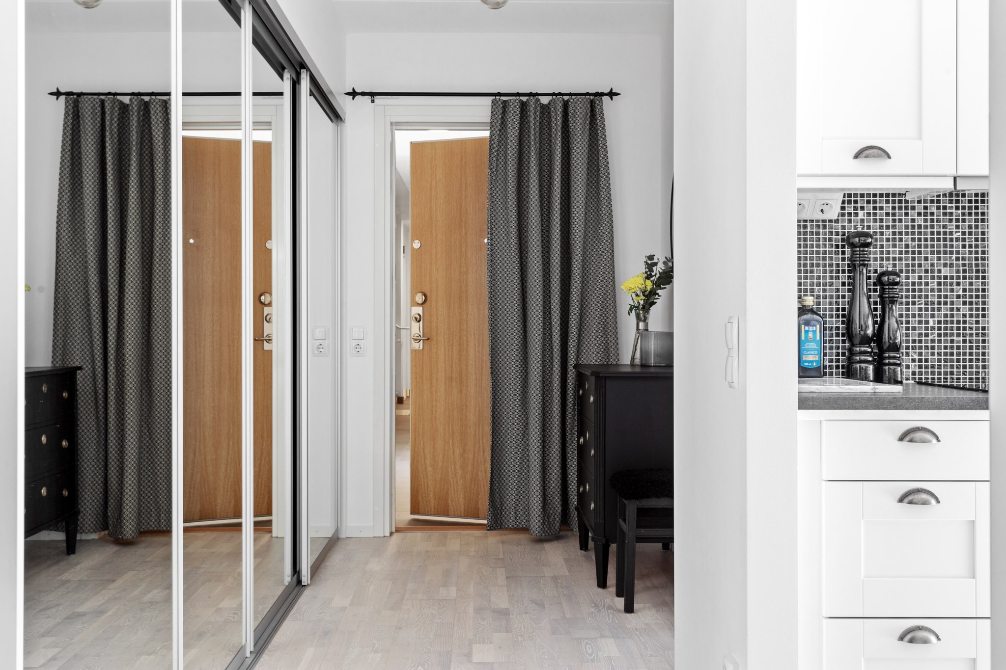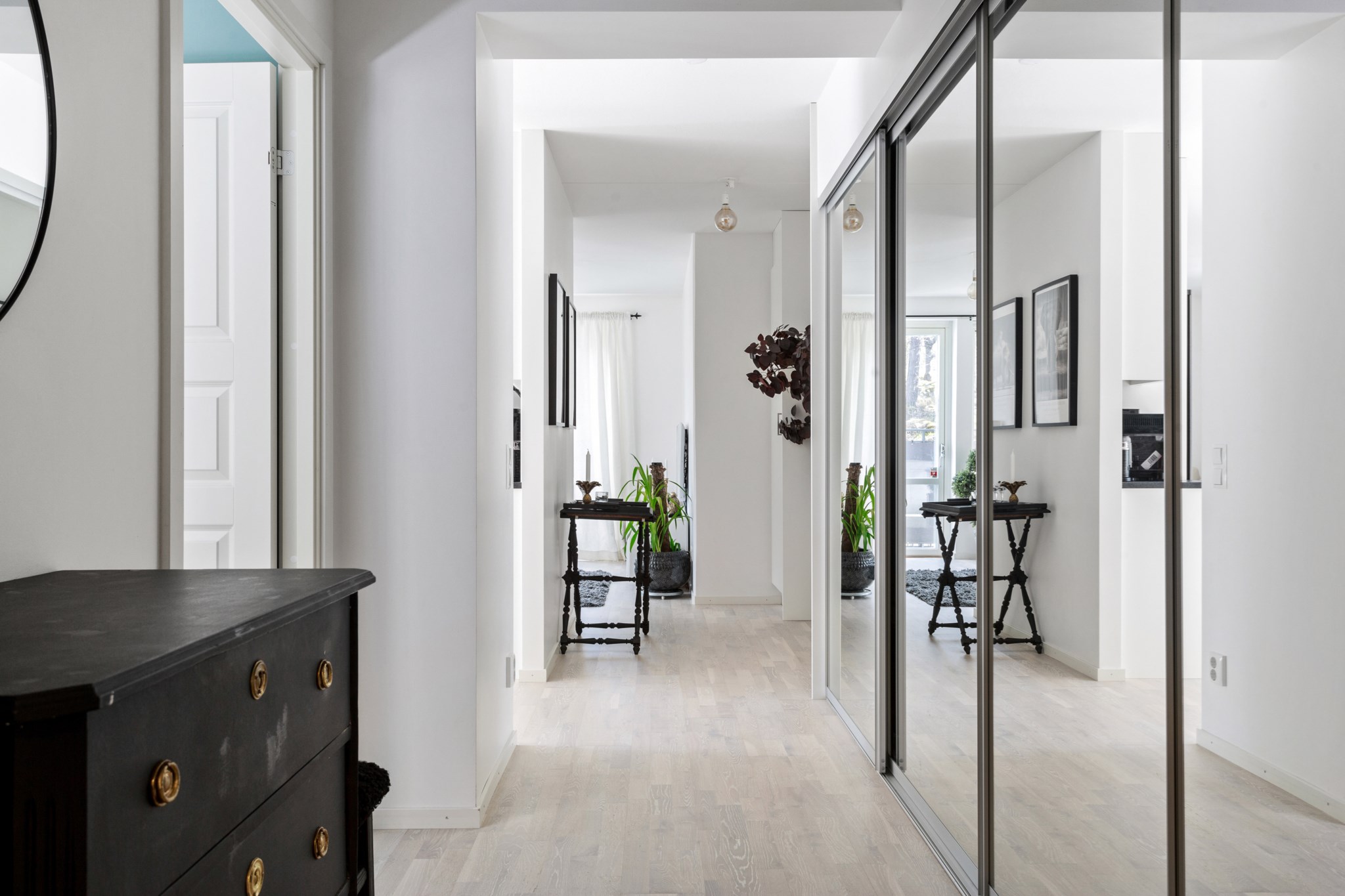 HALL | Välkommen in till en rymlig hall med förvaring i stor skjutdörrsgarderob med Elfa-inredning. Här finns även plats för annan önskad hallmöbel. Vitmålade väggar och parkettgolv som är genomgående i lägenheten.