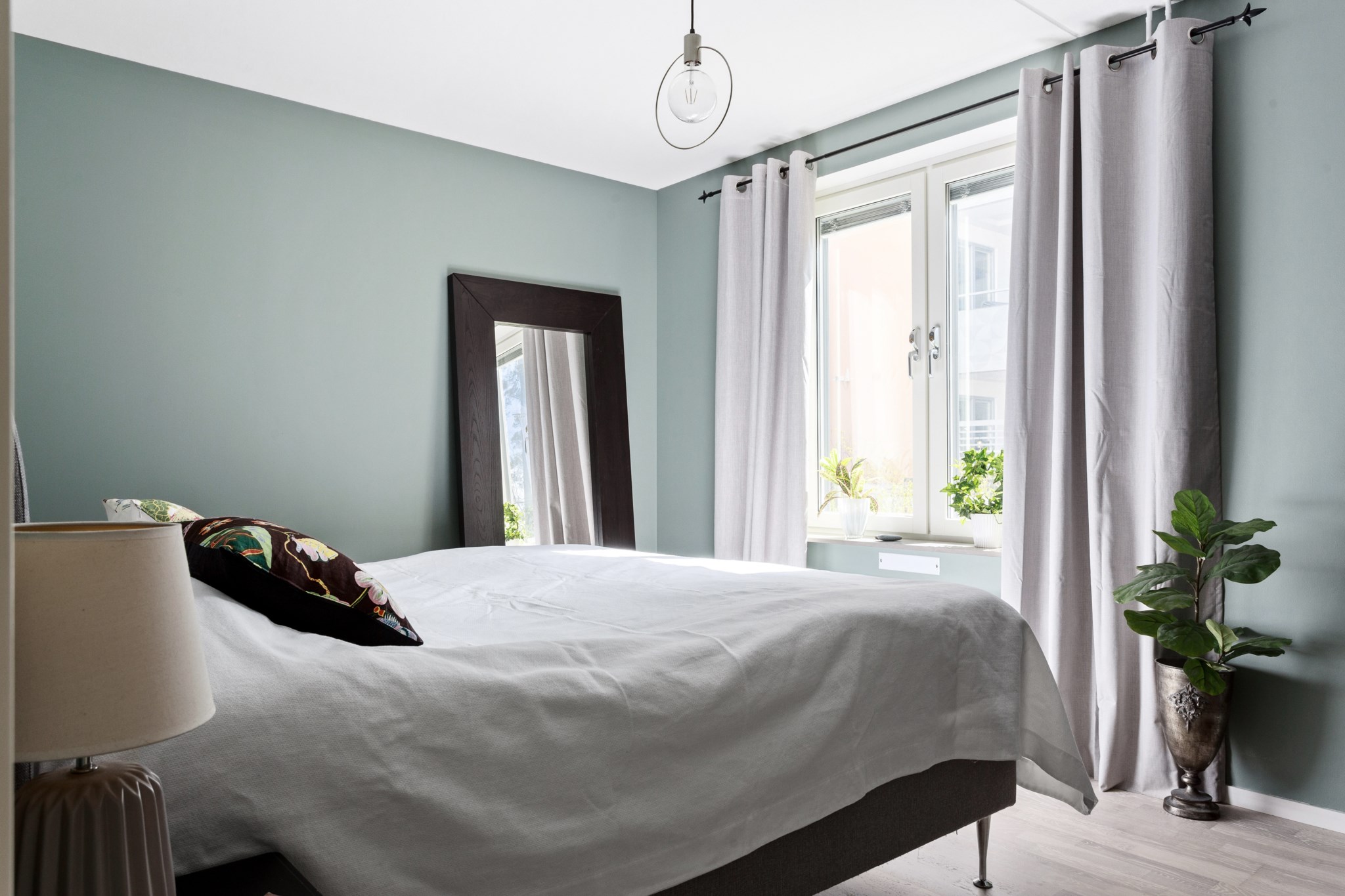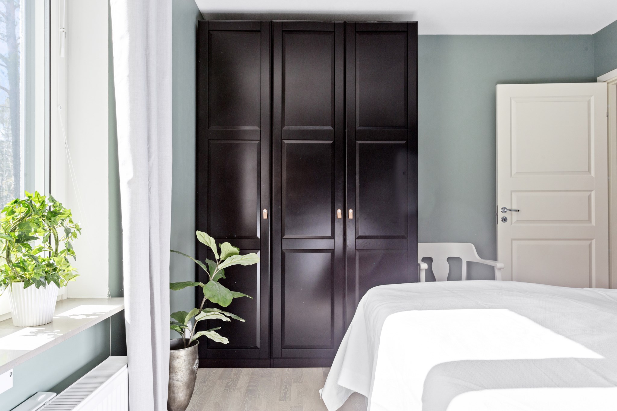SOVRUM | Mysigt och rogivande sovrum som pryds av väggar målade i sober kulör. Här ryms dubbelsäng med sängbord samt byrå eller annan önskad möbel. Goda förvaringsmöjligheter i stor garderob.