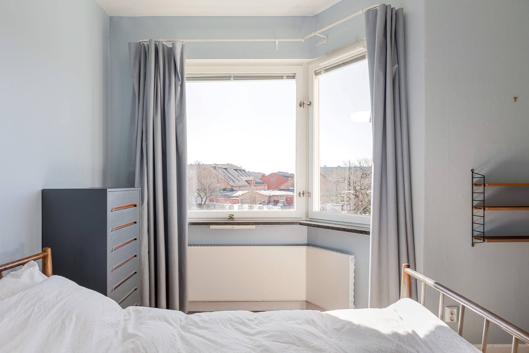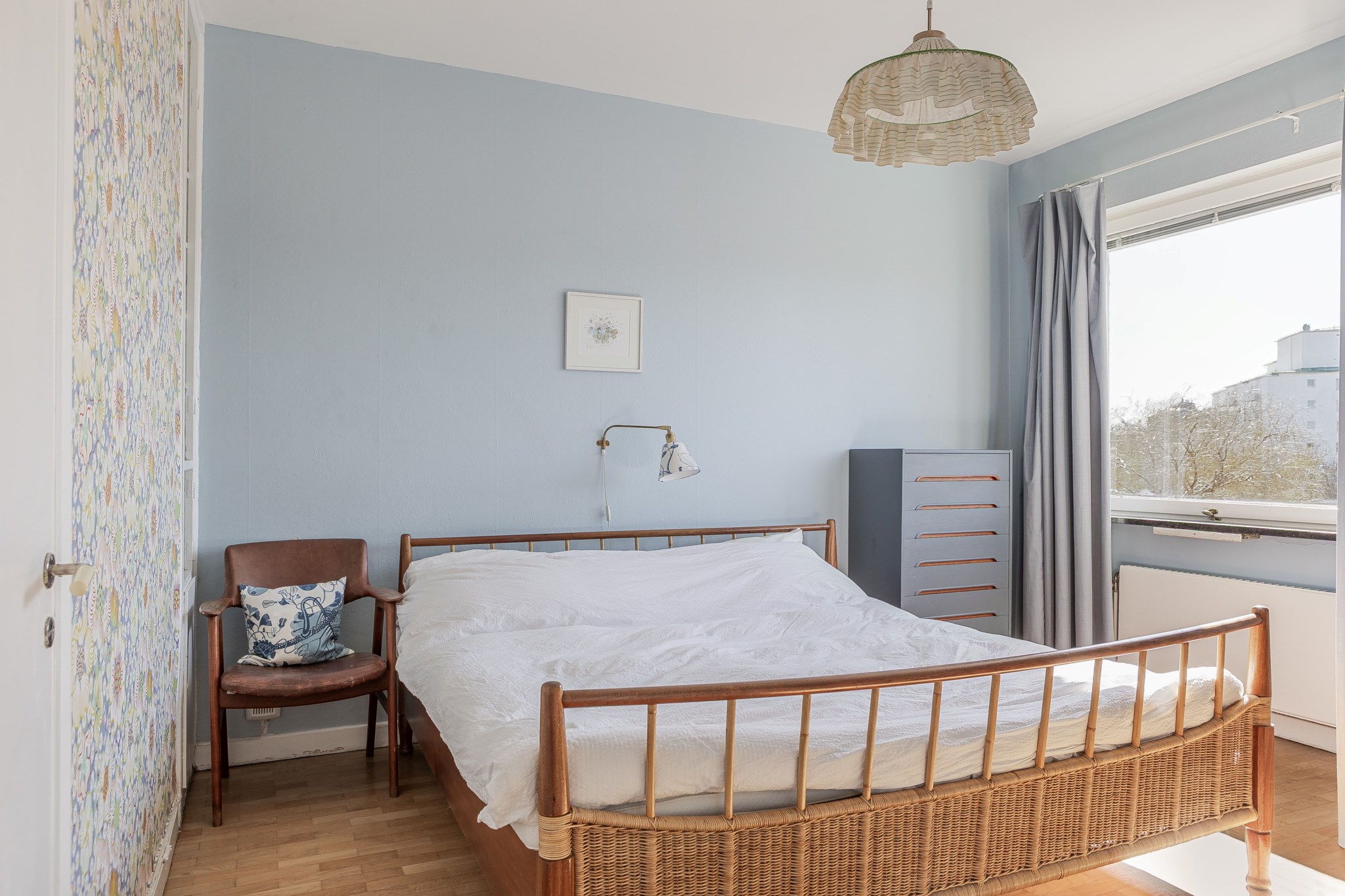 Rogivande sovrum med fint ljusinsläpp från fönster i vinkel. Plats för dubbelsäng med tillhörande sängbord. Platsbyggd hylla samt möjlighet att komplettera med garderob vid behov. Målade ytskikt kombinerat med tapet och parkettgolv.