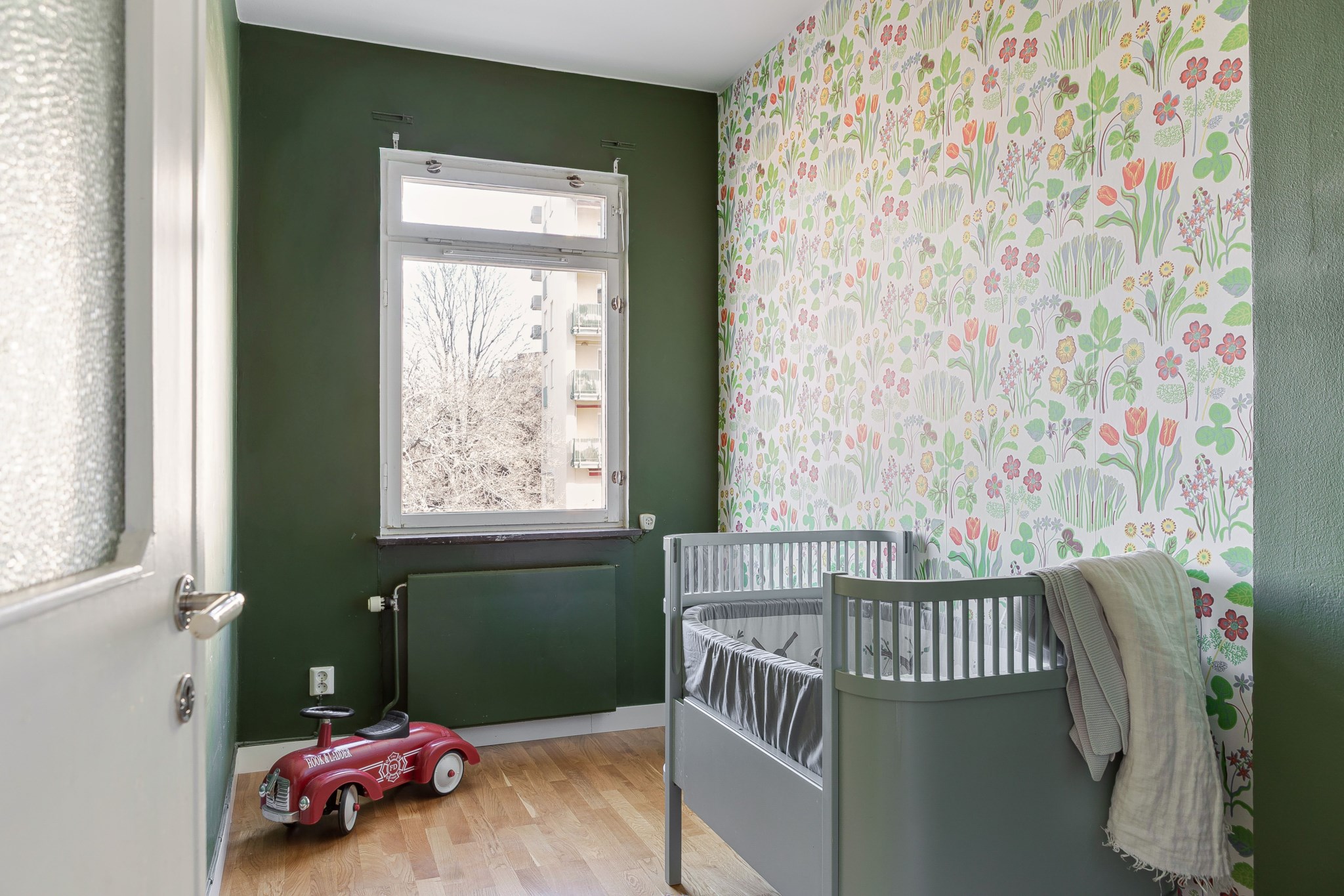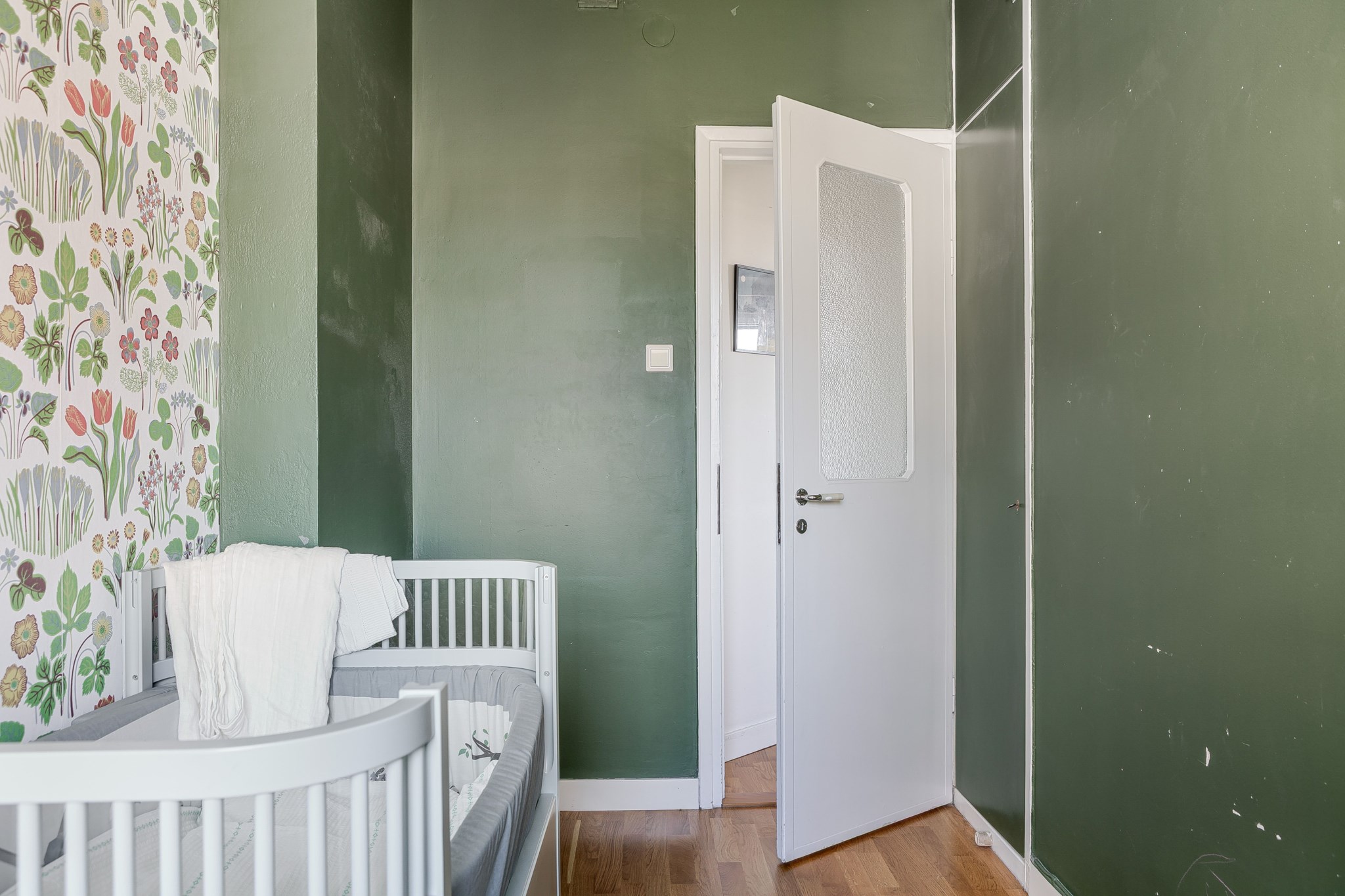 Mysigt sovrum med plats för säng och övrigt möblemang efter behov. Inkommande ljus från fint fönster. Målade ytskikt kombinerat med tapet och parkettgolv.