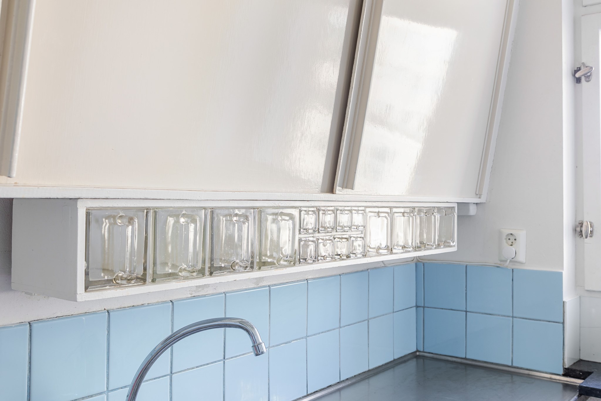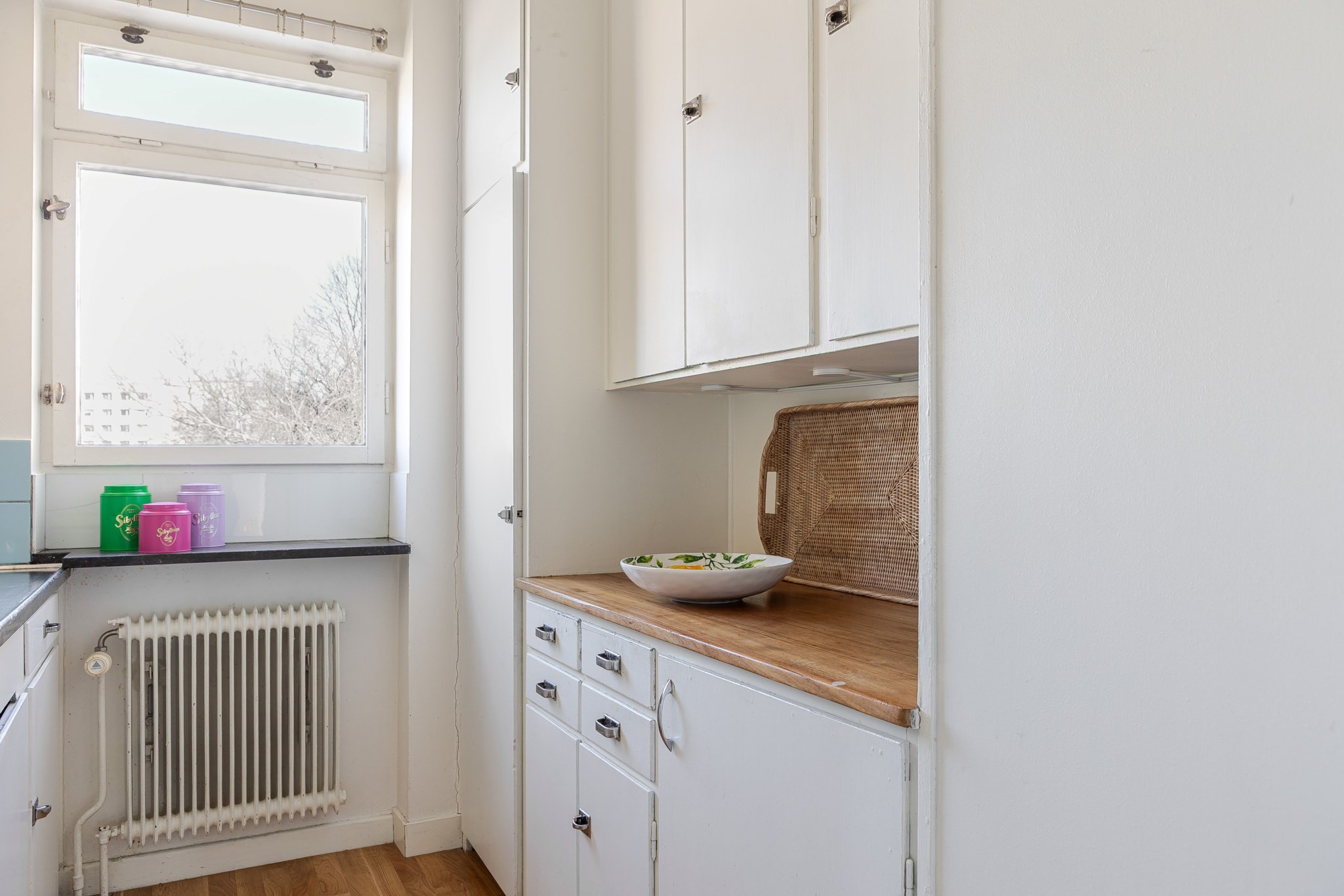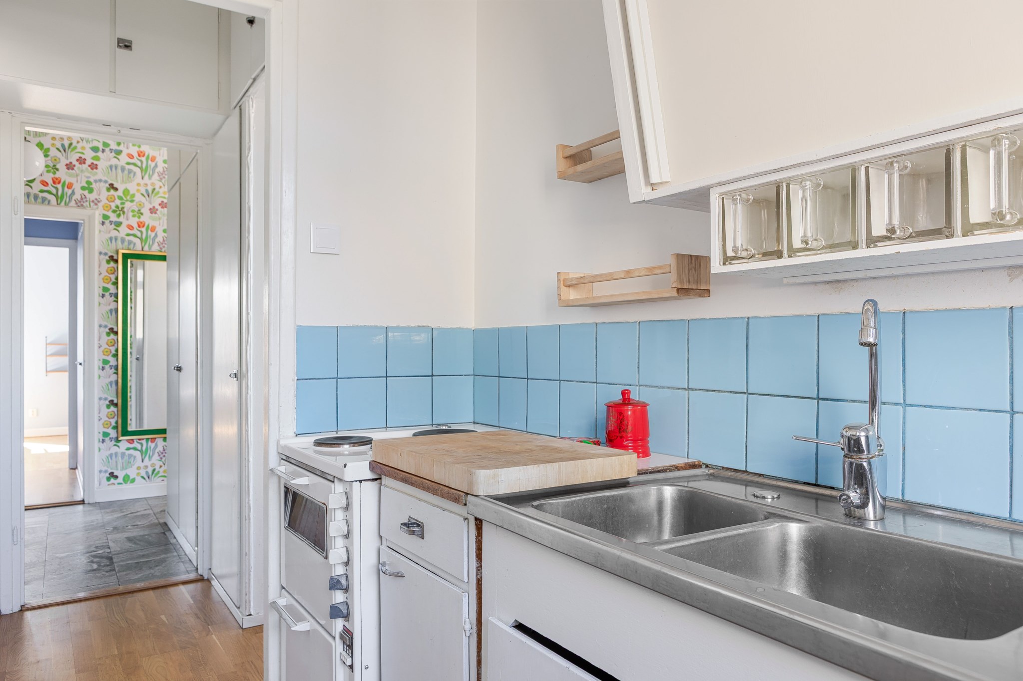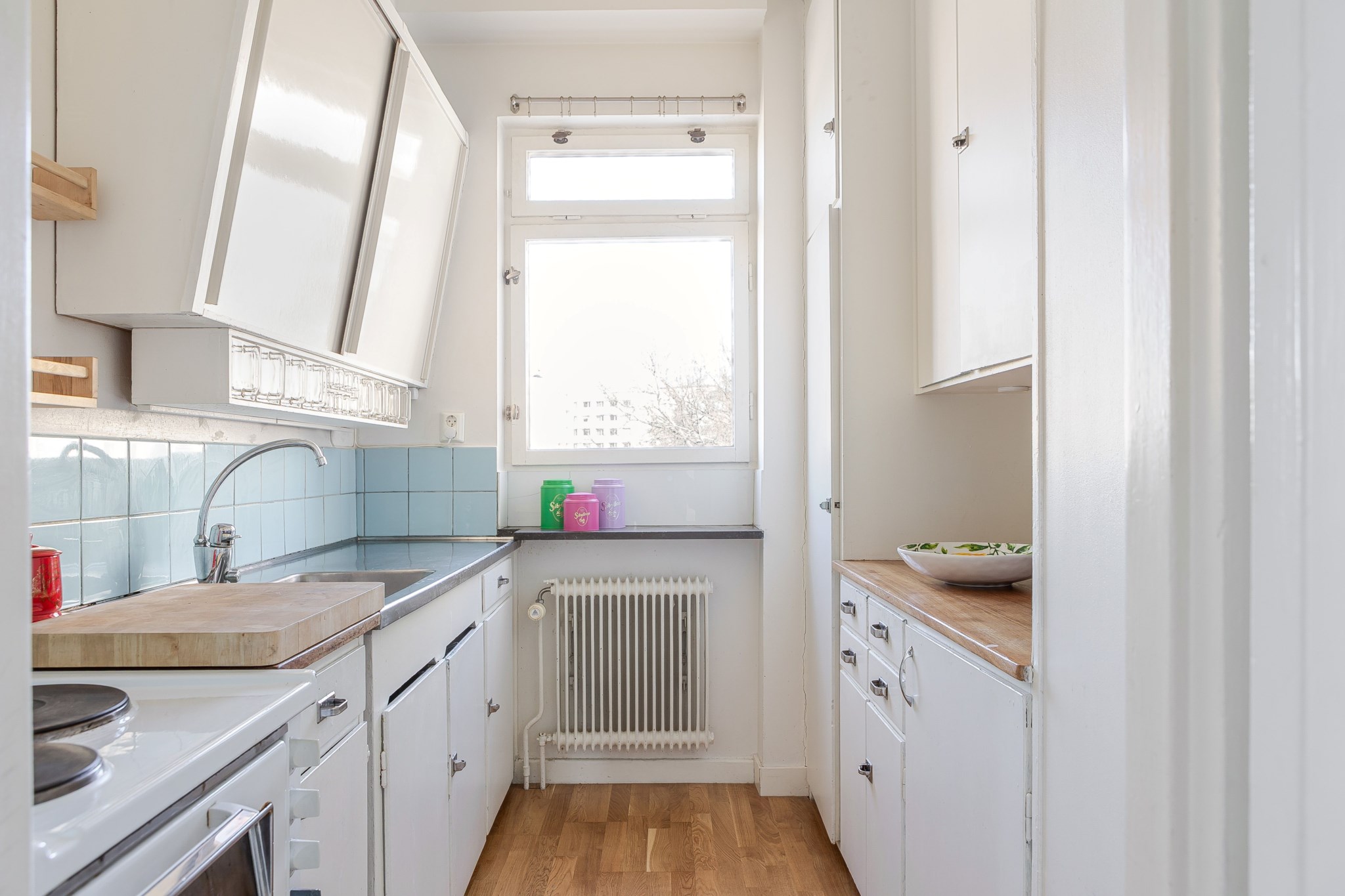 Ljust kök med klassiska köksskåp och bevarad redahylla. Ljust, släta fronter med tidstypiska beslag kombineras med arbetsbänkar i både trä och rostfritt stål. Kaklad väggpanel och fint ljusinsläpp från fönster. Kökets maskinella utrustning består av spis och ugn. Ljusmålade ytskikt och ljust golv.
