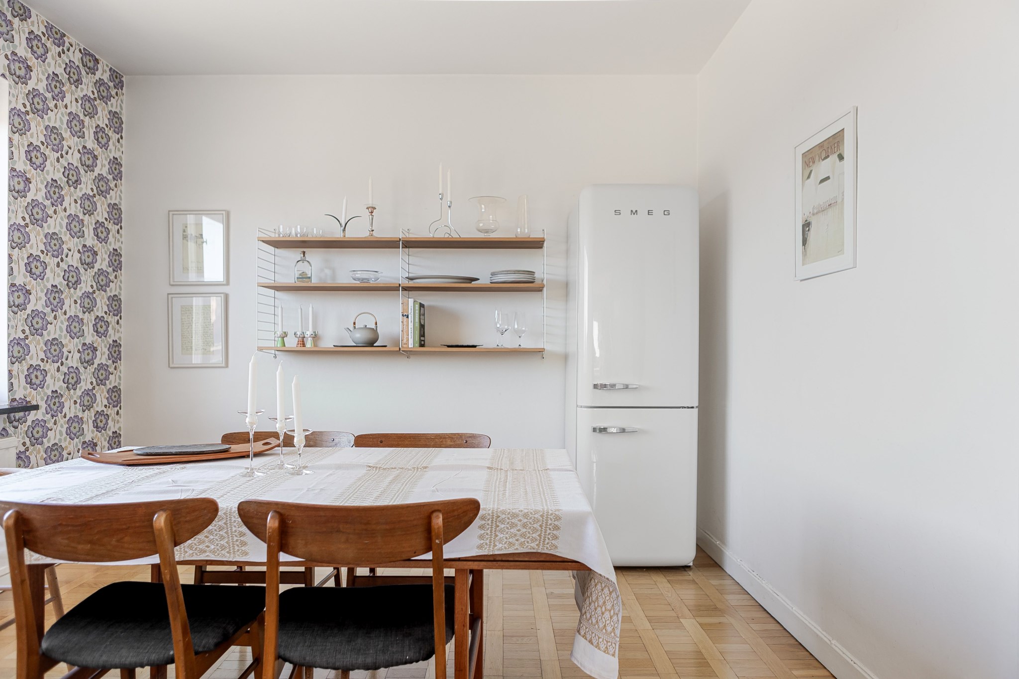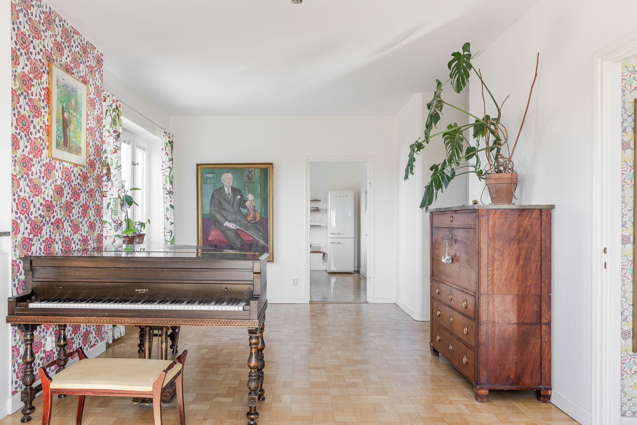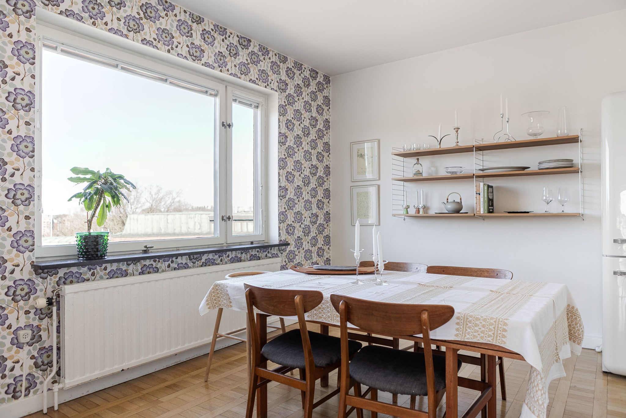 Matrum med plats för bord och stolar samt kyl placerad i rummet. Generöst ljusinsläpp från stort fönster. Rummet kan med fördel även nyttjas som sovrum vid behov. Ljusmålade ytskikt kombinerat med tapet samt parkettgolv.