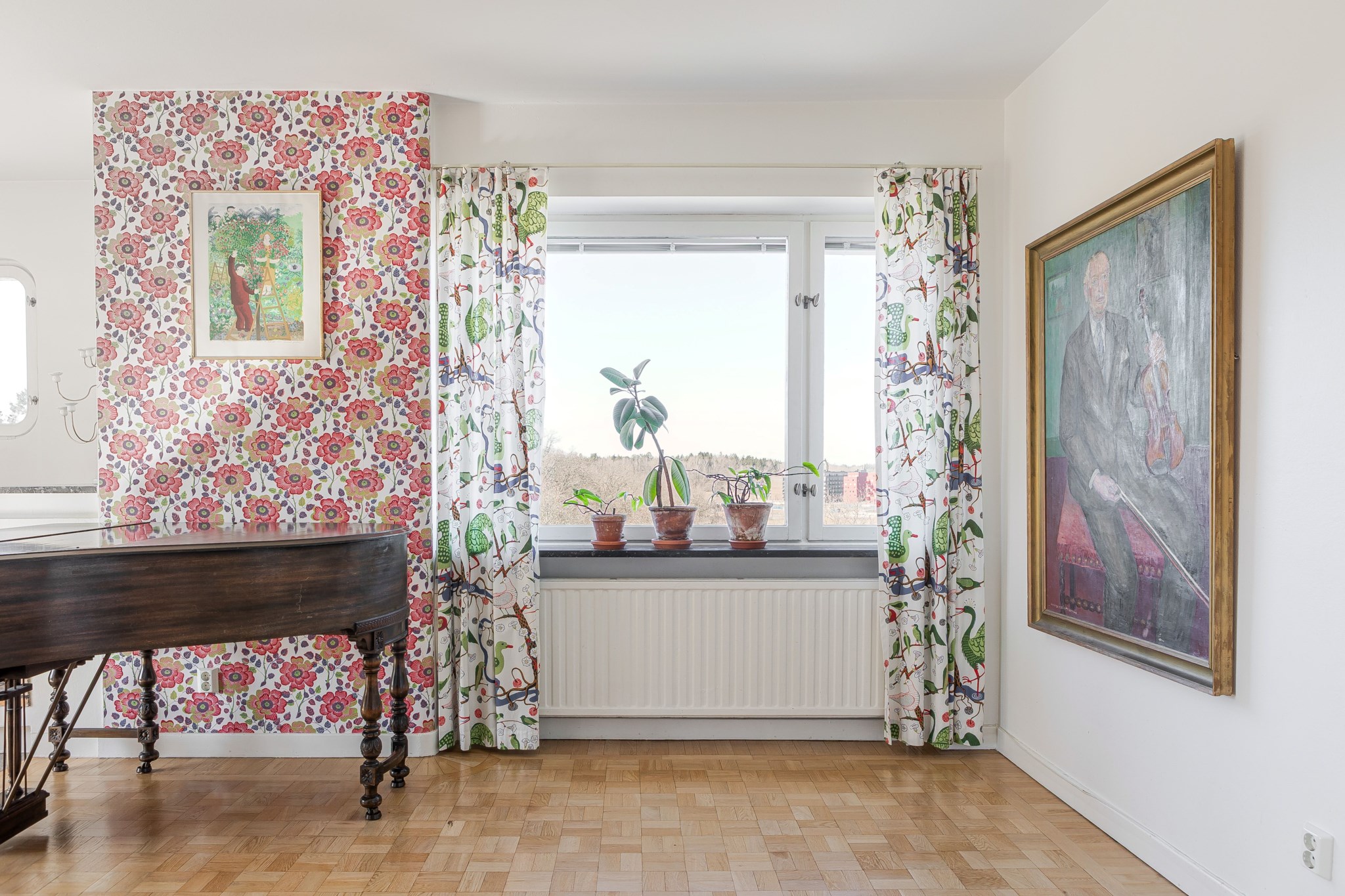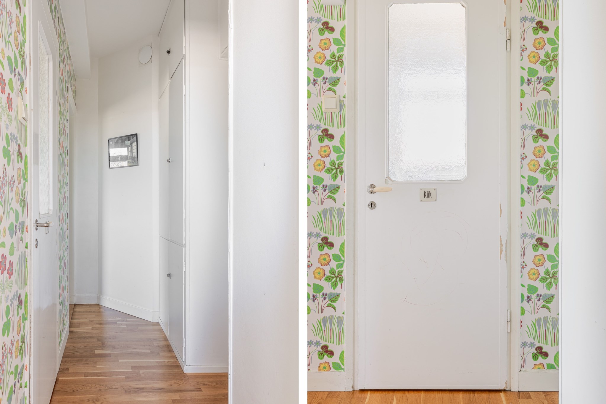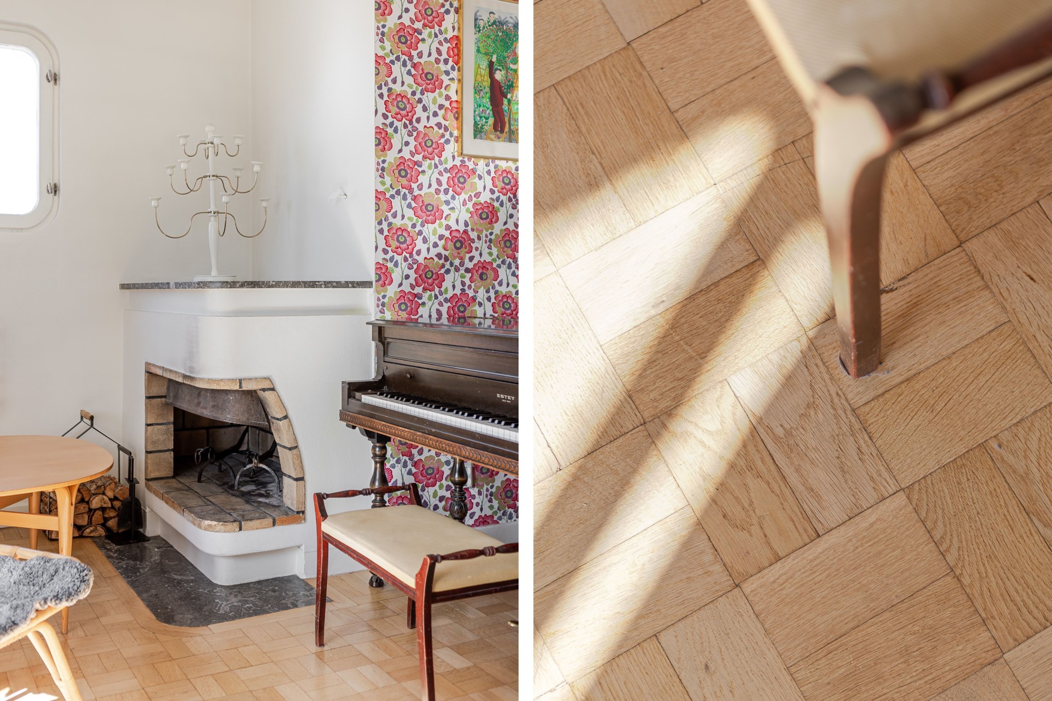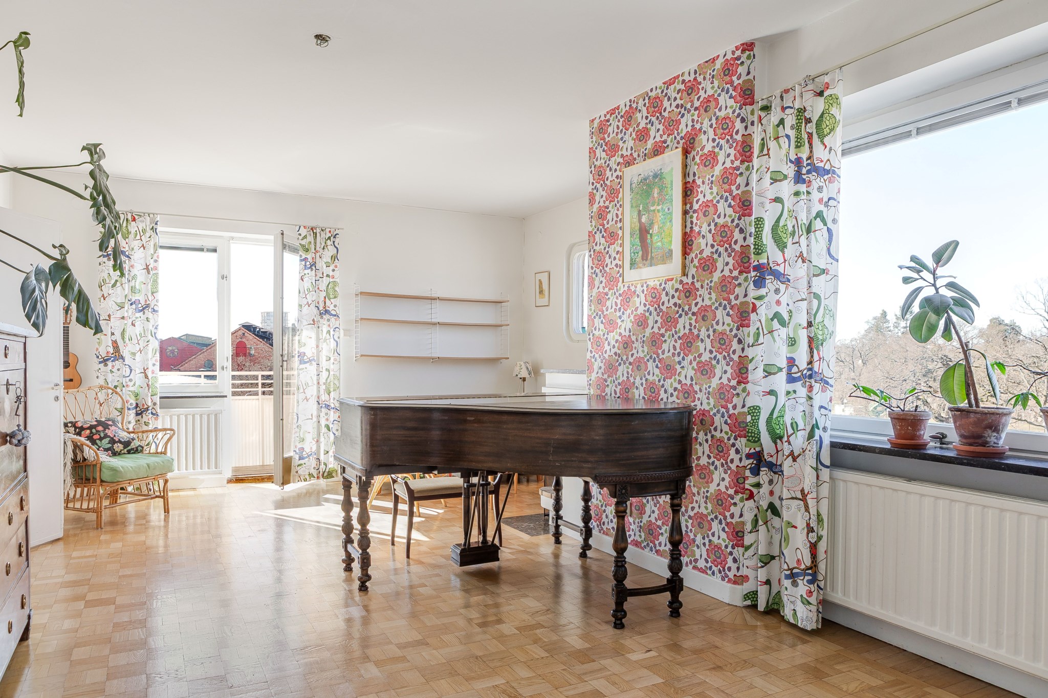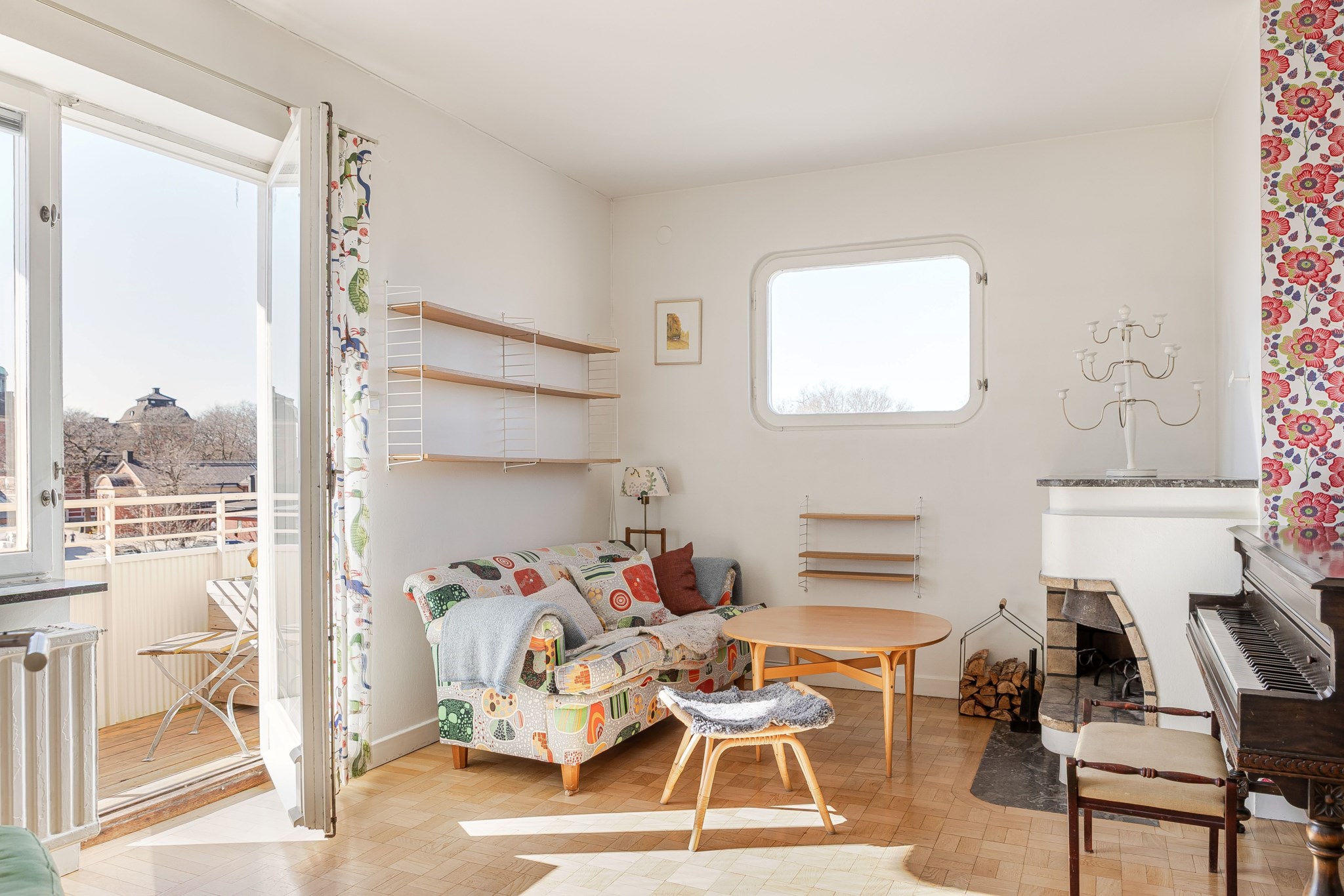 Trivsamt och luftigt vardagsrum med en mysig öppen spis som skapar en varm och inbjudande atmosfär. Rummet erbjuder plats för både soffgrupp och matplats samt övrigt möblemang efter behov och smak. Från vardagsrummet nås den soliga balkongen som under de varmare månaderna blir en naturlig förlängning av rummet. Ljusmålade ytskikt kombinerat med tapet samt parkettgolv.