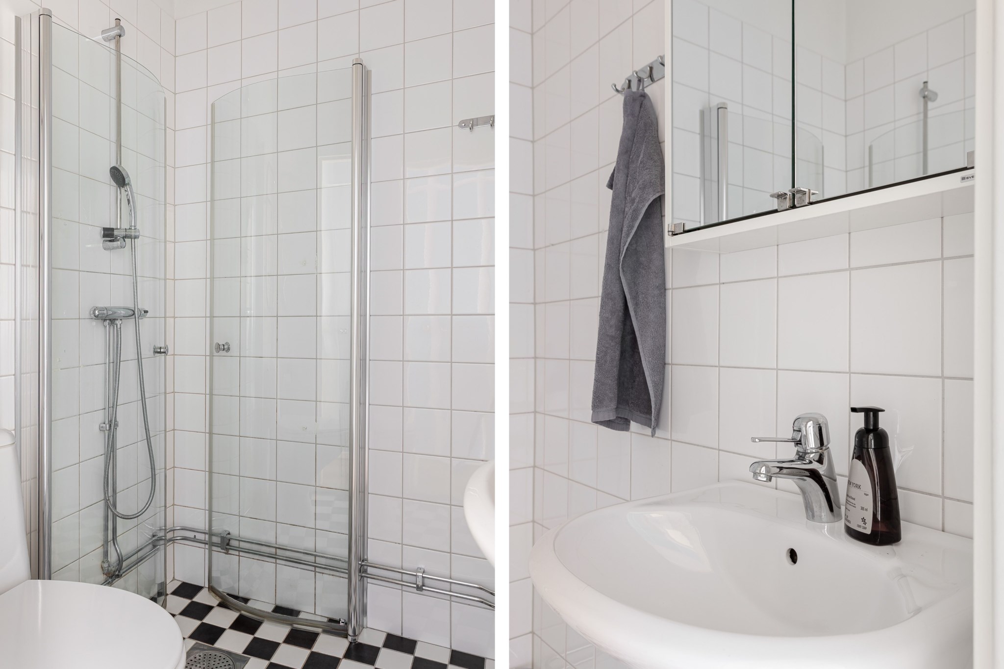 Helkaklat badrum inrett med wc, handfat, spegelskåp samt dusch med infällbara duschväggar i klarglas.