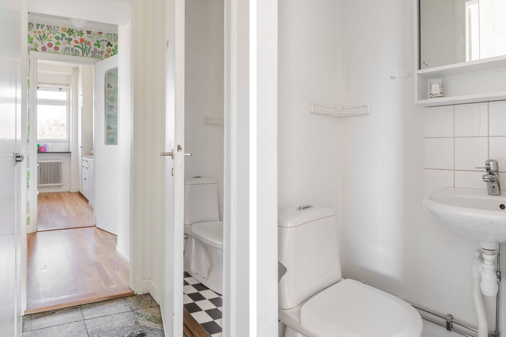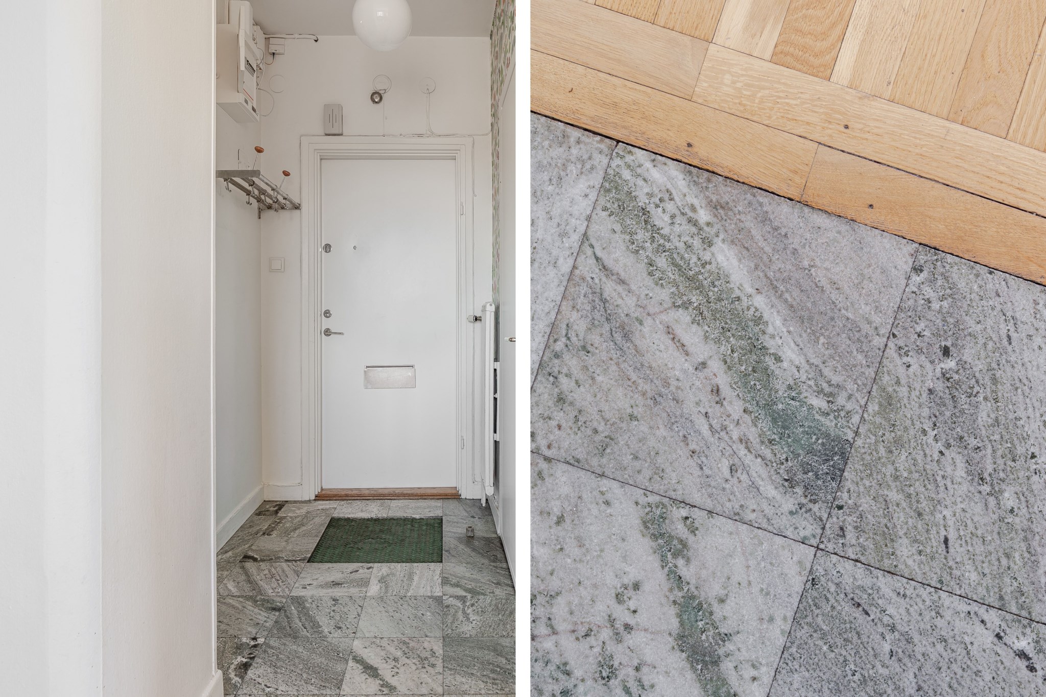 Välkomnande hall med plats för avhängning av ytterkläder och skor på hatthylla direkt intill ytterdörren. Ljusmålade ytskikt och vackert stengolv som sedan övergår i parkett.