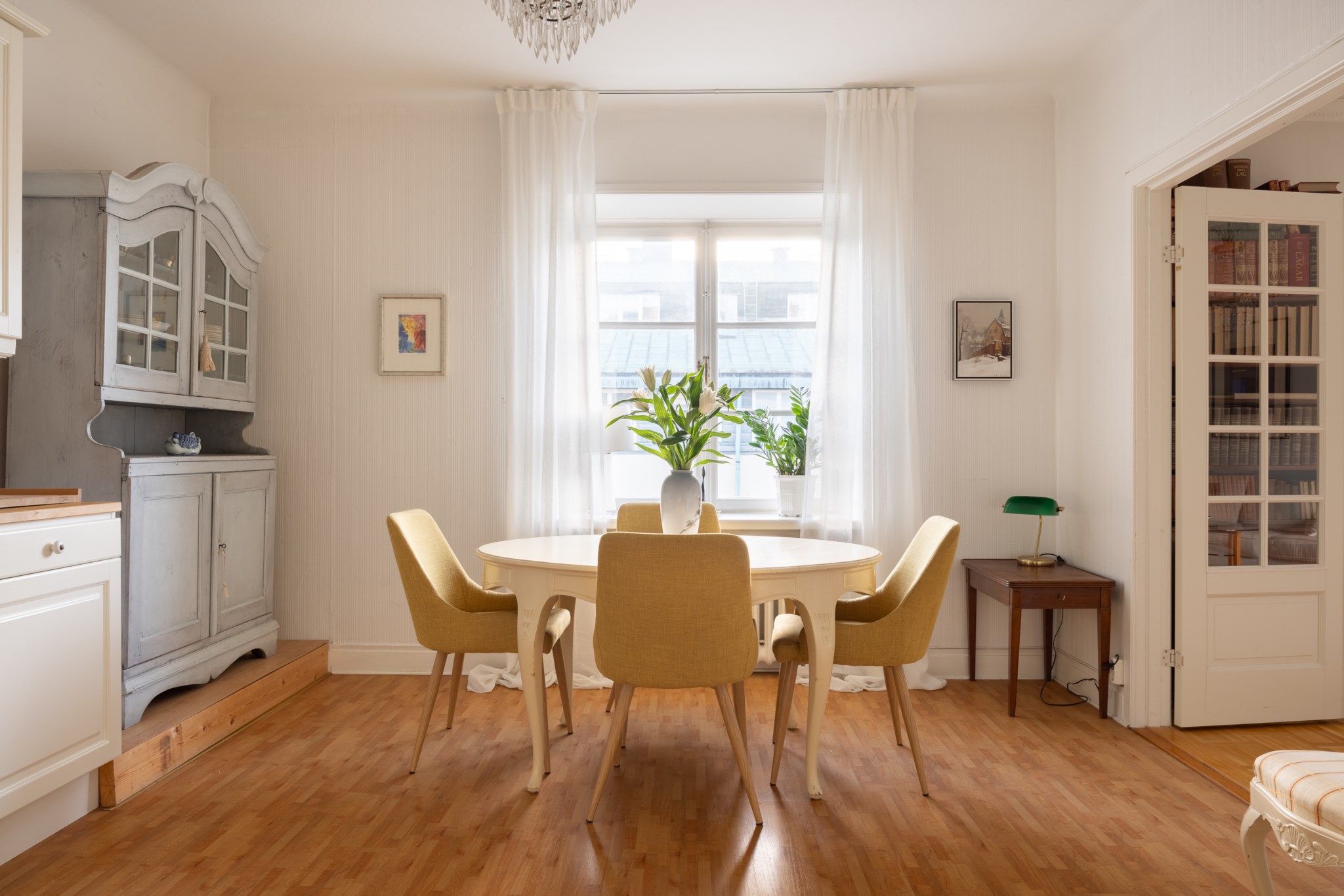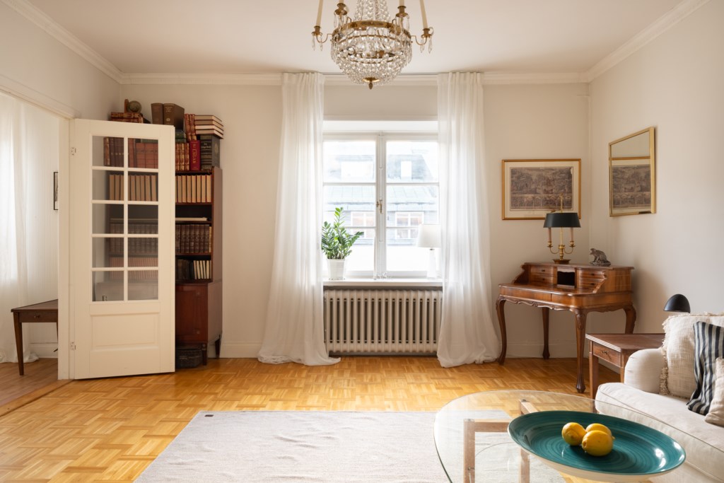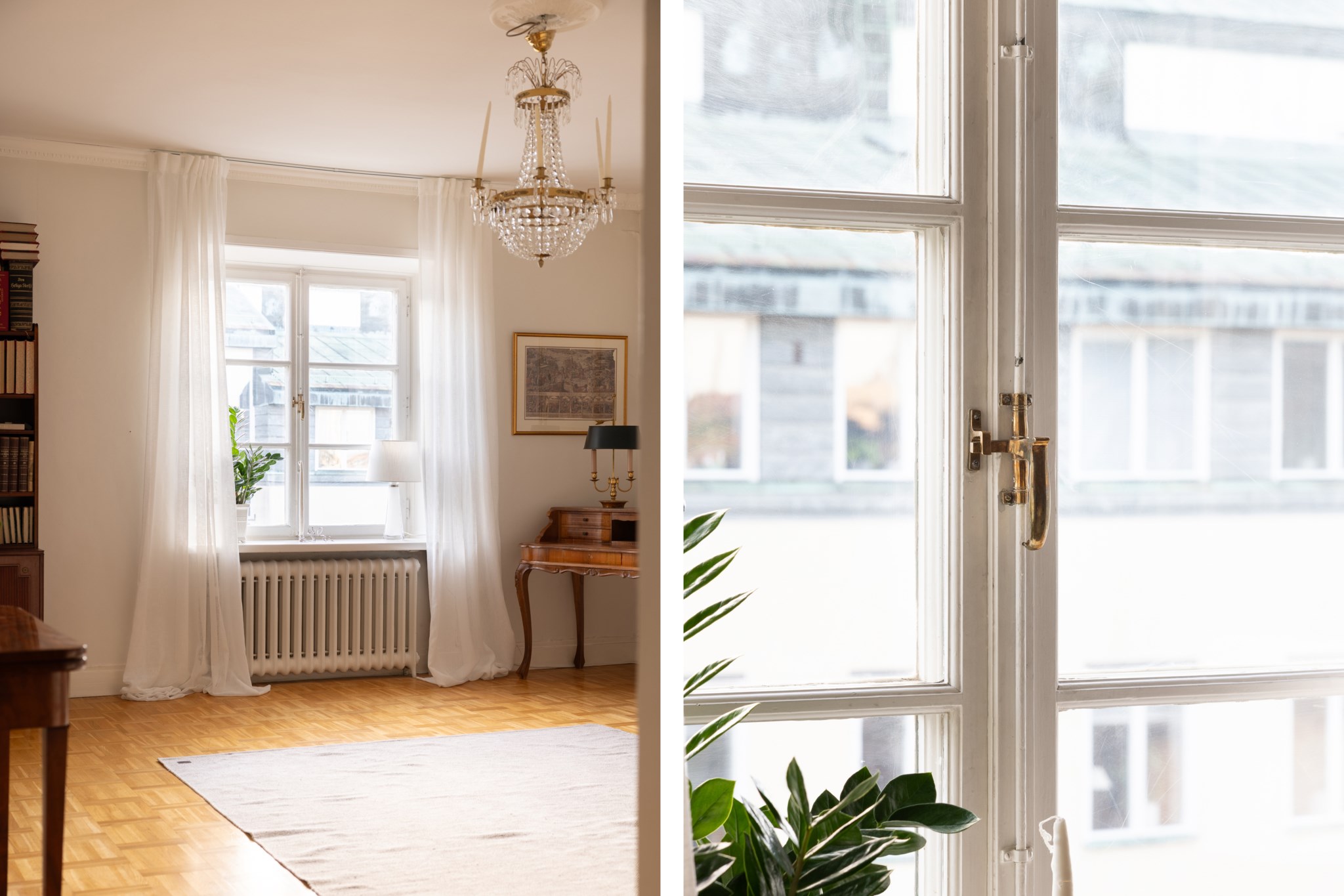 Elegant 20-talsvåning med spröjsade fönster, stora sällskapsytor och lugnt gårdsläge