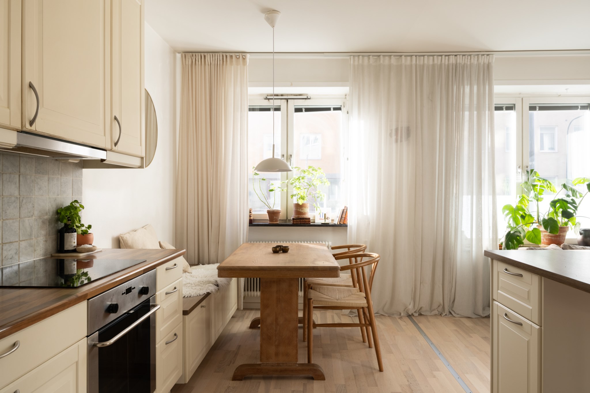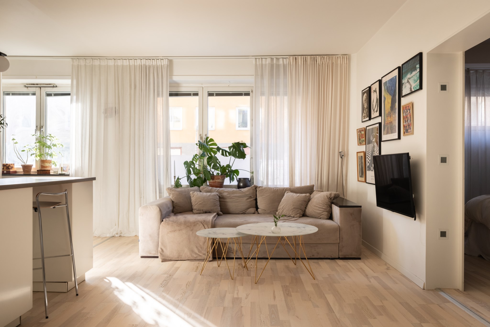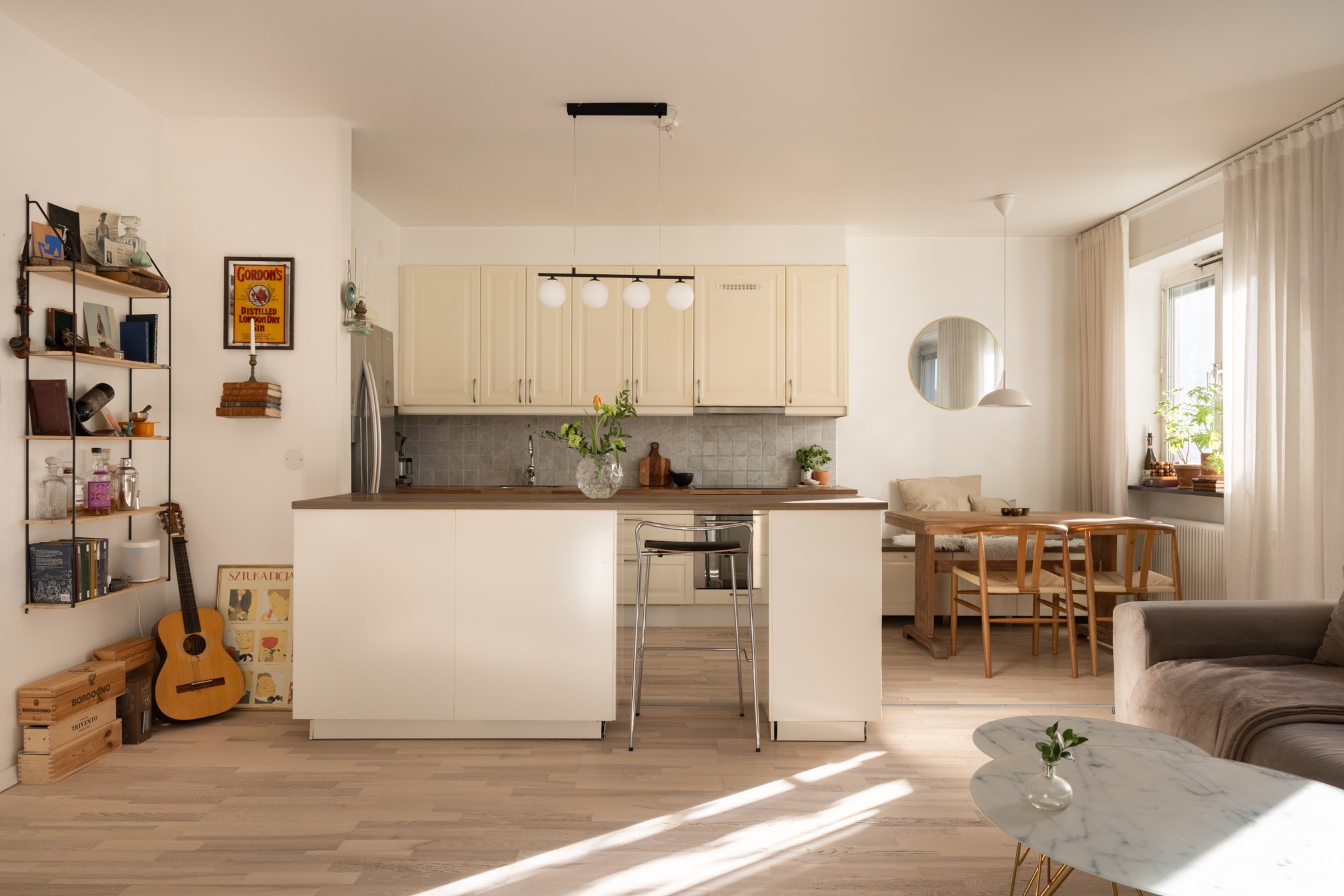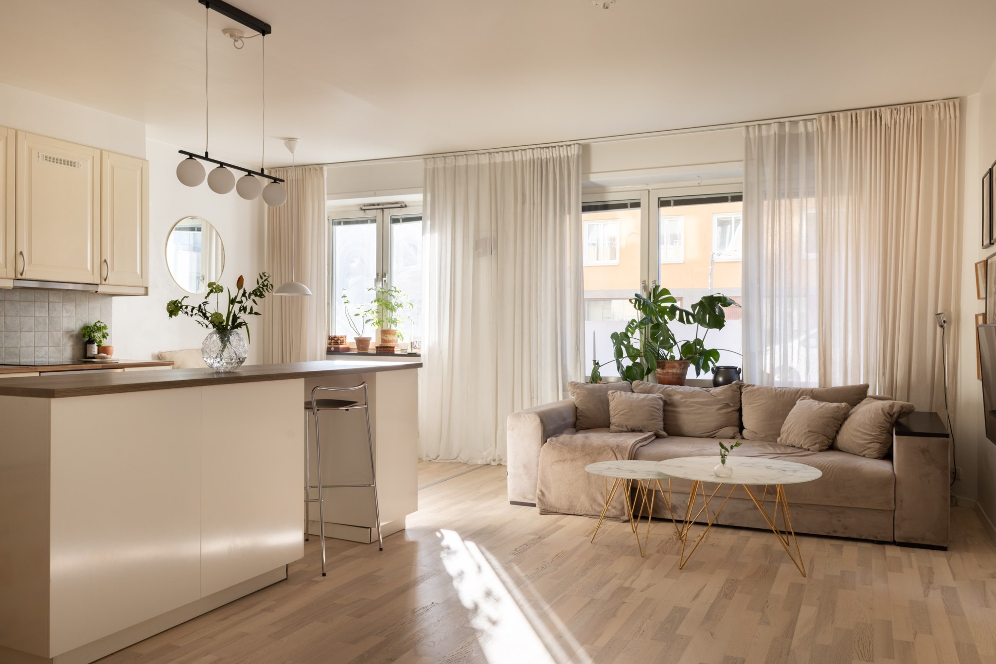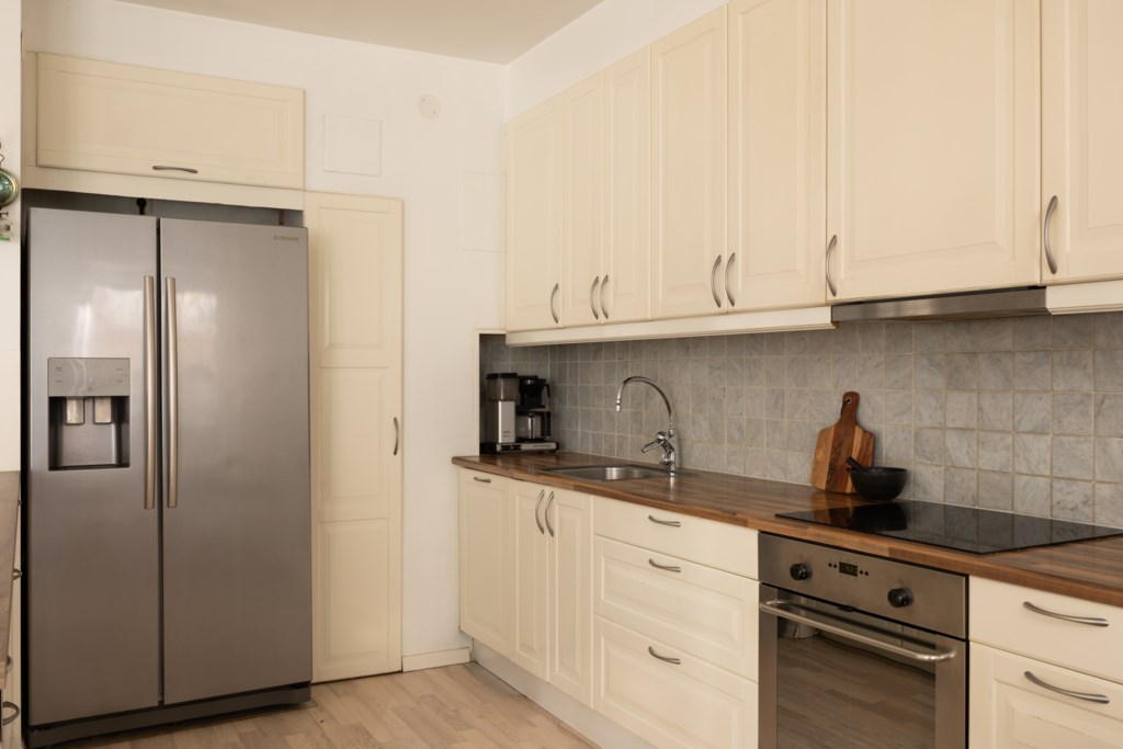 Det stilrent renoverade köket ligger öppet mot vardagsrummet och skapar en naturlig samlingspunkt med gott om plats för både matbord och umgänge. Planlösningen är social och inbjudande, samtidigt som bostaden upplevs lugn och behaglig.