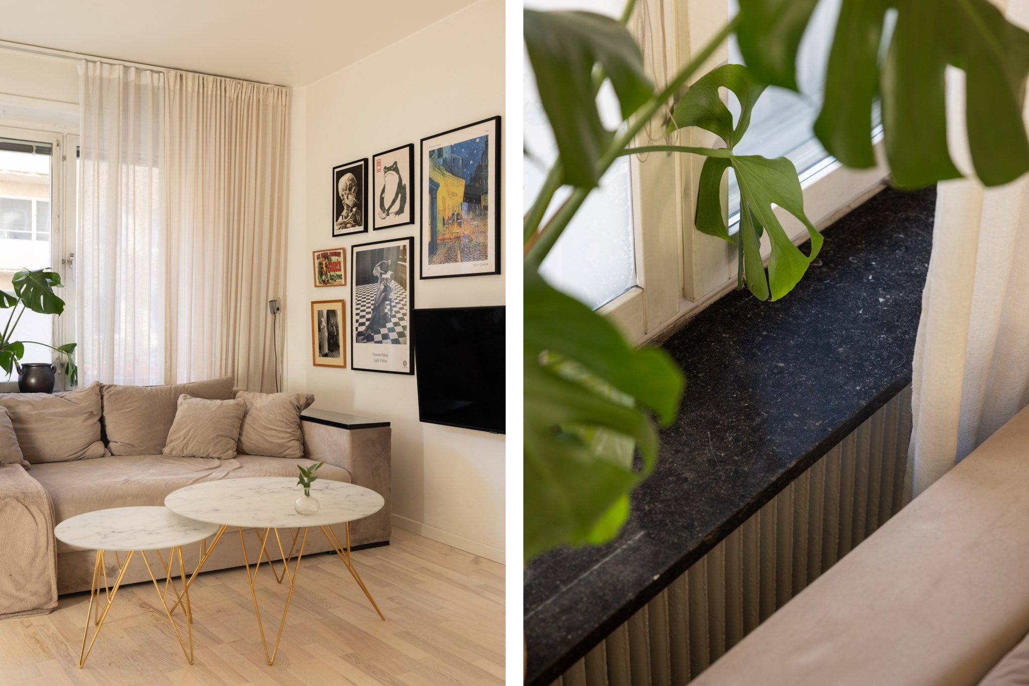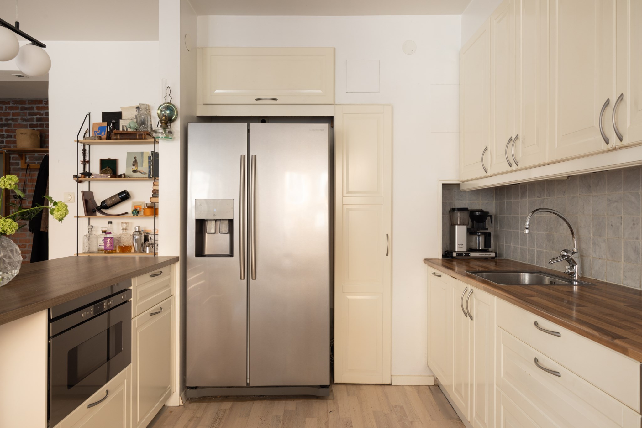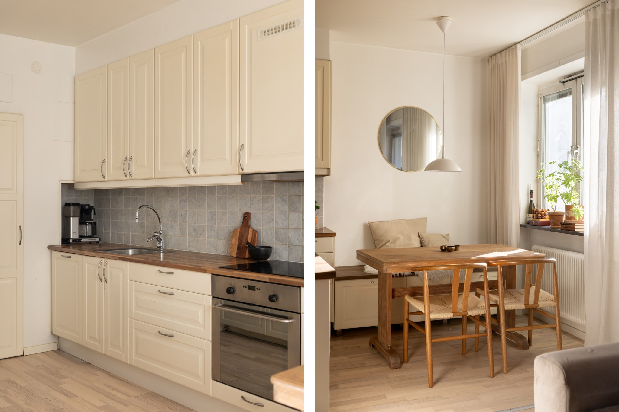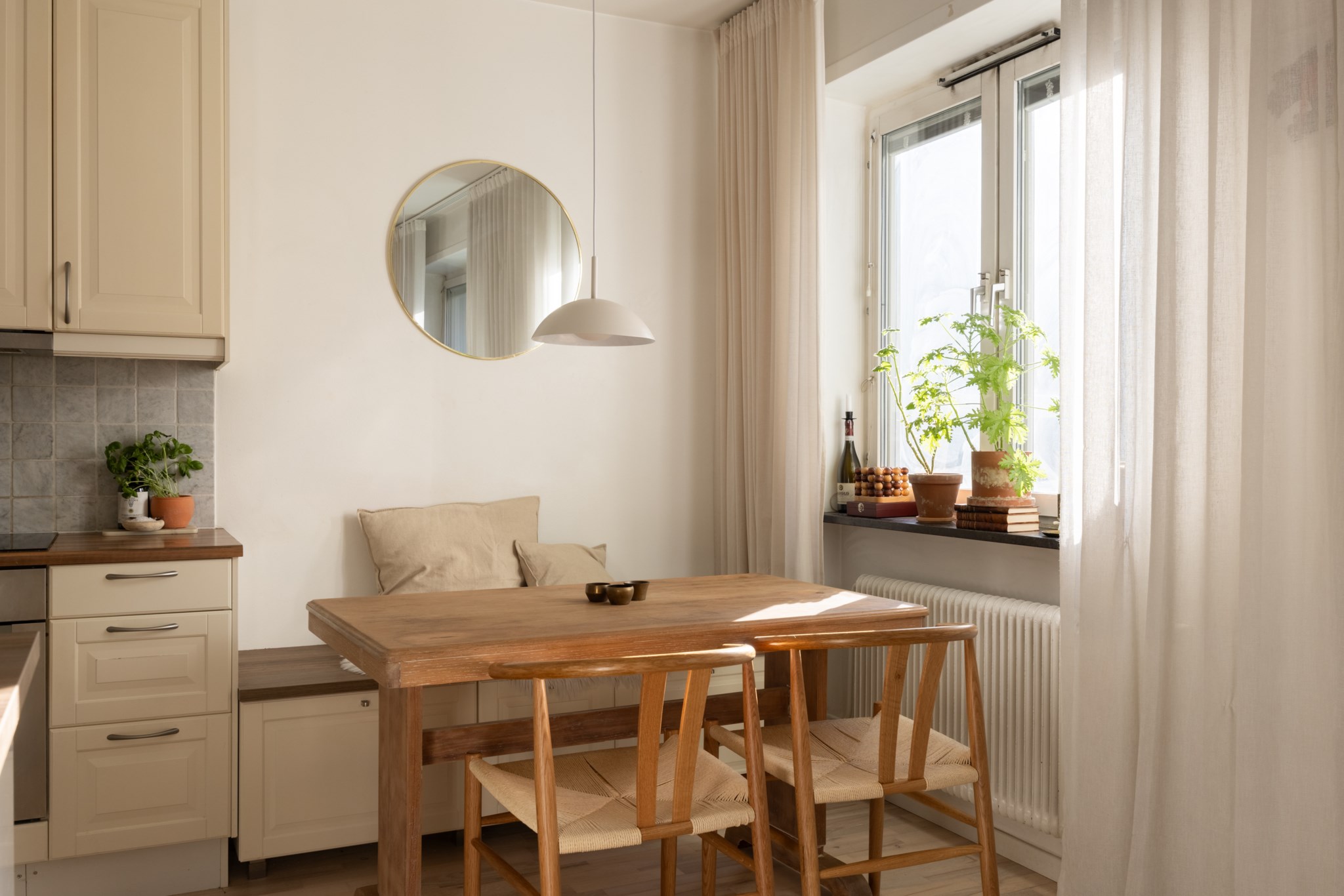 Det stilrent renoverade köket ligger öppet mot vardagsrummet och skapar en naturlig samlingspunkt med gott om plats för både matbord och umgänge. Planlösningen är social och inbjudande, samtidigt som bostaden upplevs lugn och behaglig.