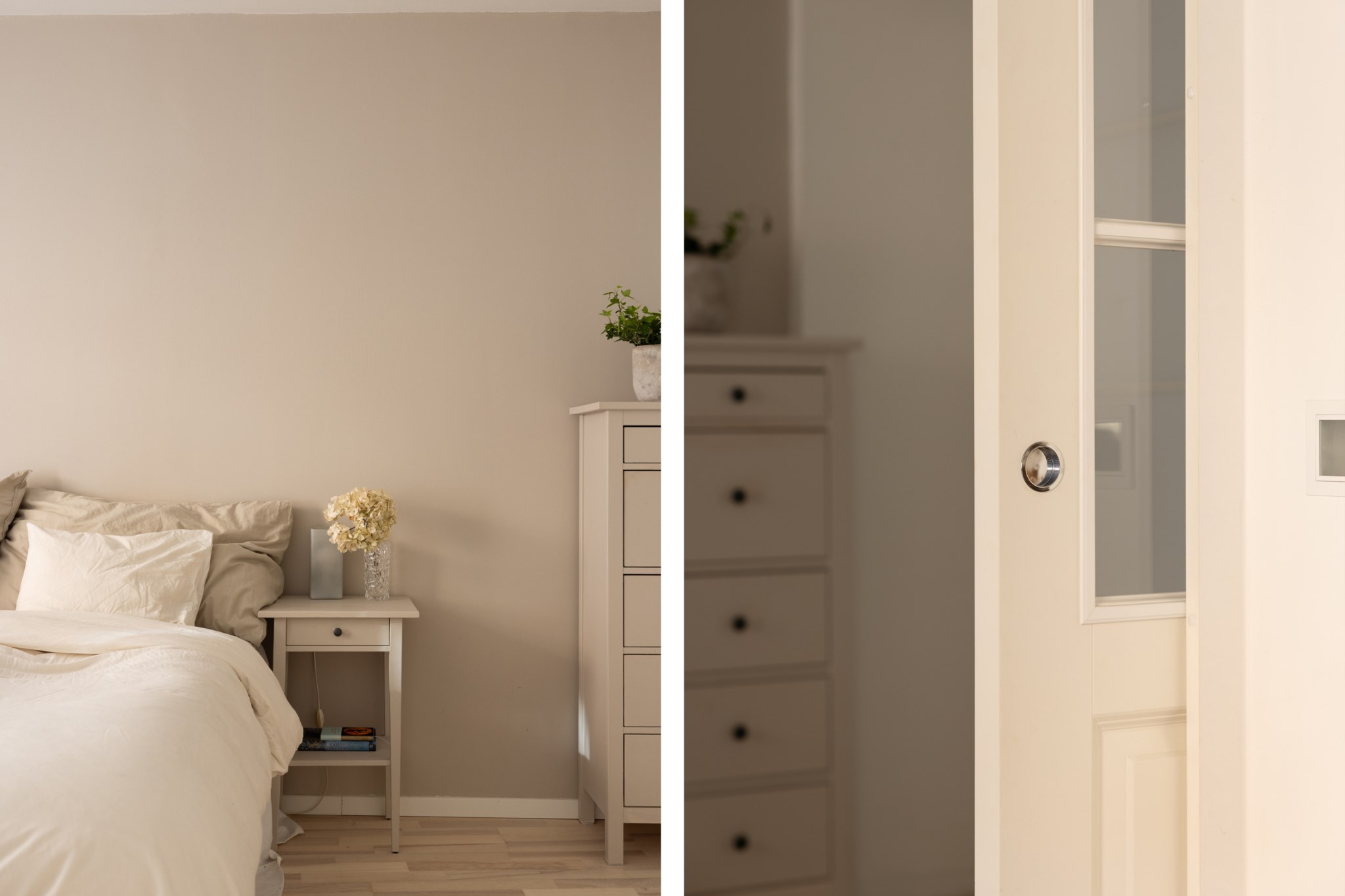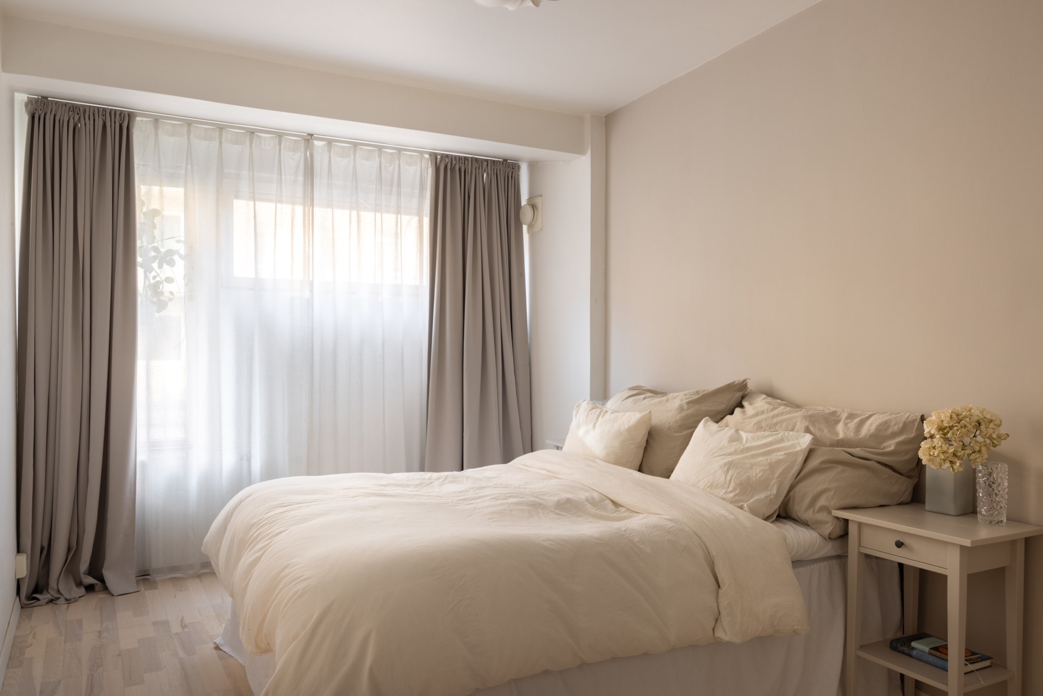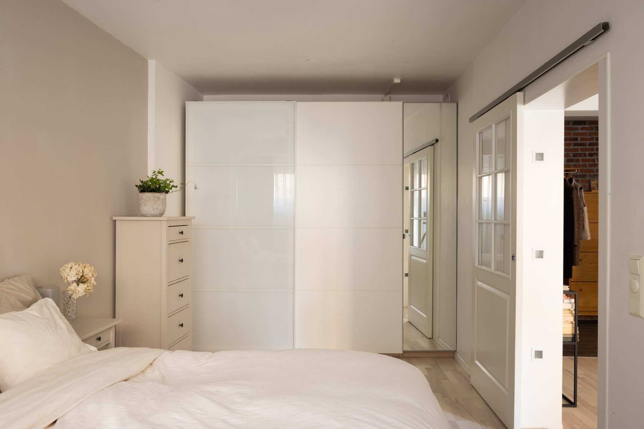 Sovrum med ljusa väggar och harmoniska färger. Naturligt ljusinsläpp från fönster. Längs ena väggen finns plats för garderob med förvaring. Rummet rymmer säng och sängbord.