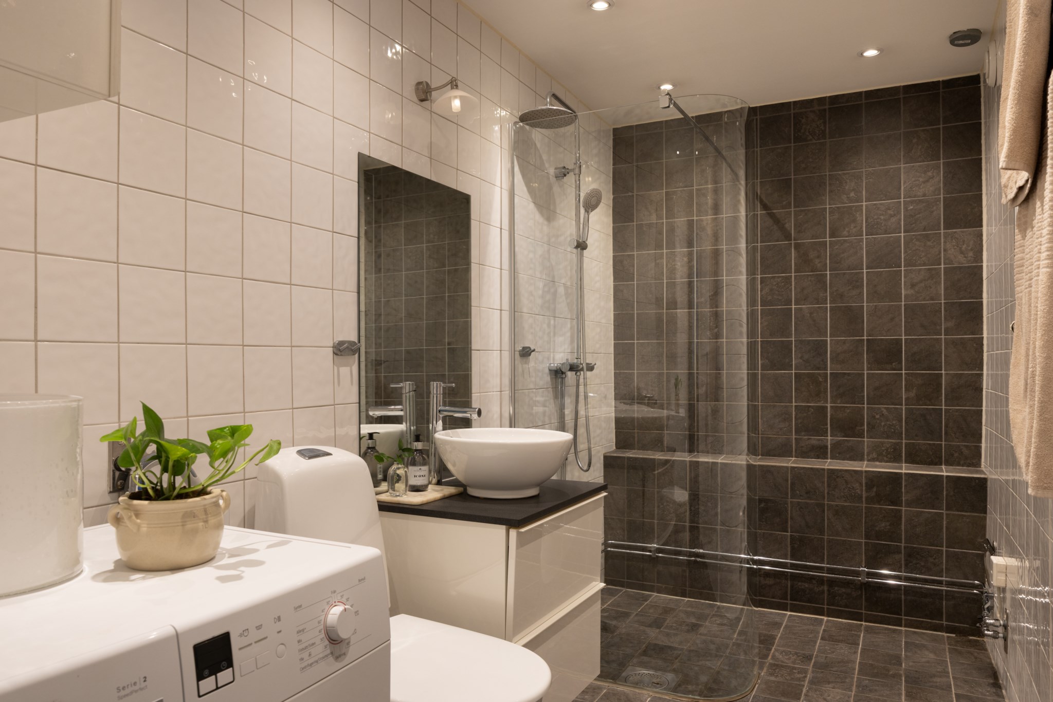 Från hallen nås ett fräscht helkaklat badrum i mörka och ljusa kulörer. Badrummet är utrustat med takdusch med glasvägg, WC, handfat med kommod, spegel och tvättmaskin.
