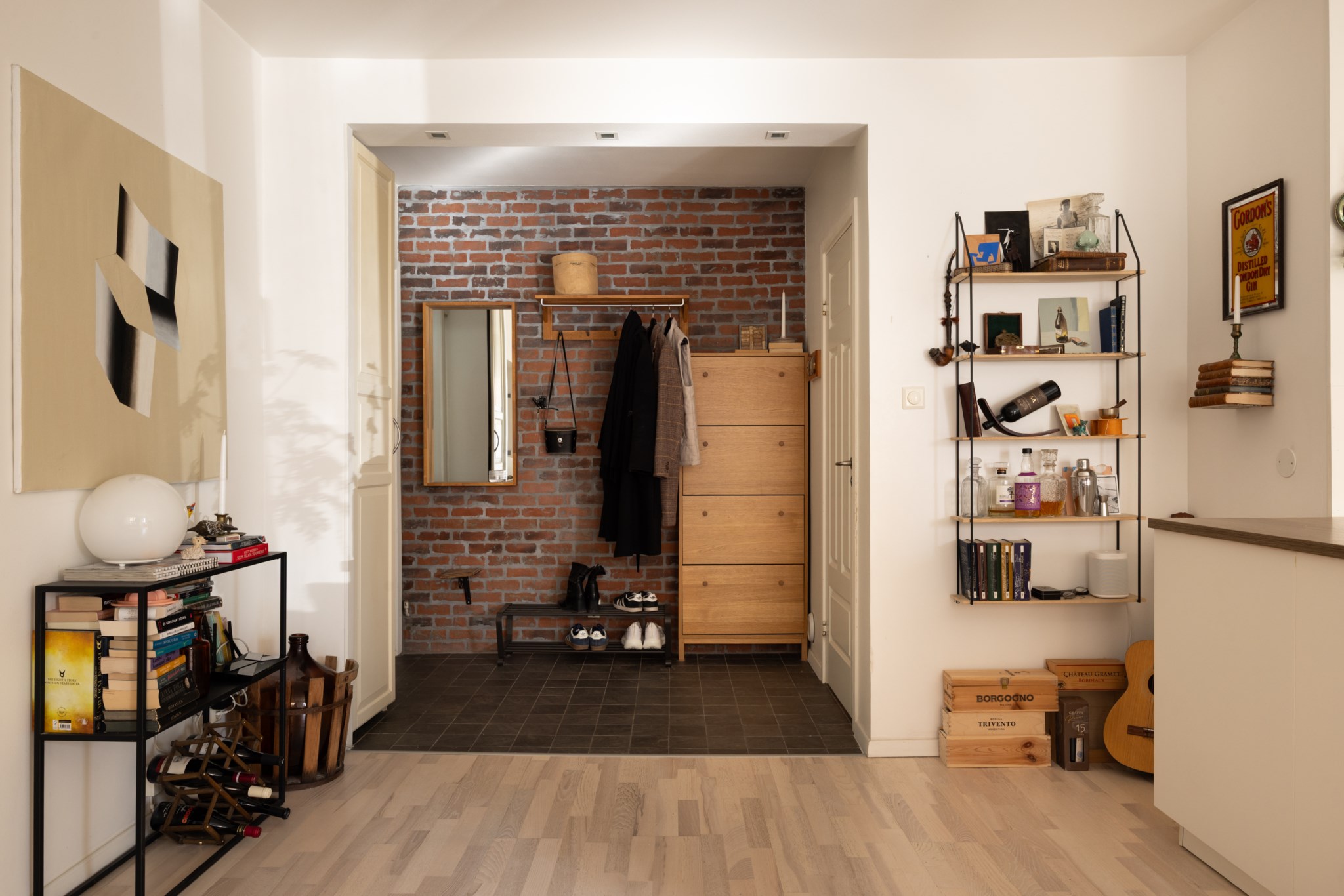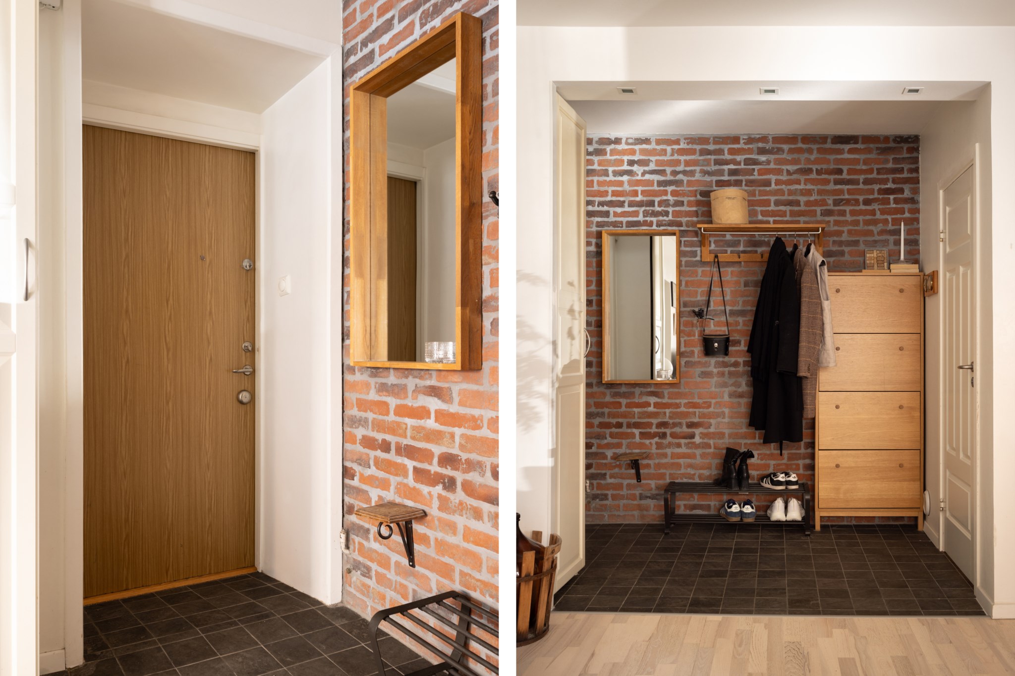Hall som leder vidare till lägenhetens sociala del och badrum. Mörkt golv och vägg i tegelstil. Plats för avhängning samt ytterligare möblemang.