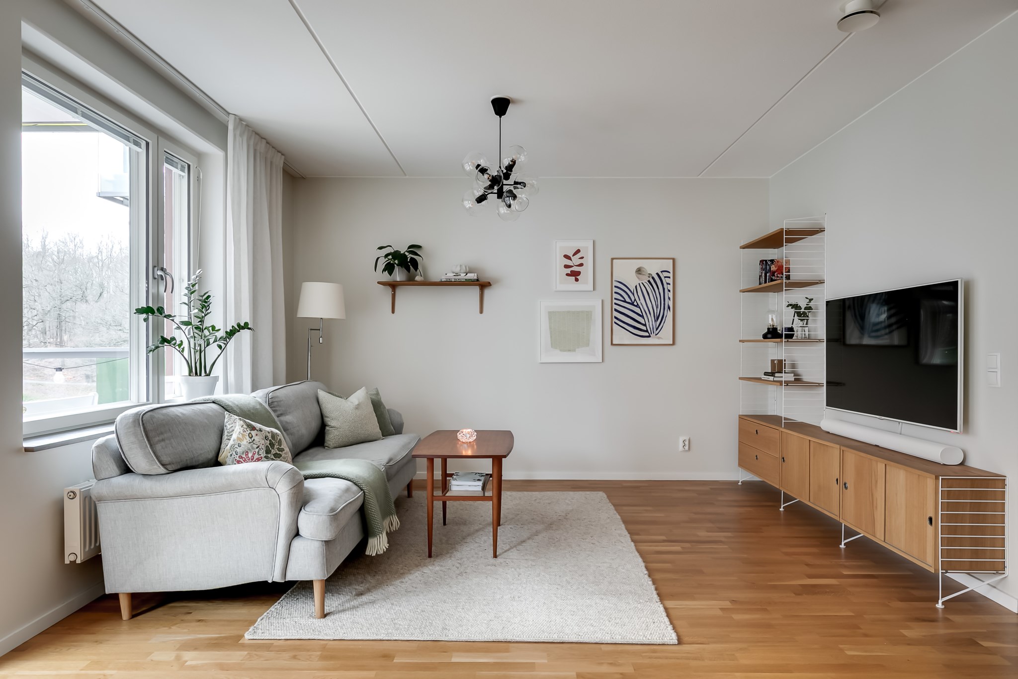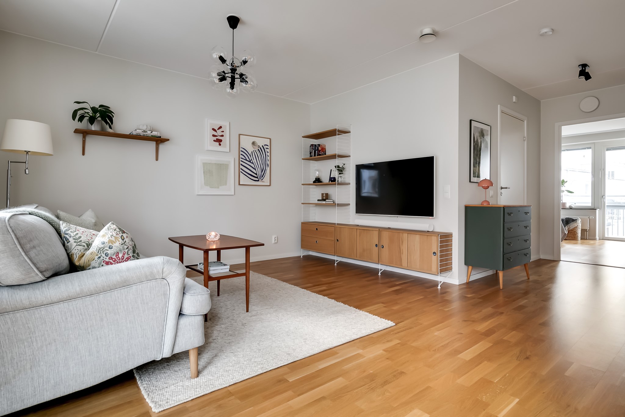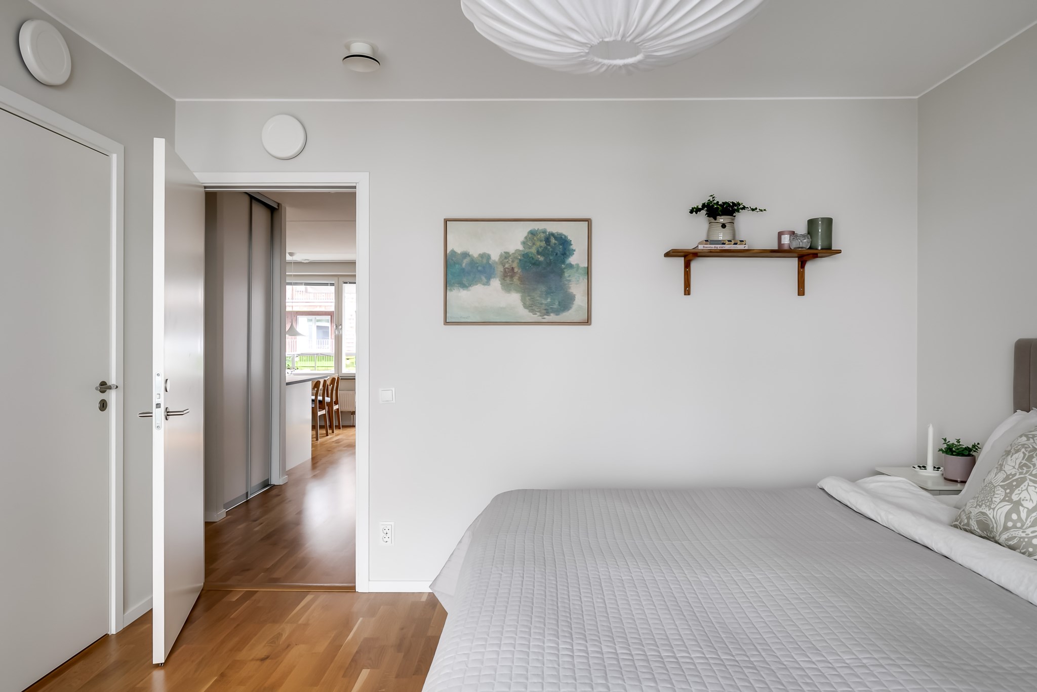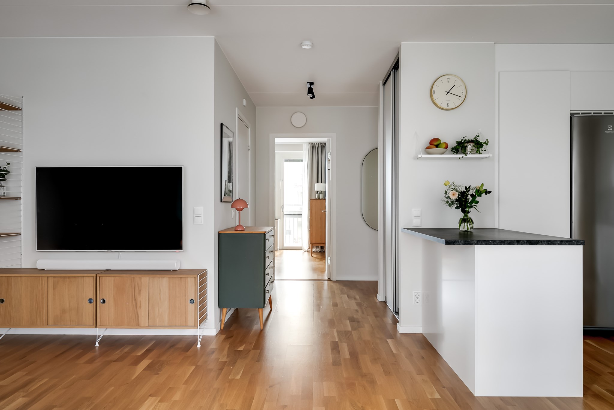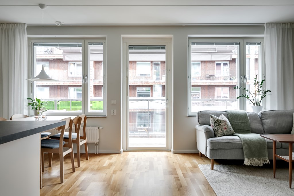 Trivsamt vardagsrum med generösa ytor som rymmer både soffgrupp och annan personlig inredning. Det stora fönsterpartiet, tillsammans med utgången till en av bostadens två balkonger, ger ett vackert ljusinsläpp och skapar en naturlig förlängning av rummet under årets varmare månader. Ljusmålade ytskikt och parkettgolv förstärker den öppna och inbjudande känslan.