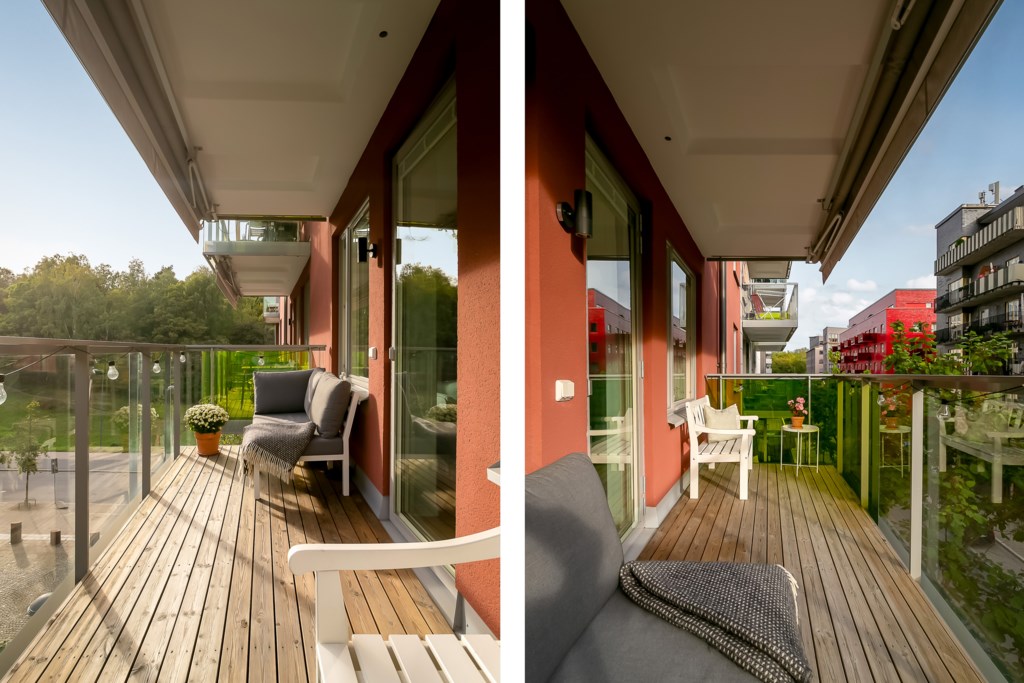 Med utgång från vardagsrummet nås en härlig balkong med stilrent glasräcke som skapar en luftig och öppen känsla. Här finns gott om plats för loungemöbler, växter och andra personliga inslag vilket ger fina möjligheter att skapa en trivsam och inbjudande utomhusoas.