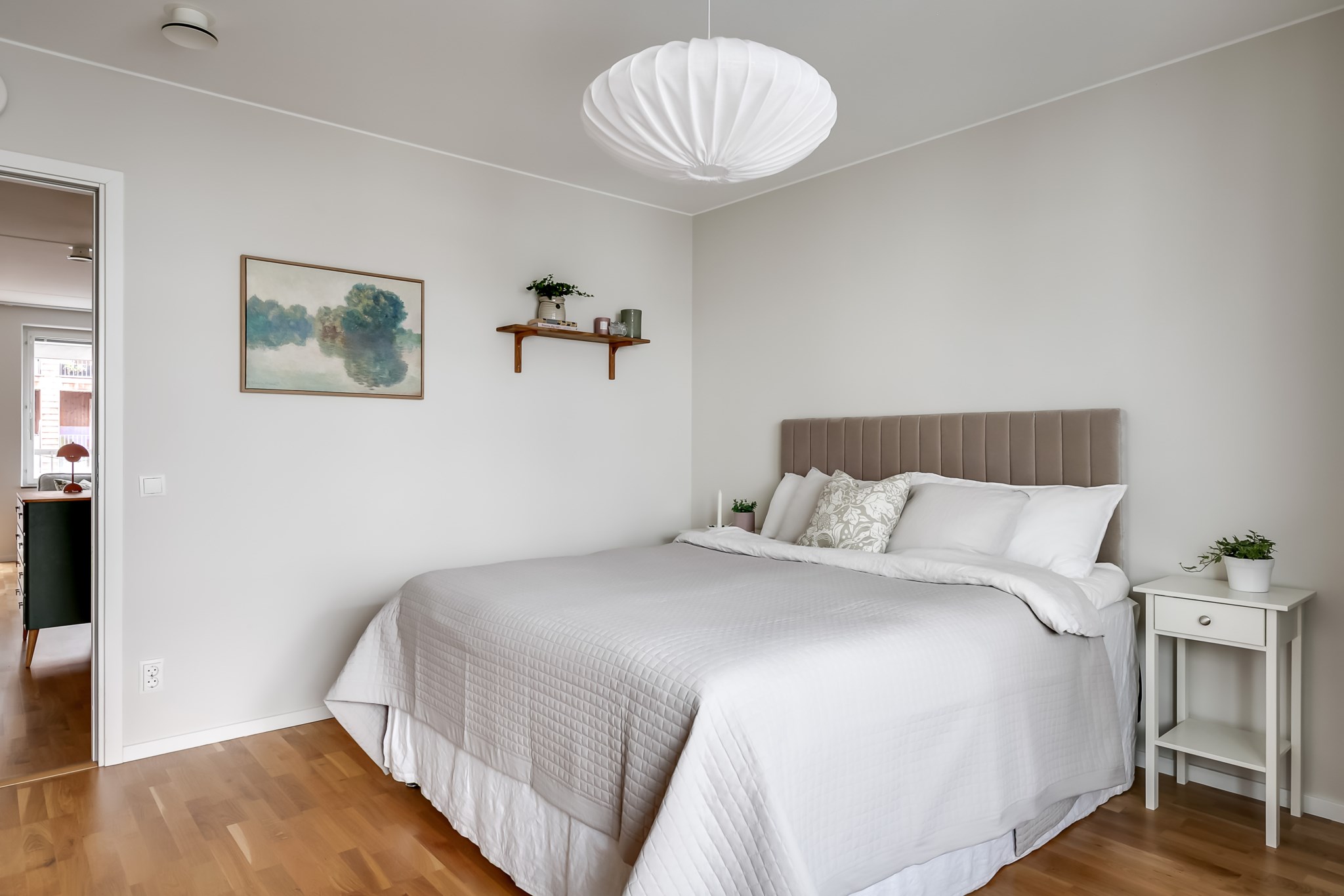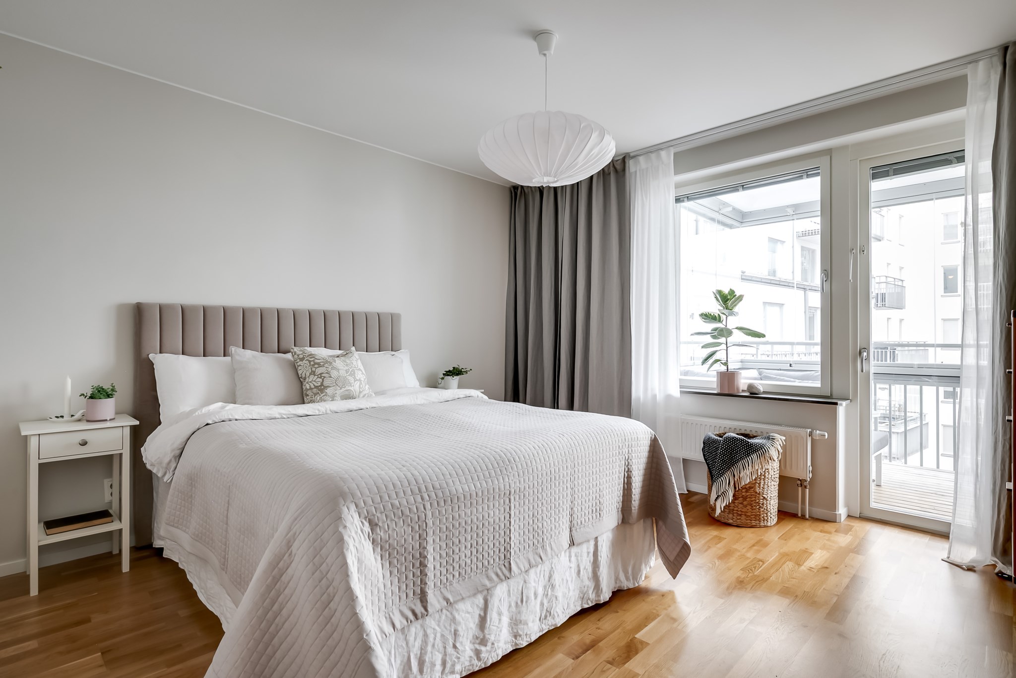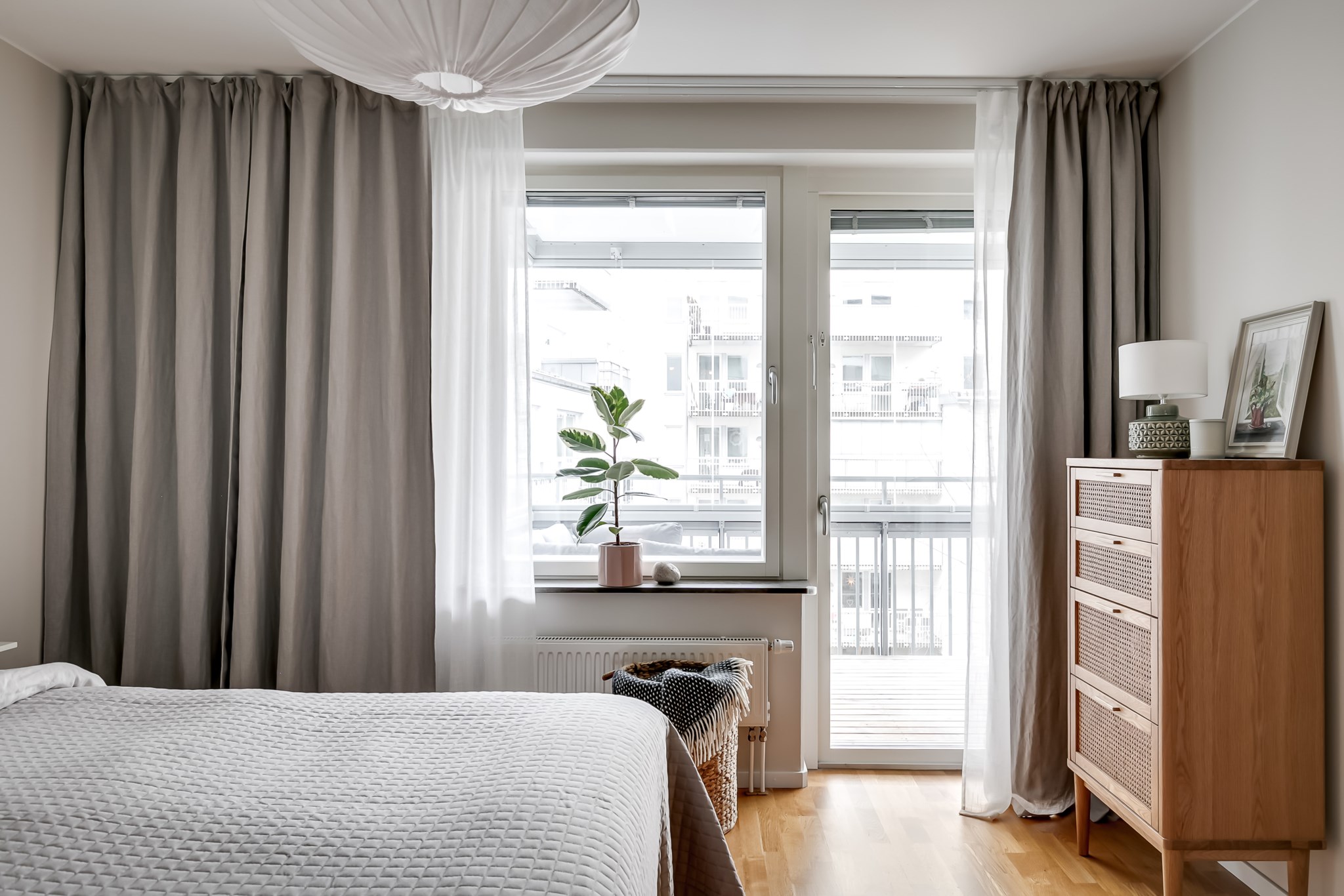 Rogivande sovrum med gott om plats för dubbelsäng och tillhörande sängbord. De generösa fönsterpartierna ger ett fint ljusinsläpp och leder direkt ut till den trivsamma, inglasade balkongen med utsikt mot den lugna innergården - en perfekt förlängning av rummet under stora delar av året. Här finns även möjlighet att komplettera med garderob eller annan förvaringsmöbel efter behov. Tillhörande klädkammare ger praktisk och lättillgänglig förvaring. Ljusmålade ytskikt och parkettgolv.