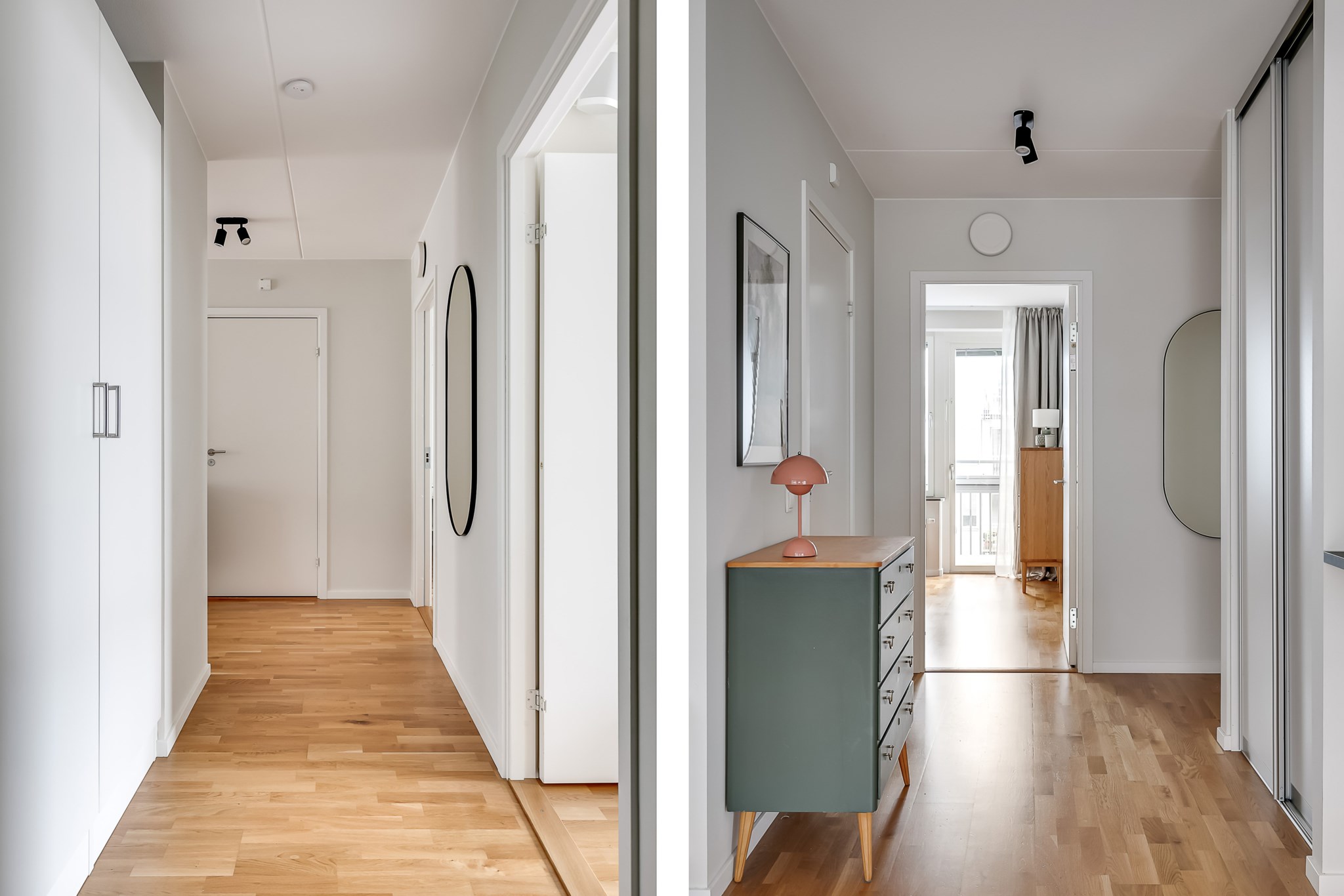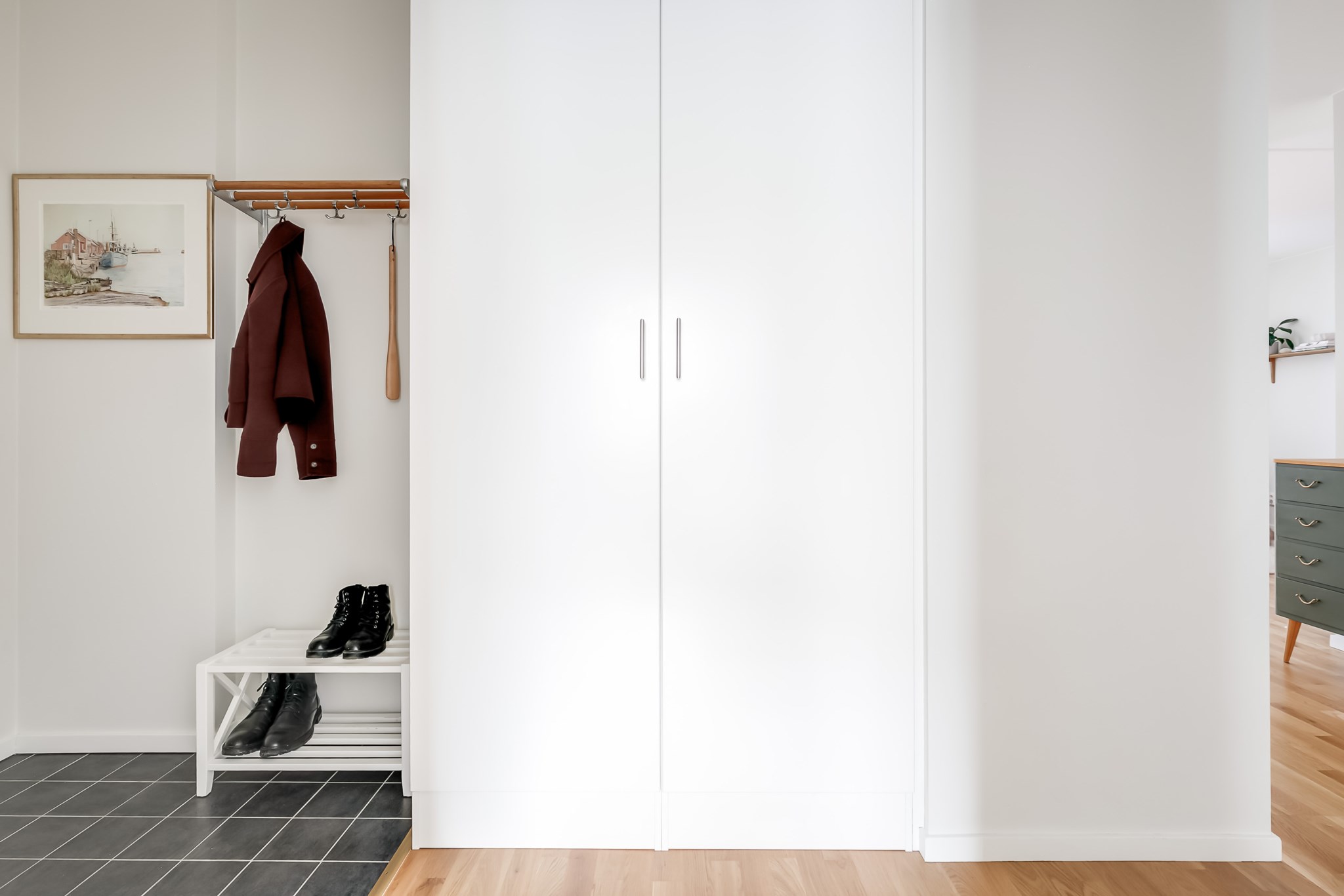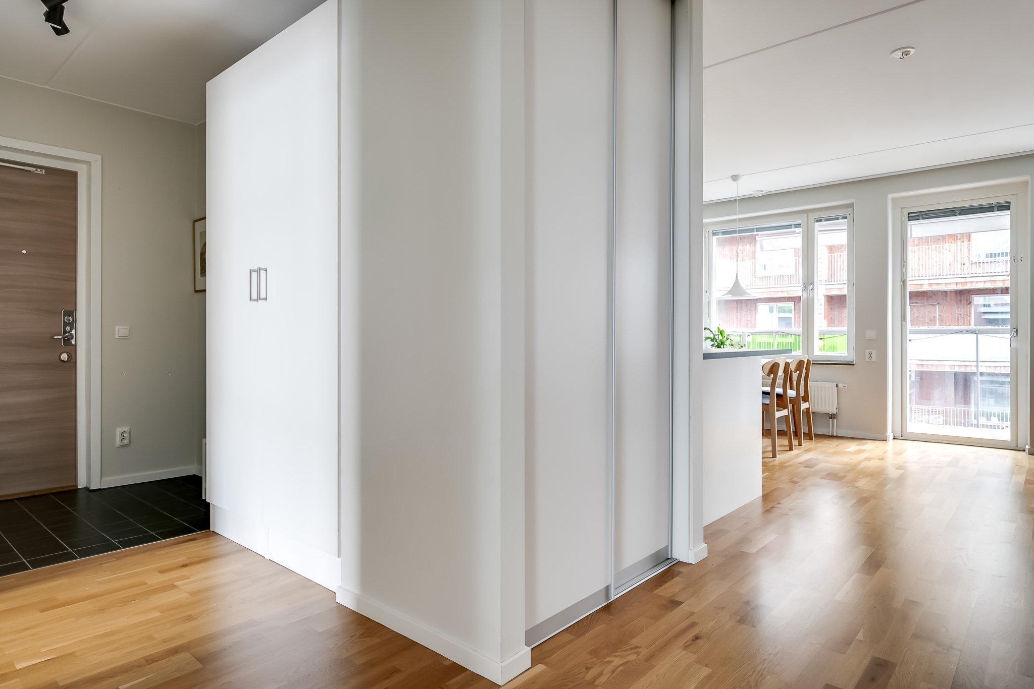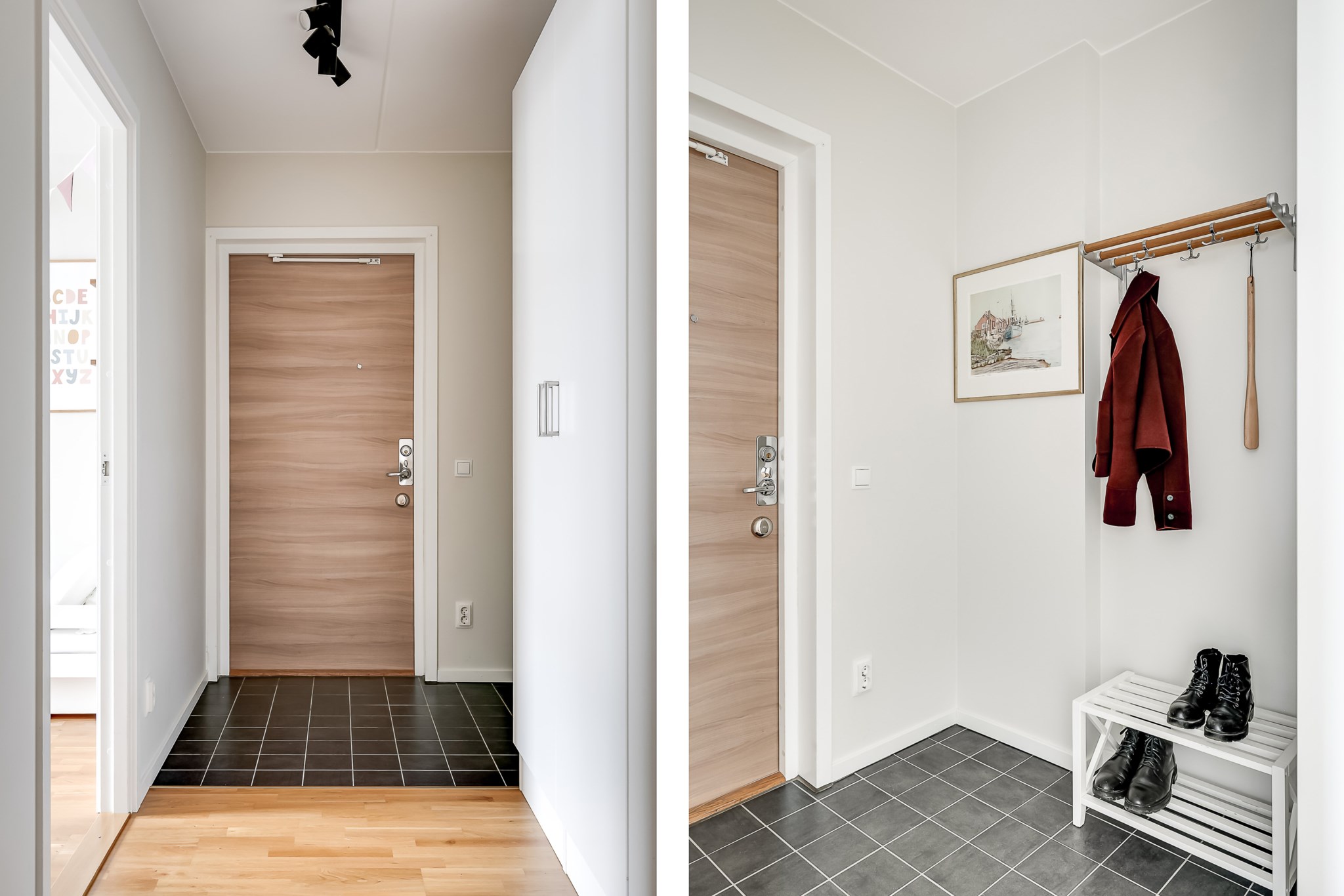 Rymlig och välkomnande hall med generösa ytor för avhängning av ytterkläder och skor direkt innanför ytterdörren. Här finns även garderober som ger gott om förvaring. Hallen har ljusmålade ytskikt och ett mörkt klinkergolv som elegant övergår i parkett längre in i bostaden vilket skapar en fin och praktisk helhet.