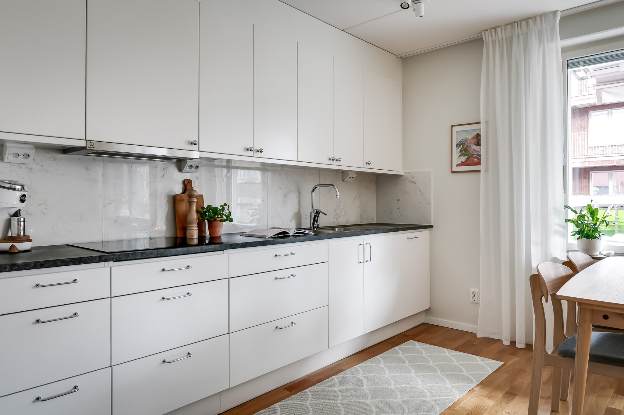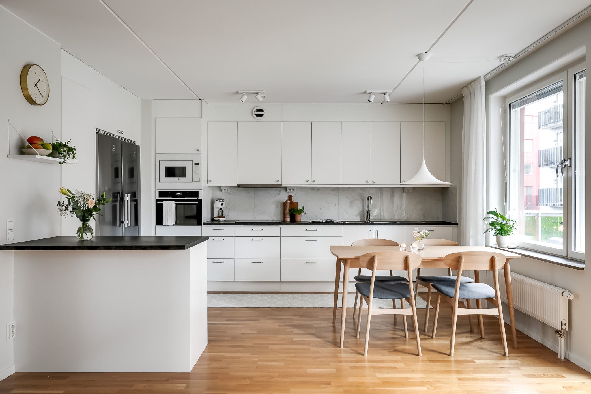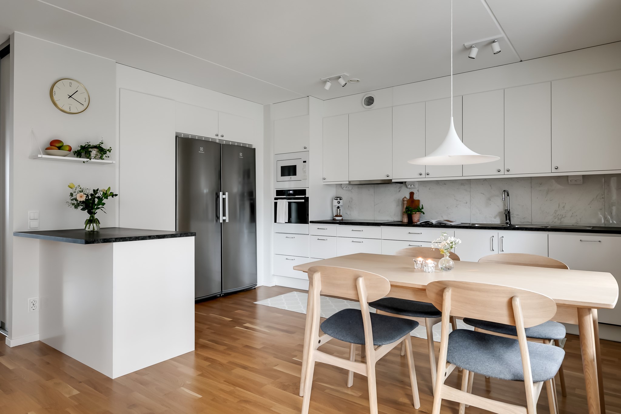 Stilrent kök med öppen planlösning mot vardagsrummet där en praktisk köksö skapar en naturlig avdelare och samtidigt erbjuder extra förvaring och arbetsyta. Köket är inrett med ljusa, släta skåpsluckor i fin kontrast mot den mörka bänkskivan och den melerade väggpanelen som ger rummet karaktär. Intill fönstret finns en självklar plats för matgrupp. Den maskinella utrustningen består av kyl, frys, spishäll, ugn, mikro och diskmaskin. Ljusmålade ytskikt och parkettgolv.