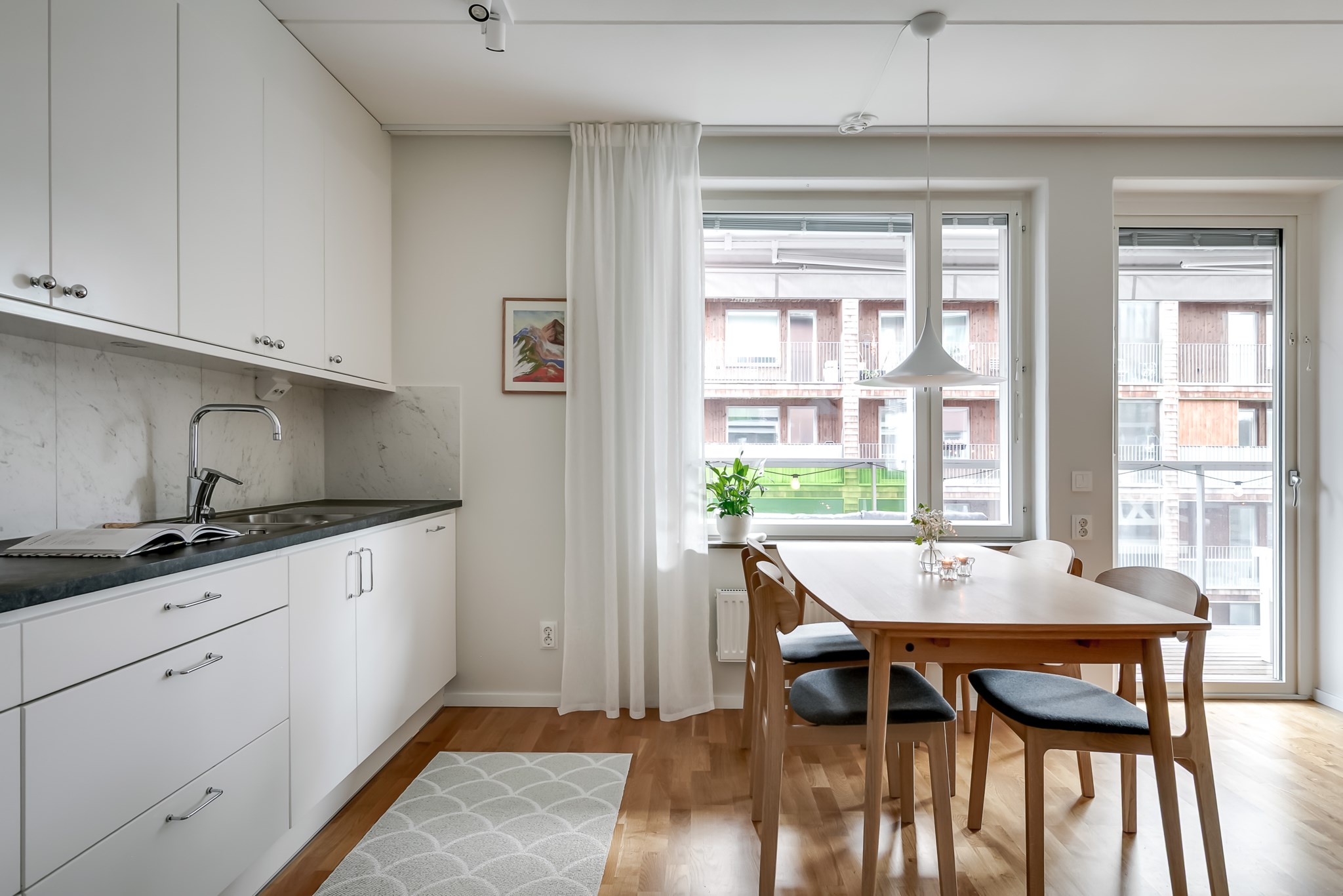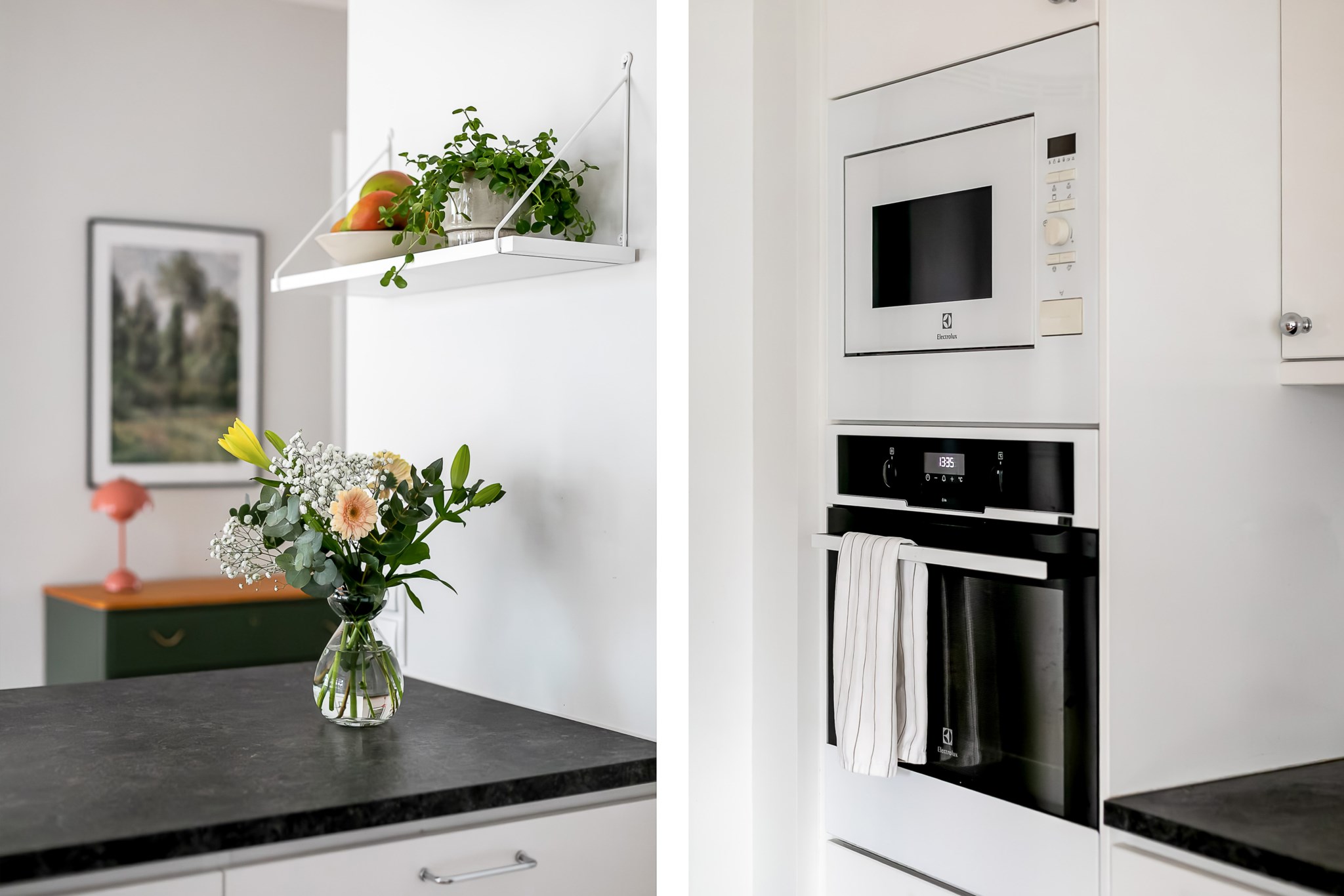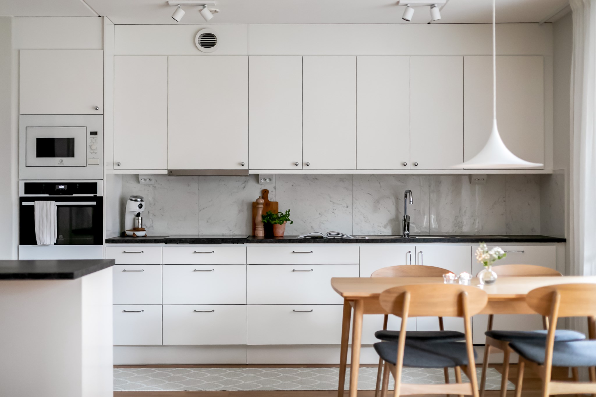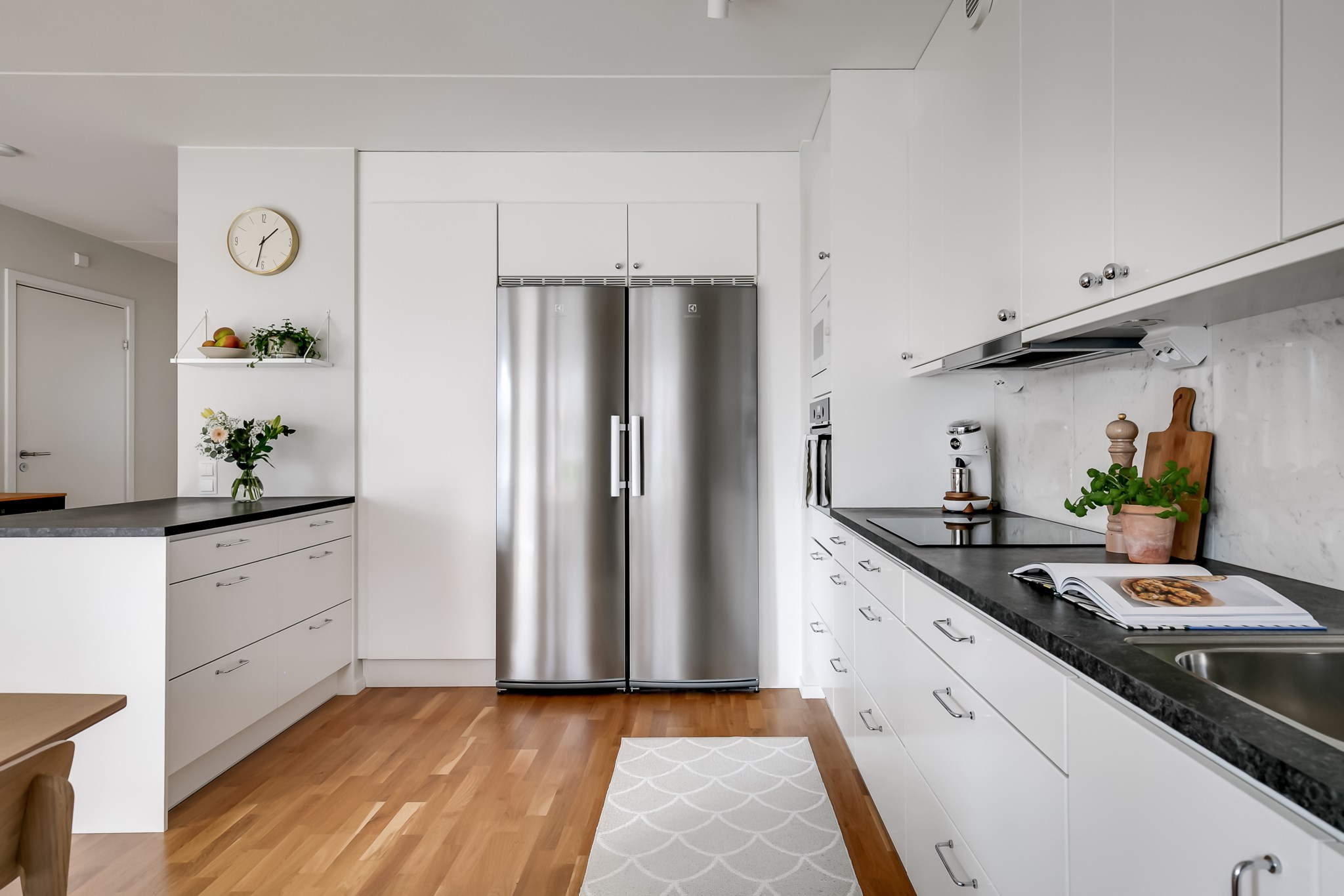 Stilrent kök med öppen planlösning mot vardagsrummet där en praktisk köksö skapar en naturlig avdelare och samtidigt erbjuder extra förvaring och arbetsyta. Köket är inrett med ljusa, släta skåpsluckor i fin kontrast mot den mörka bänkskivan och den melerade väggpanelen som ger rummet karaktär. Intill fönstret finns en självklar plats för matgrupp. Den maskinella utrustningen består av kyl, frys, spishäll, ugn, mikro och diskmaskin. Ljusmålade ytskikt och parkettgolv.