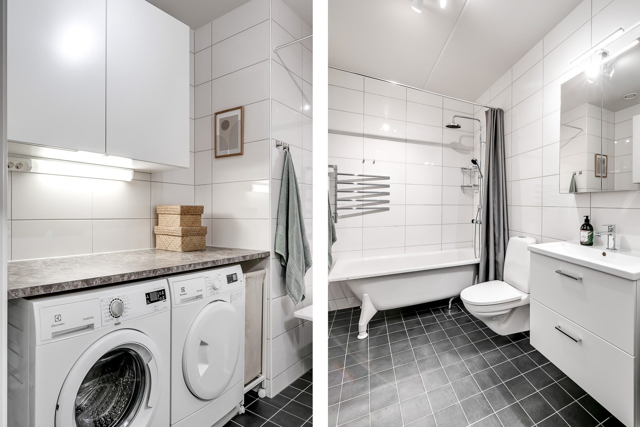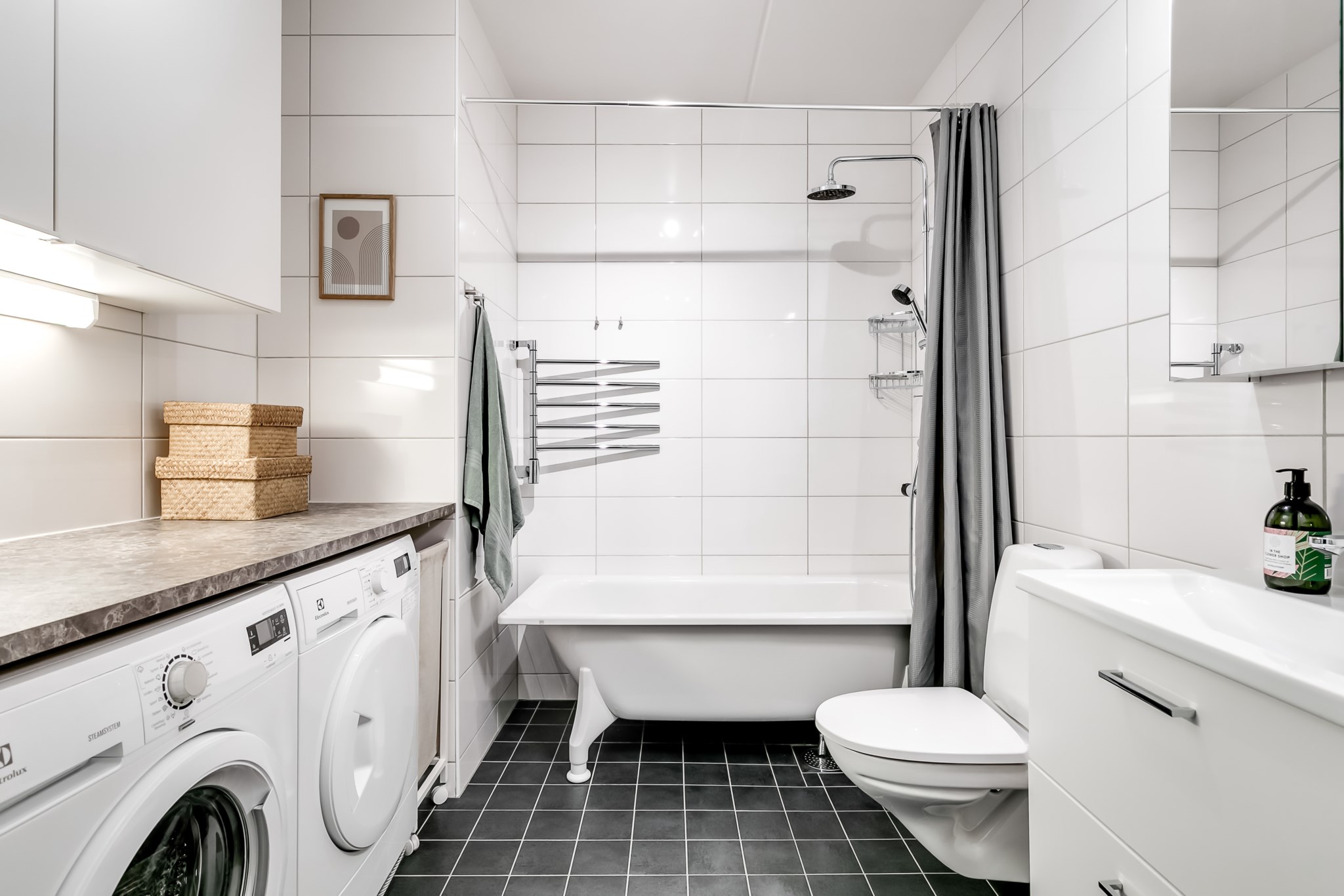 Helkaklat badrum med ljusa väggar och mörkt klinkergolv. Här erbjuds god förvaring genom kommod och spegelskåp samt en praktisk arbetsbänk i melerat utförande med tvättmaskin och torktumlare smart placerade undertill. Badrummet är vidare utrustat med wc, handfat, handdukstork samt ett badkar med dusch.