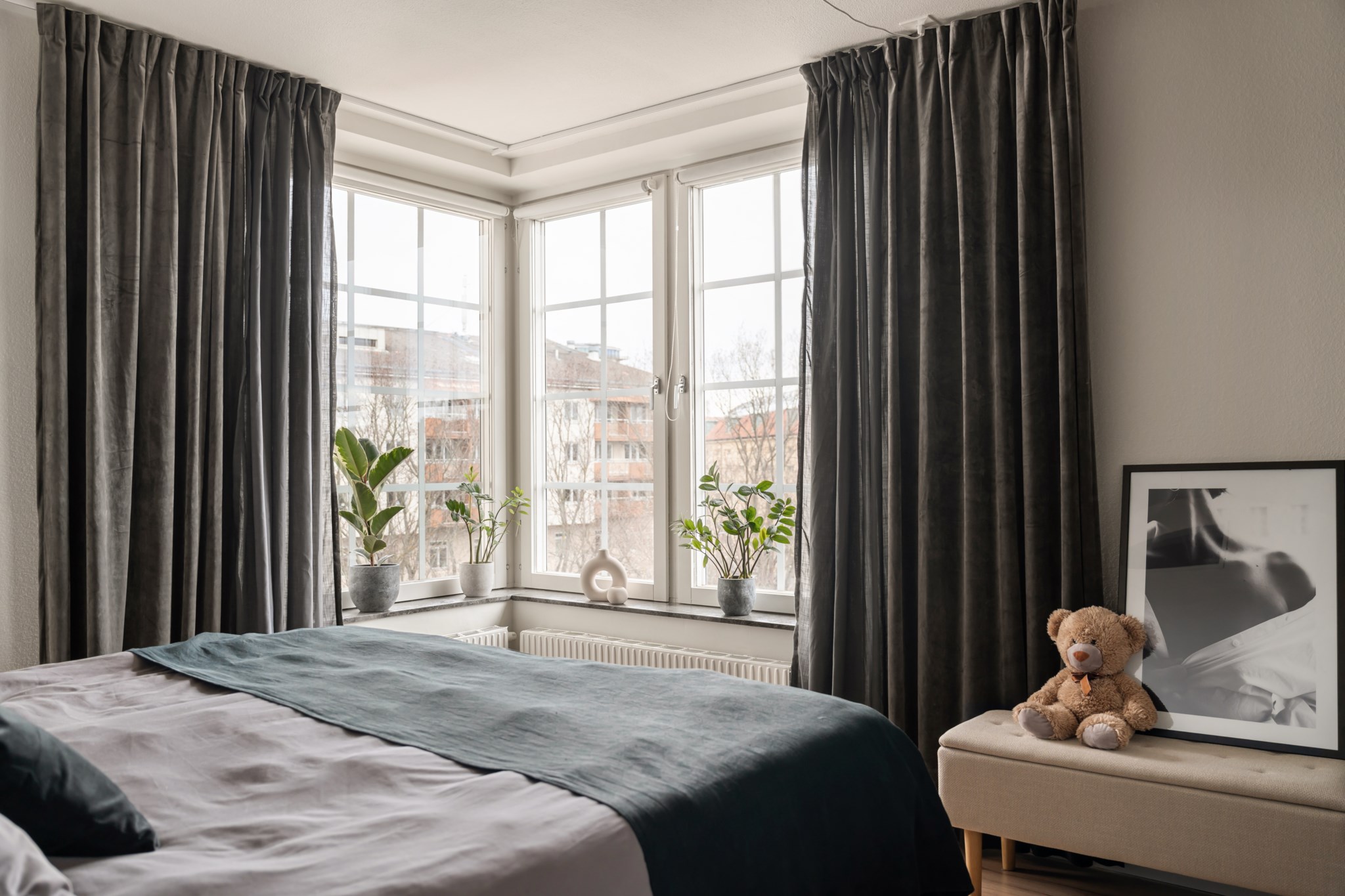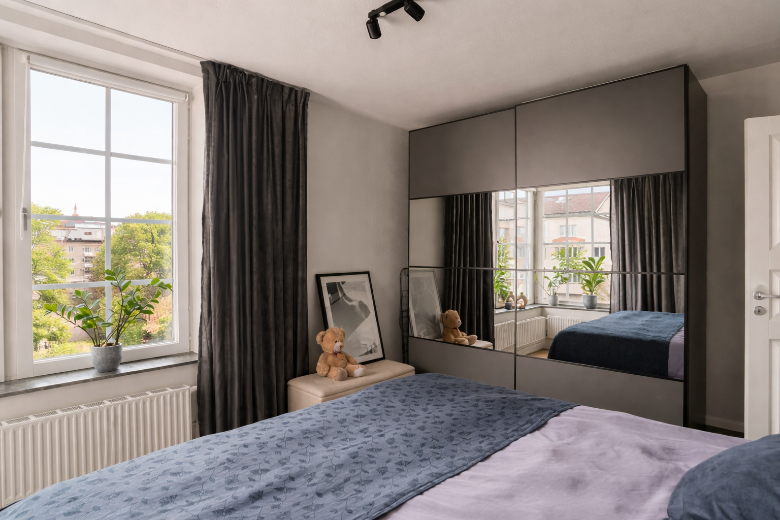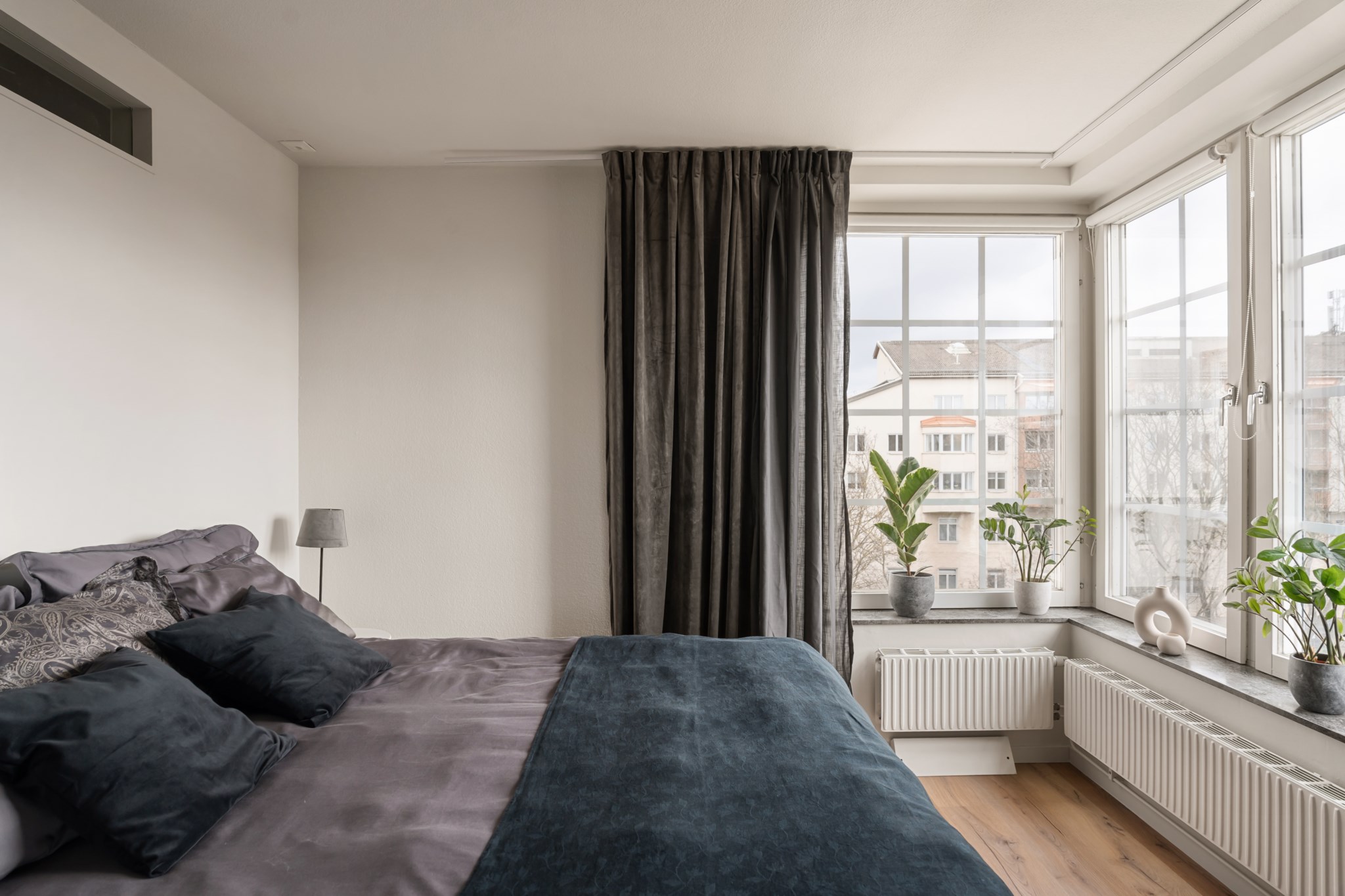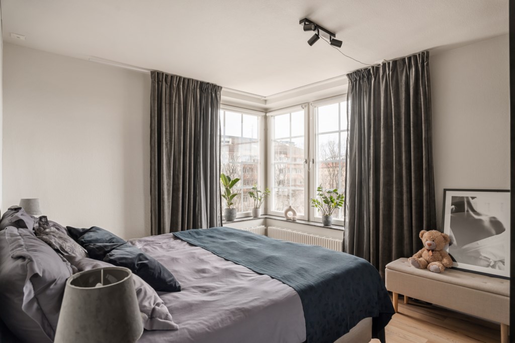 Rymligt och rofyllt sovrum med generöst ljusinsläpp från stora fönster i vinkel. Här finns gott om plats för dubbelsäng och tillhörande möblemang, och bra förvaringsmöjligheter i garderober med skjutdörrar.