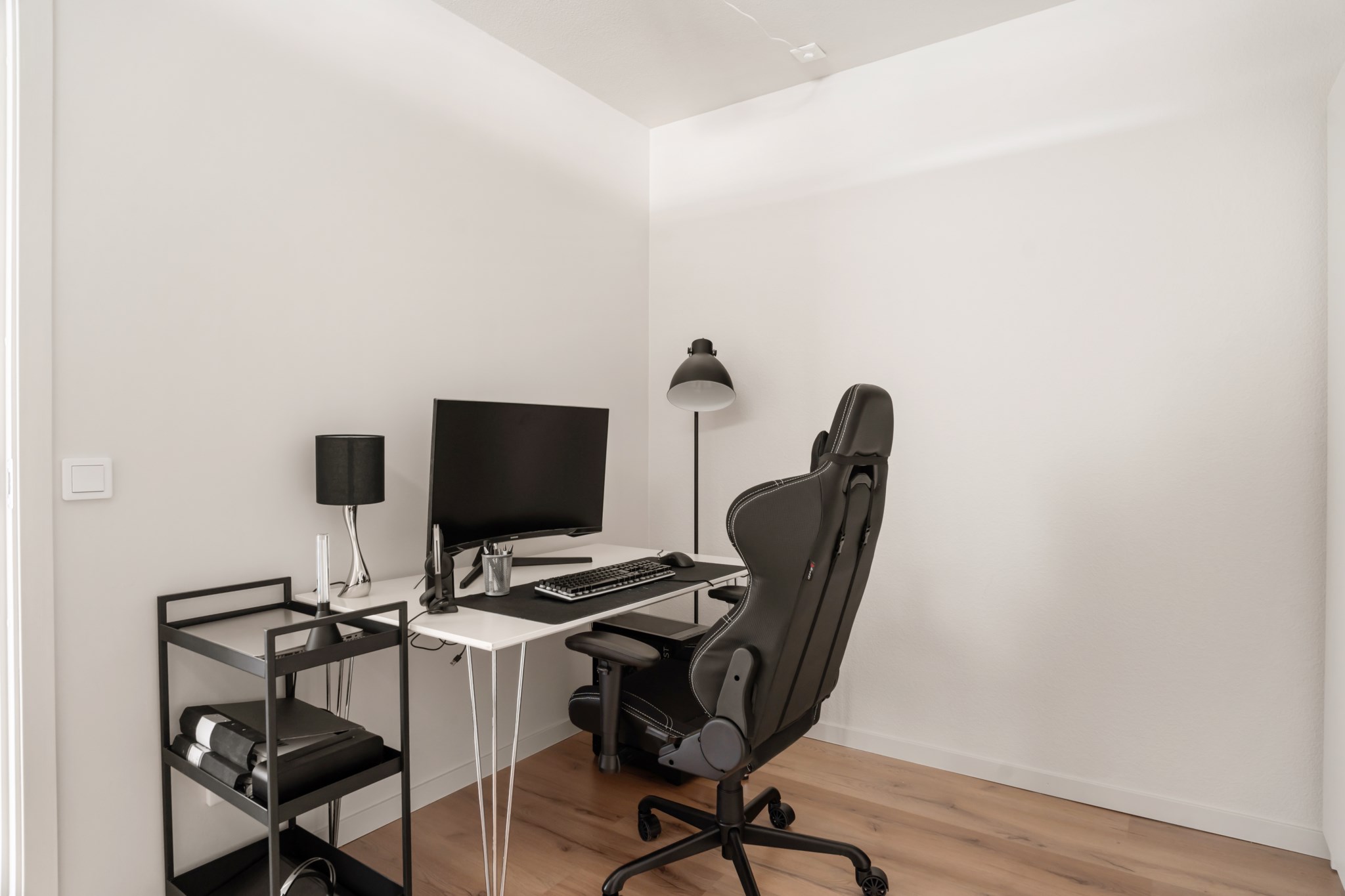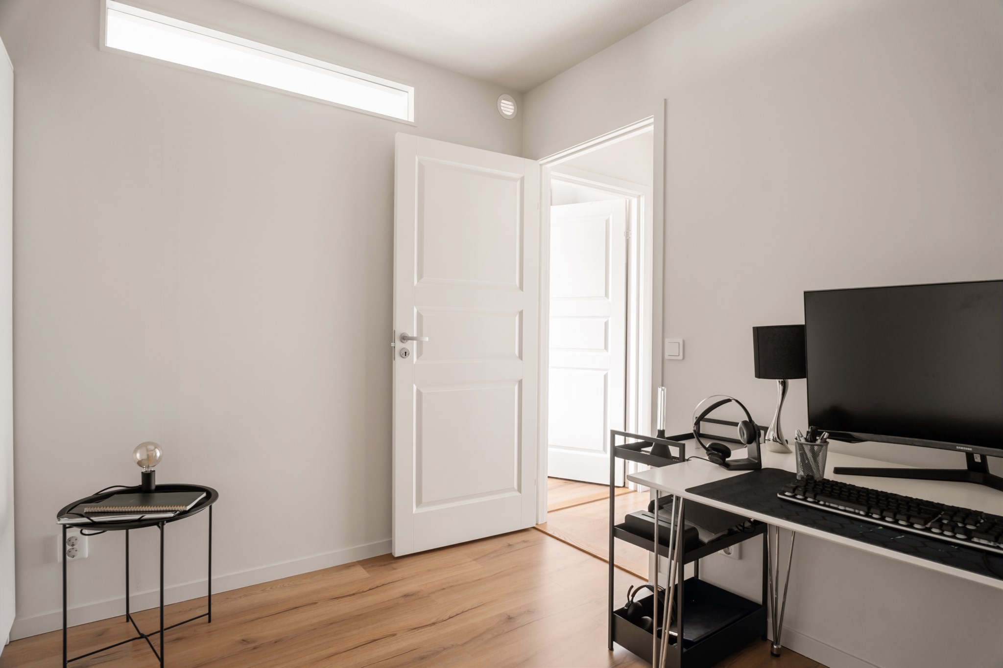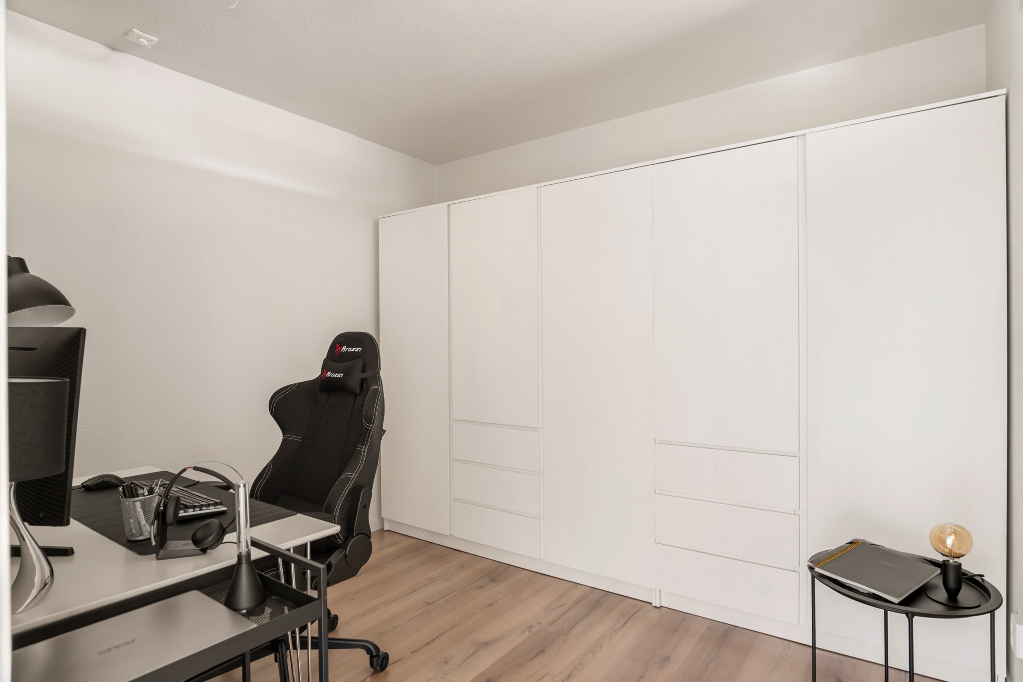 Ljust och rofyllt rum som lämpar sig perfekt som kontor eller arbetsrum. Här finns gott om plats för skrivbord och förvaring, med praktiska garderober som ger bra förvaringsmöjligheter. Rummets lugna läge och neutrala färgsättning skapar en trivsam miljö för både arbete och studier.