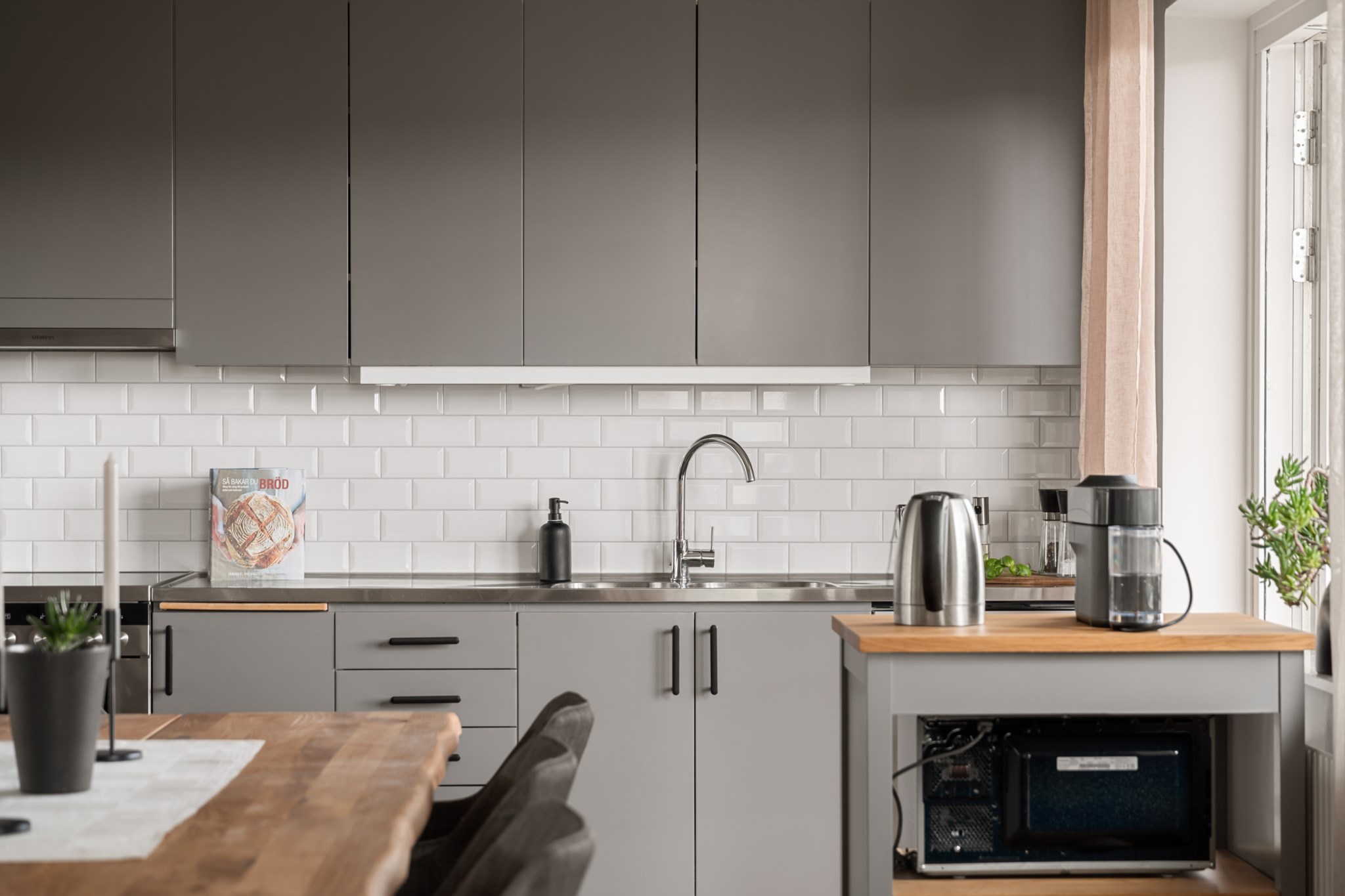 Modernt och stilrent kök i öppen planlösning mot vardagsrummet. Köket är utrustat med kyl och frys i fullhöjd, spis med ugn, diskmaskin samt mikro, och erbjuder gott om förvaring bakom släta luckor samt bra arbetsytor. Ljust kakel ovan bänkskiva och stora fönsterpartier ger ett fint ljusinsläpp, och via glasdörr nås bostadens balkong som blir en naturlig förlängning av rummet.