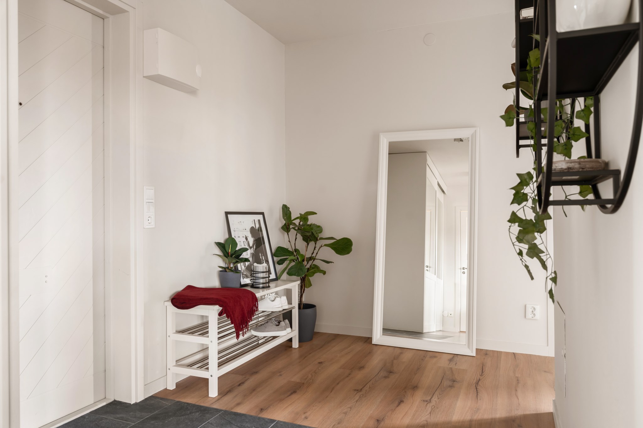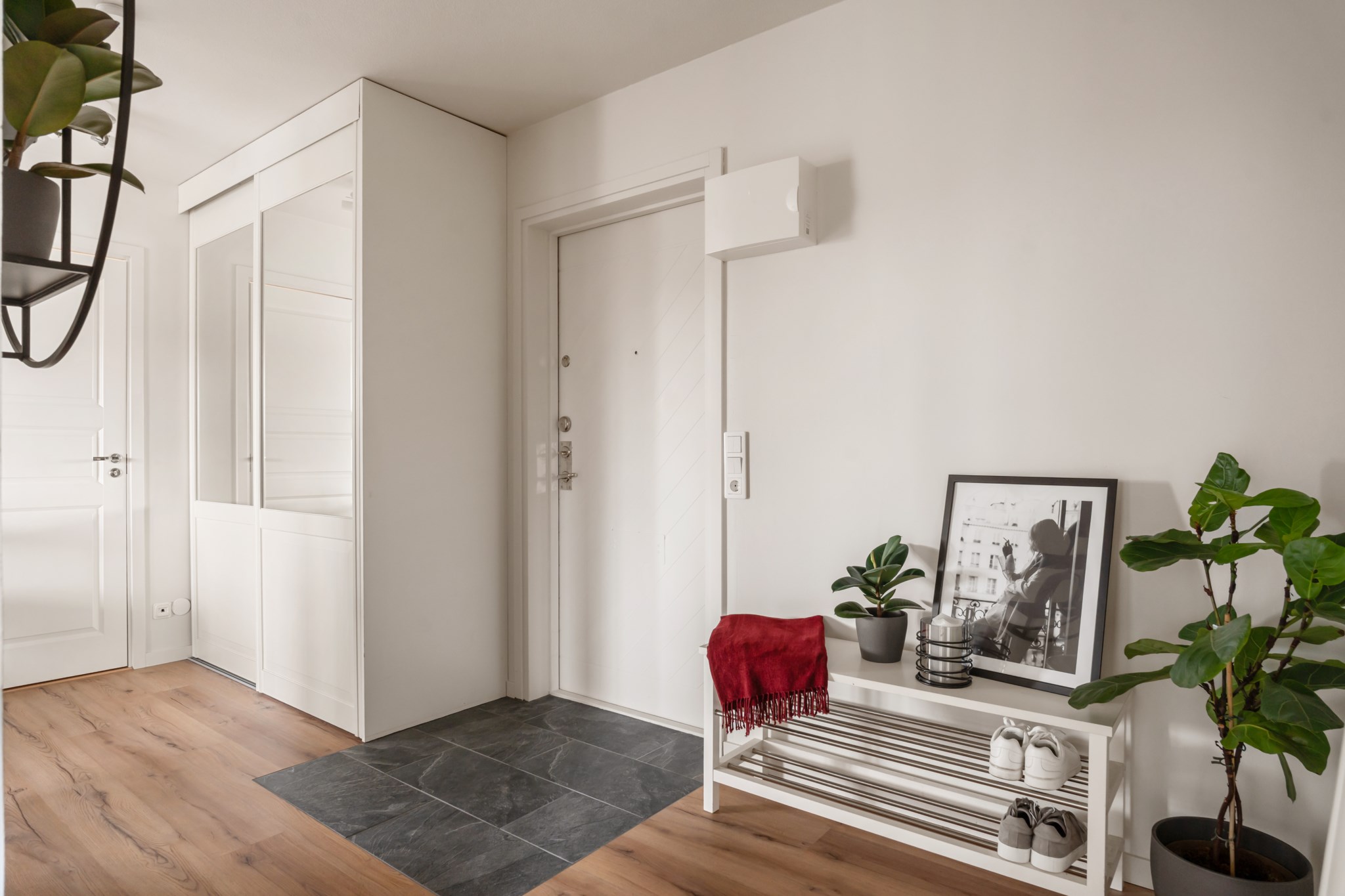 Välkomnande och ljus hall med ett stilrent första intryck. Direkt innanför entrén ligger praktisk klinker som är slitstark och lättskött, vilket övergår i ett enhetligt beige golv som skapar en varm känsla. Här finns goda förvaringsmöjligheter i garderob samt plats för avhängning och enklare möblering, och hallen leder smidigt vidare till bostadens övriga rum.