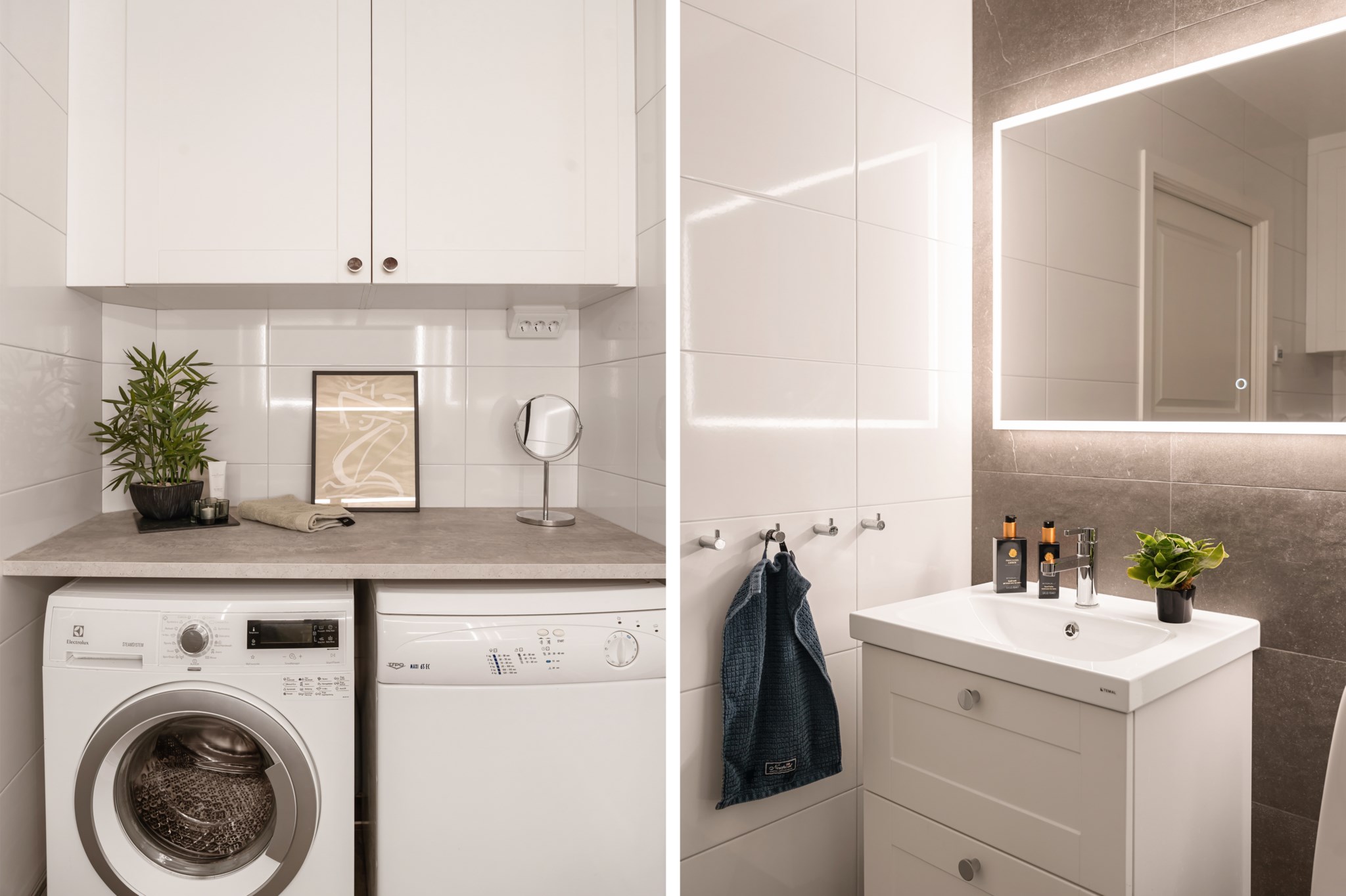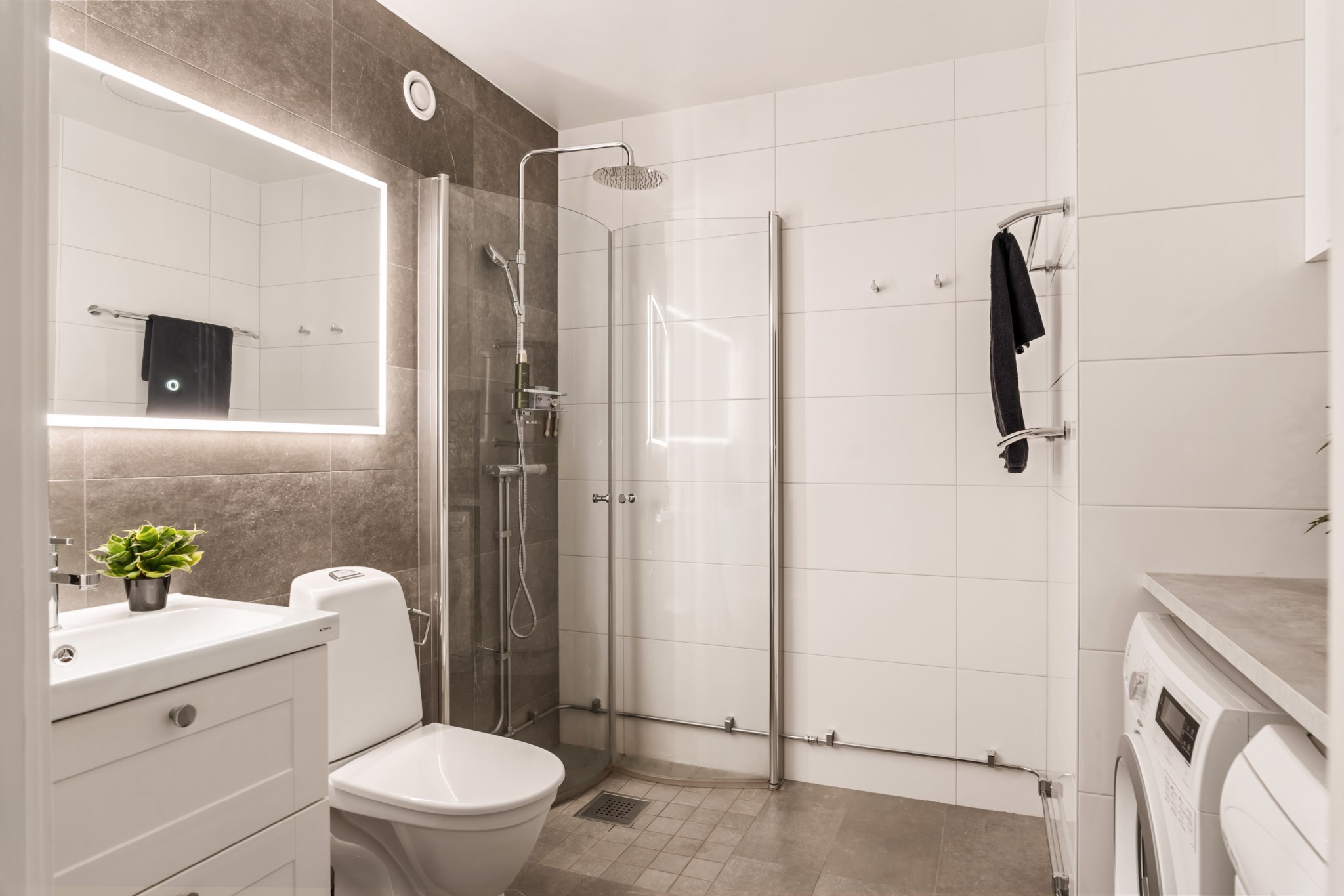 Fräscht och modernt badrum med stilrena materialval i ljusa toner. Här finns dusch med glasvägg, wc, kommod med handfat samt spegel med belysning. Badrummet är även utrustat med tvättmaskin och torktumlare samt praktisk arbetsyta och förvaring i överskåp.