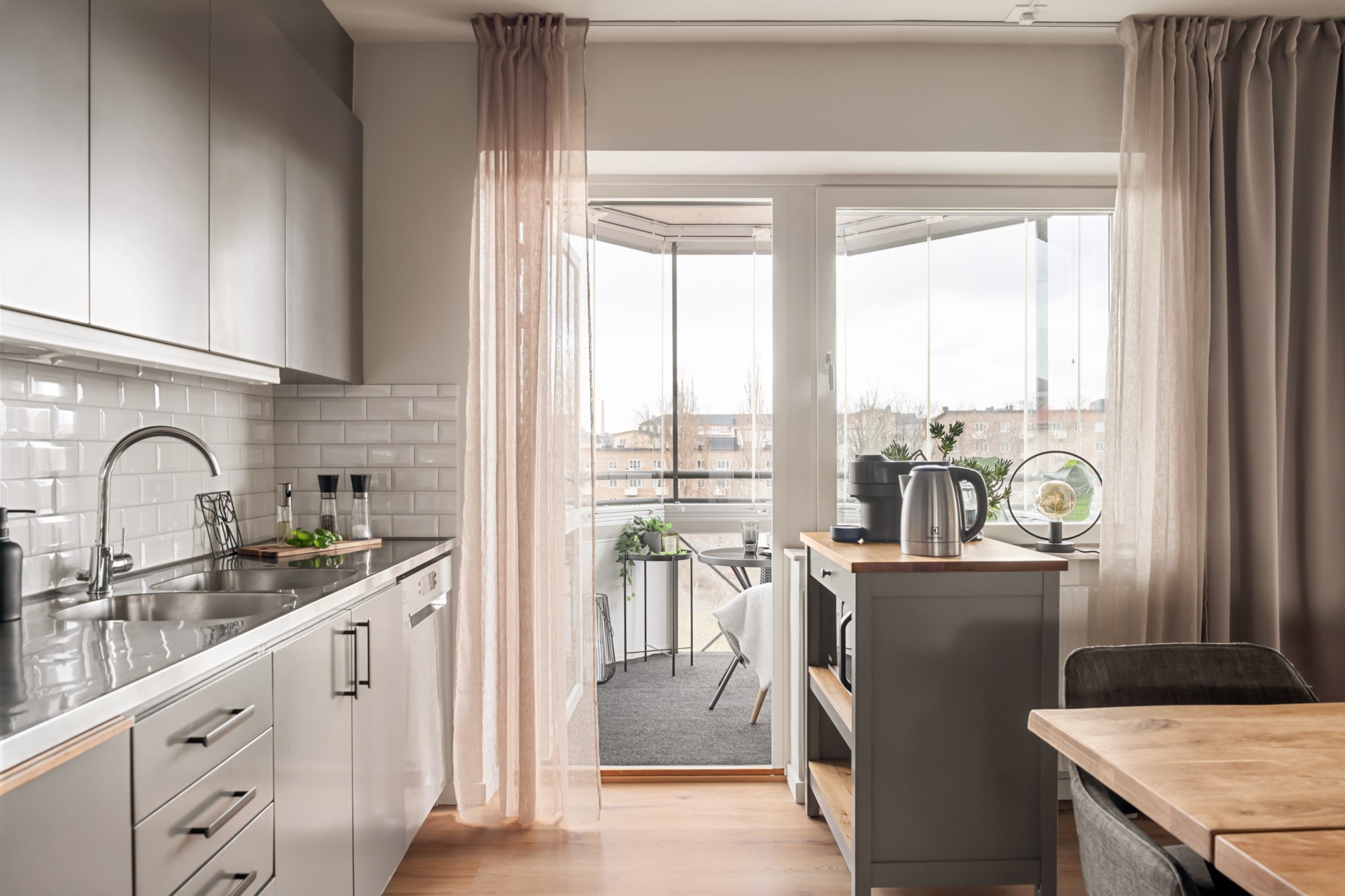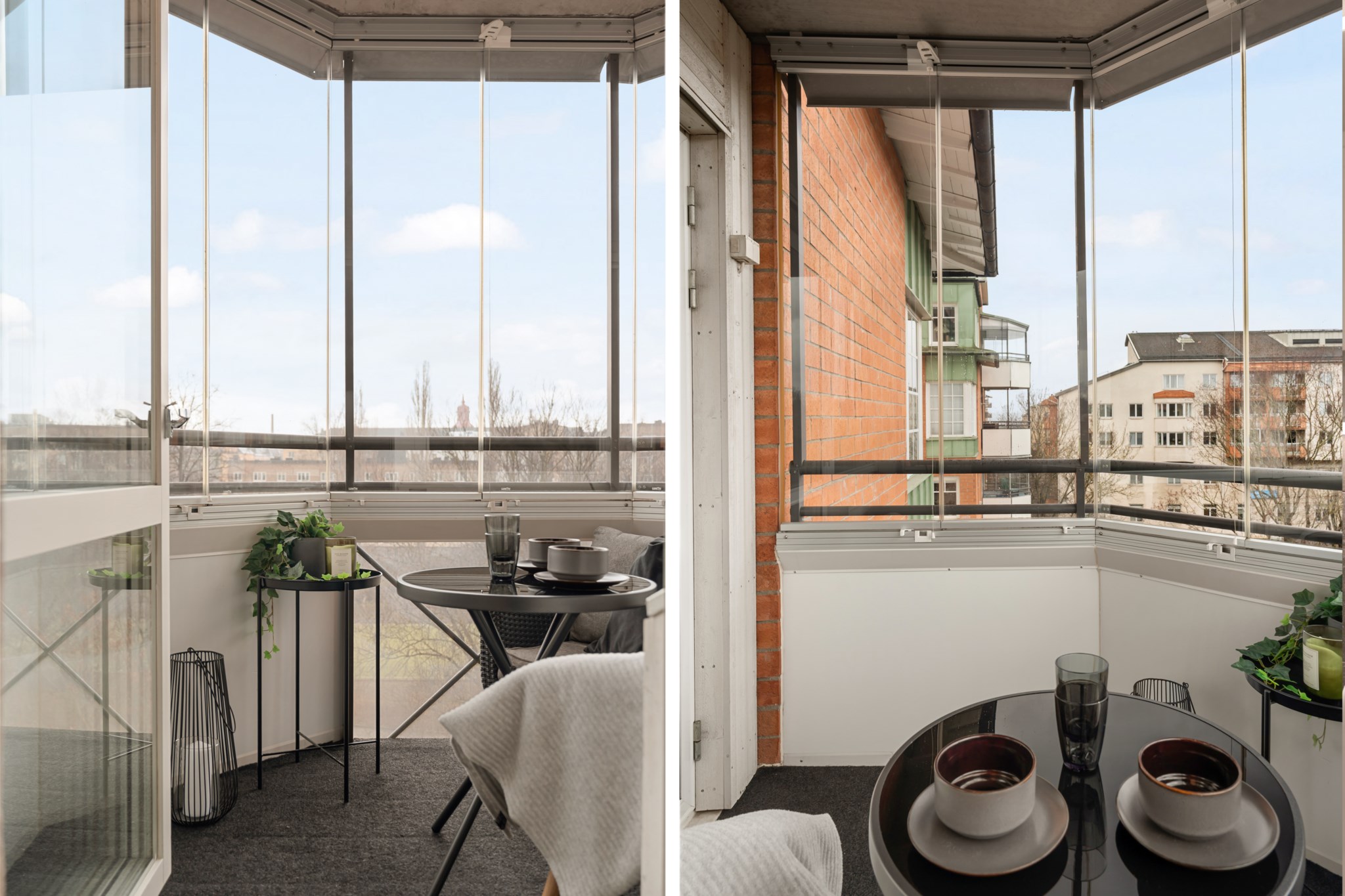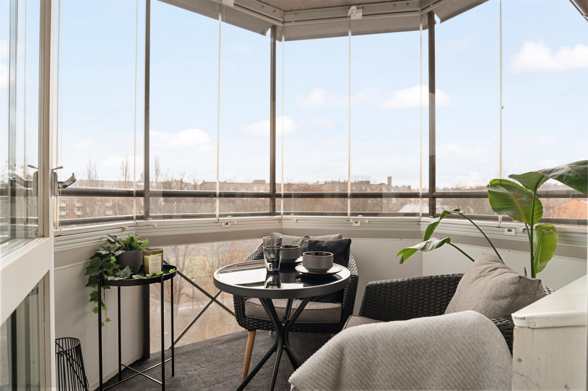 Inglasad balkong som fungerar som ett extra rum under stora delar av året. Här finns plats för en mindre sittgrupp och ett fint ljusinsläpp bidrar till en ljus och trivsam miljö. En perfekt plats att koppla av på från tidig vår till sen höst.
