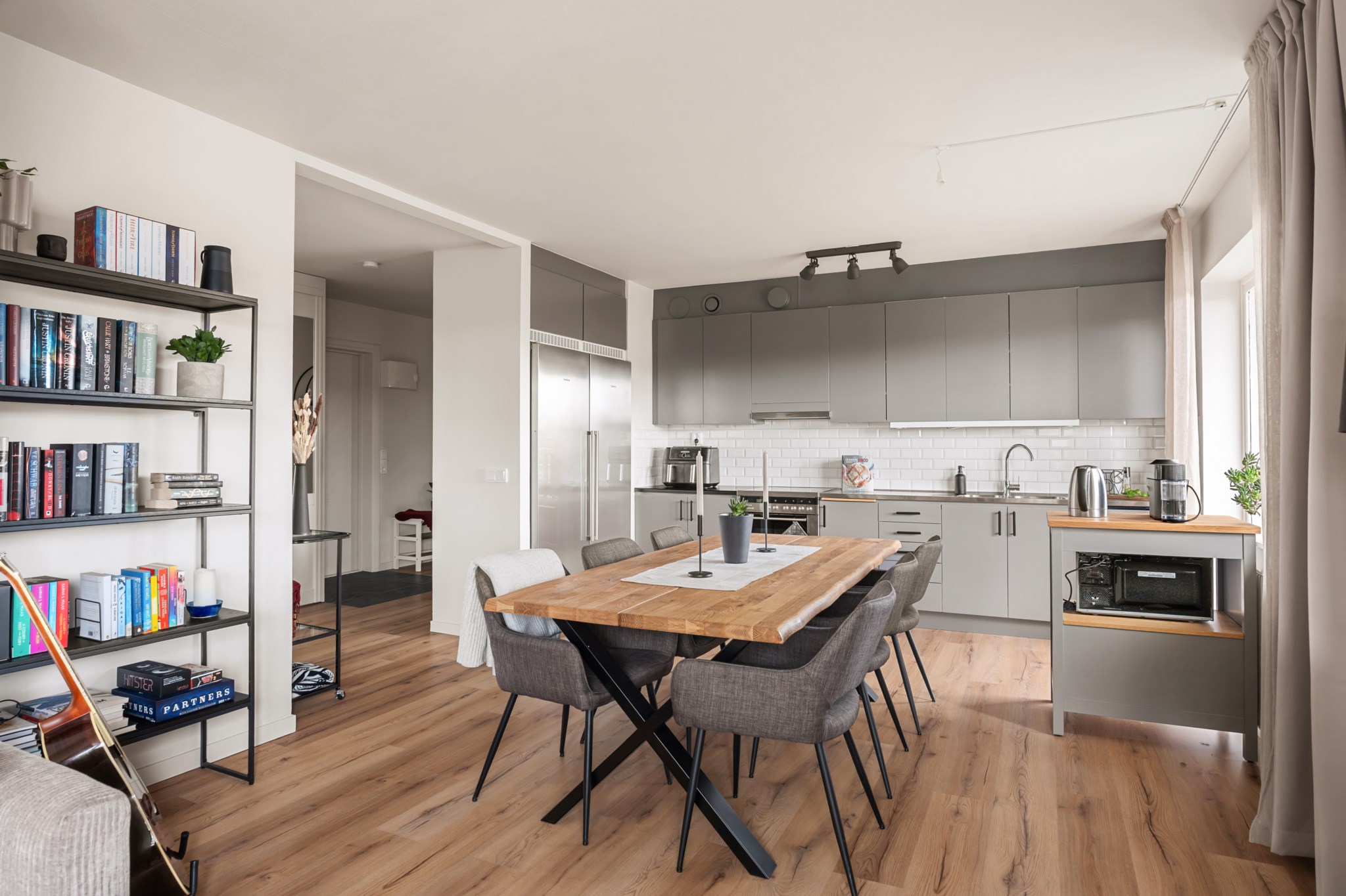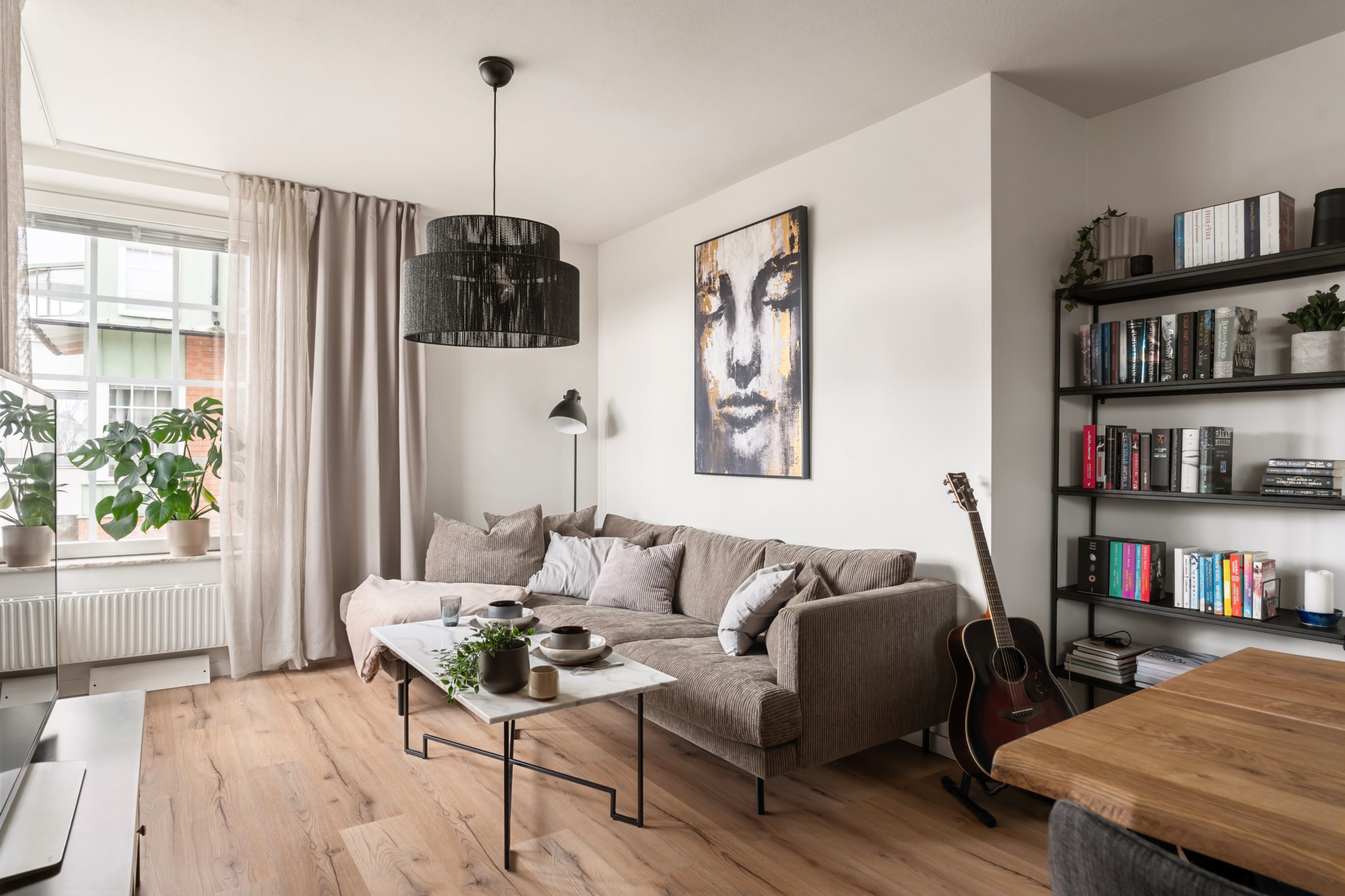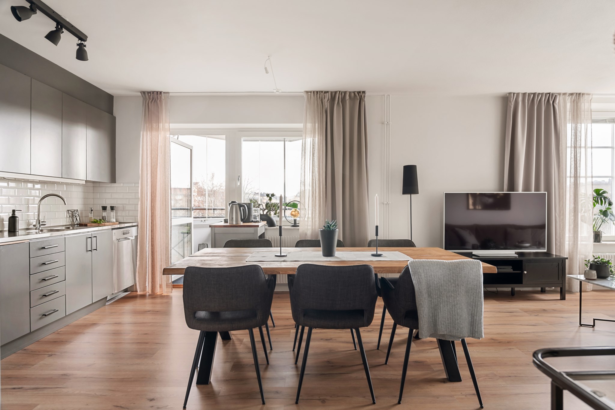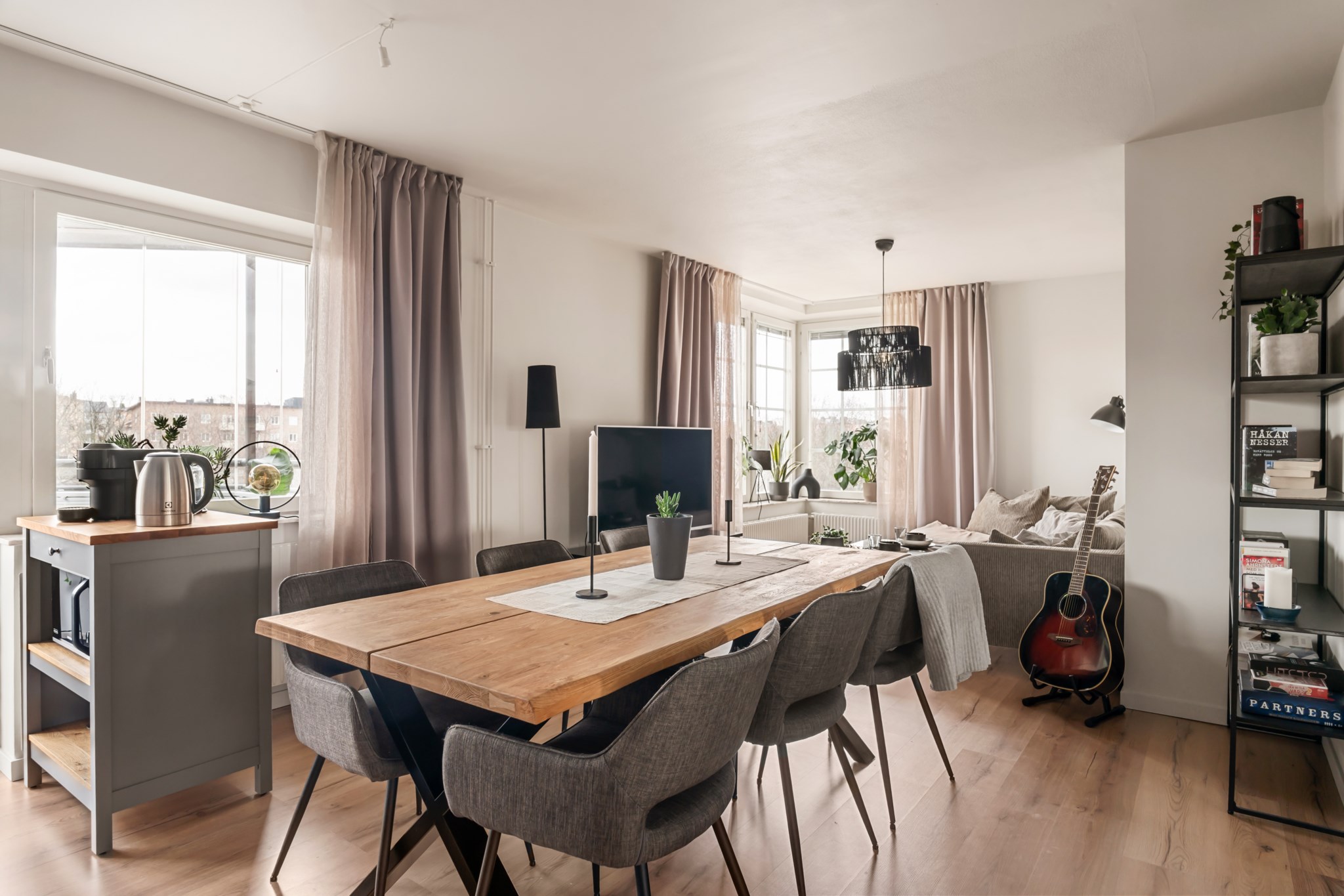 Ljust och trivsamt vardagsrum med generösa fönsterpartier som ger ett fint ljusinsläpp. Rummet erbjuder gott om plats för både soffgrupp och matplats, vilket skapar en social och inbjudande miljö. Den öppna känslan tillsammans med de ljusa ytskikten och det enhetliga golvet bidrar till en harmonisk helhet.