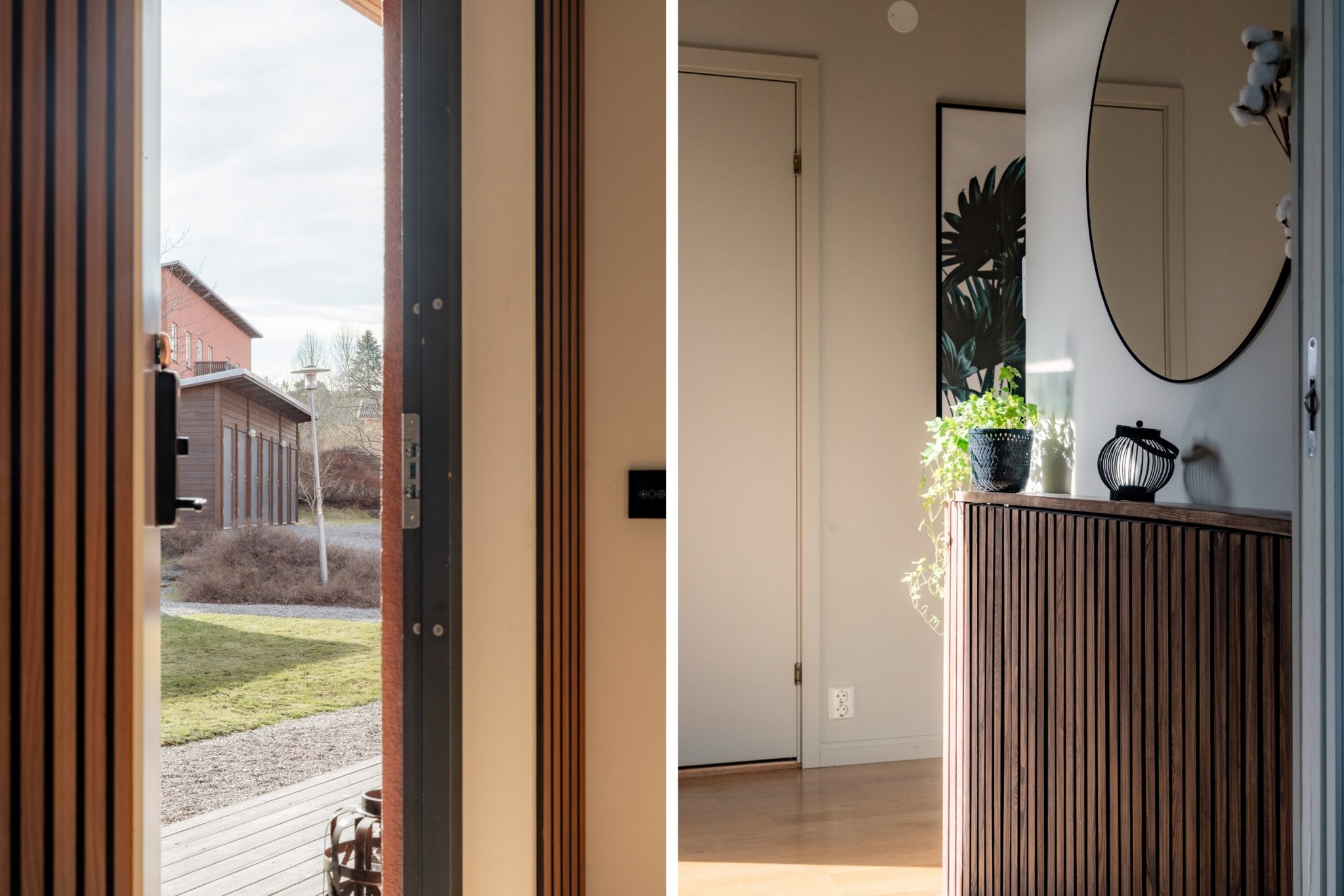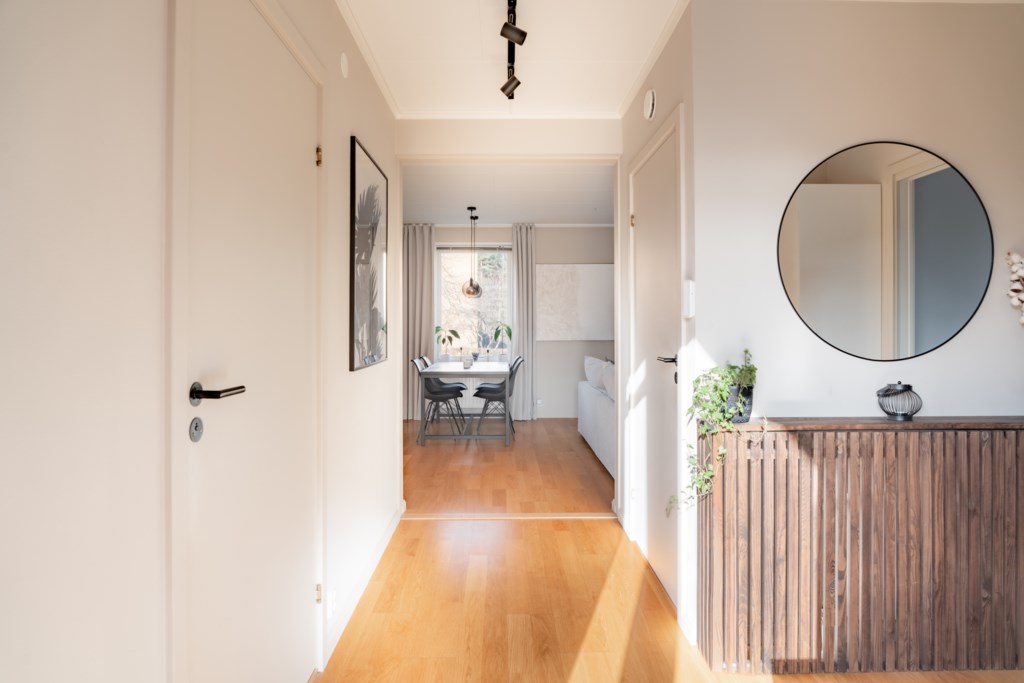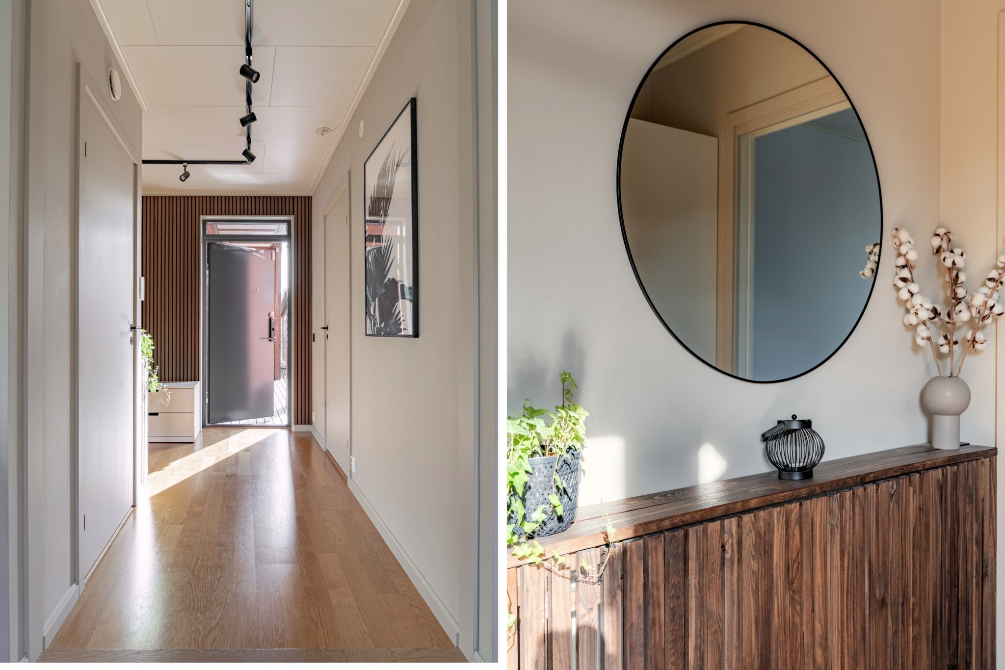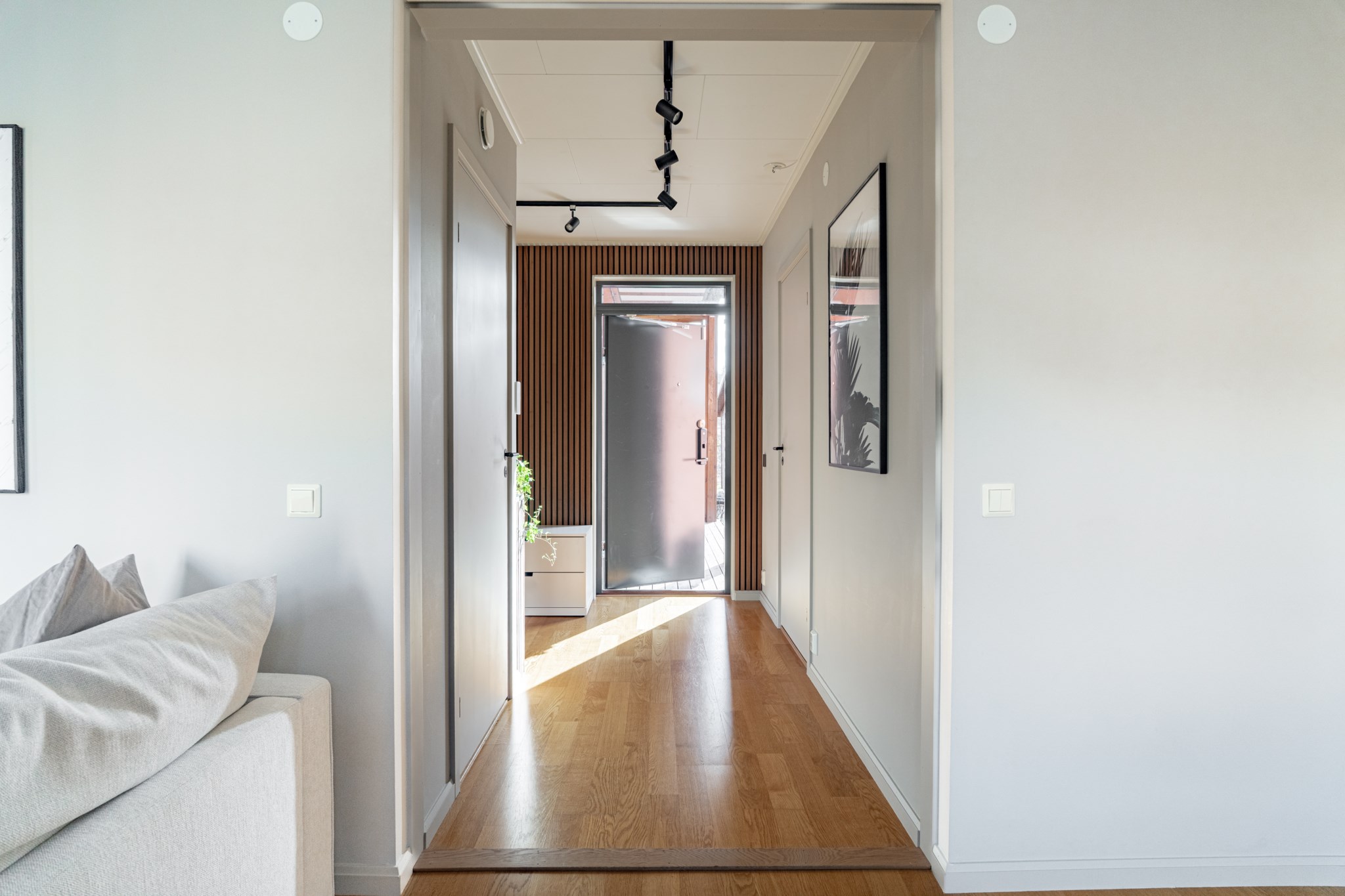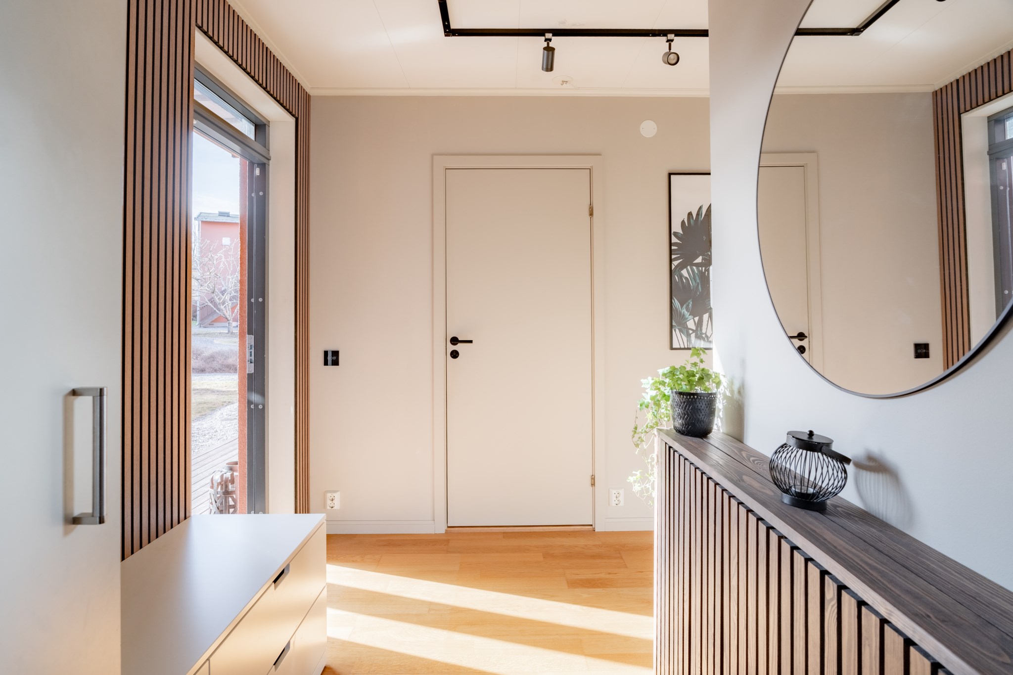 Välkomnande hall med ljusmålade ytskikt kombinerat med väggpanel i valnötsfärgat trä och parkettgolv. Plats för avhängning av ytterkläder och skor samt moderna spotlights i taket som tillför fin ljussättning.