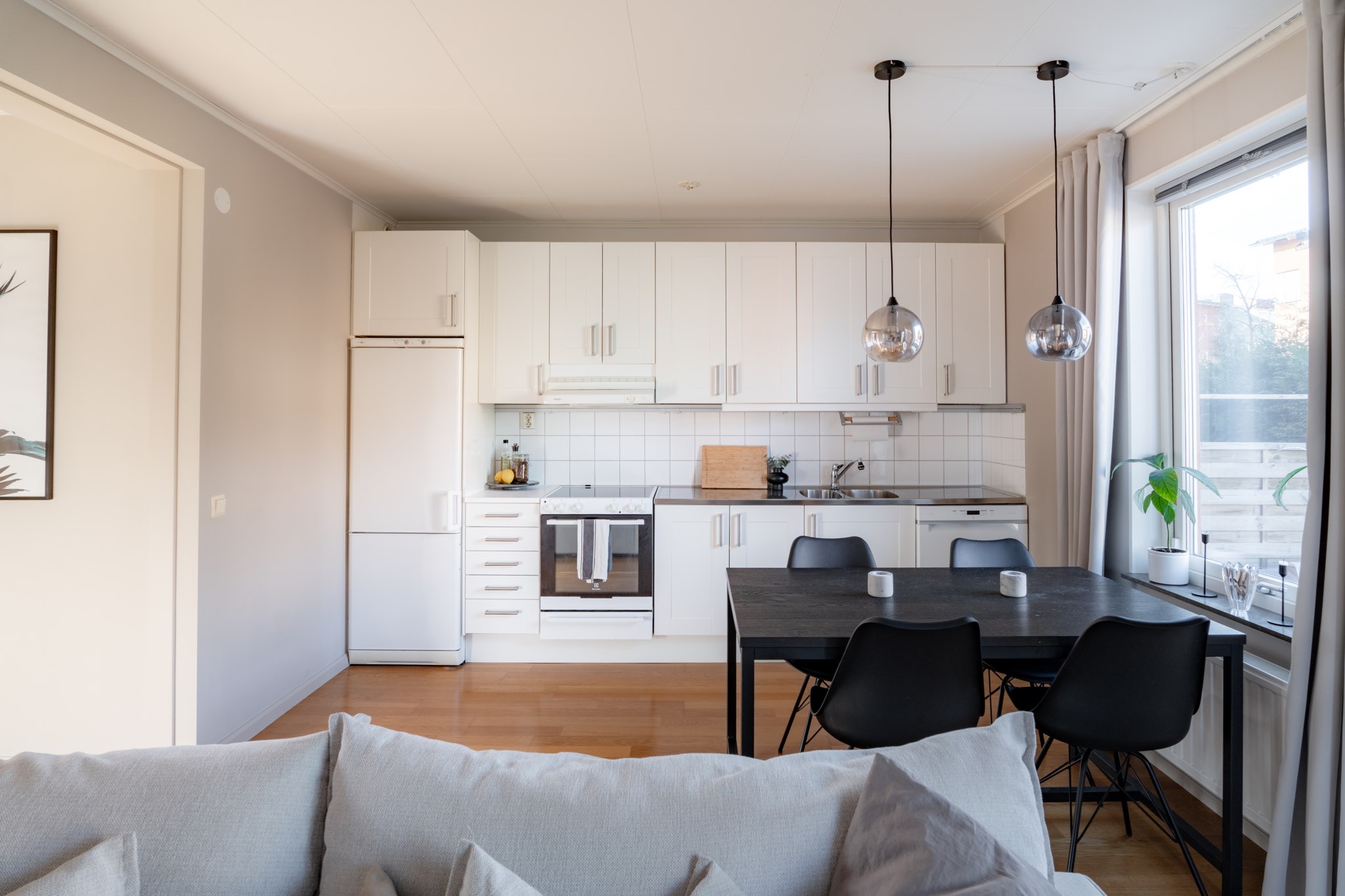 Klassiskt kök med öppen planlösning mot vardagsrum som skapar en social och sammanhängande yta. Neutralt målade ytskikt och parkettgolv. God förvaring bakom ljusa, släta skåpsfronter som samspelar med kaklad väggpanel och bänkskiva i rostfritt stål. Maskinell utrustning i form av kyl/frys, spis, ugn, fläkt och diskmaskin. Matplats naturligt placerad intill fönster med fint ljusinsläpp.