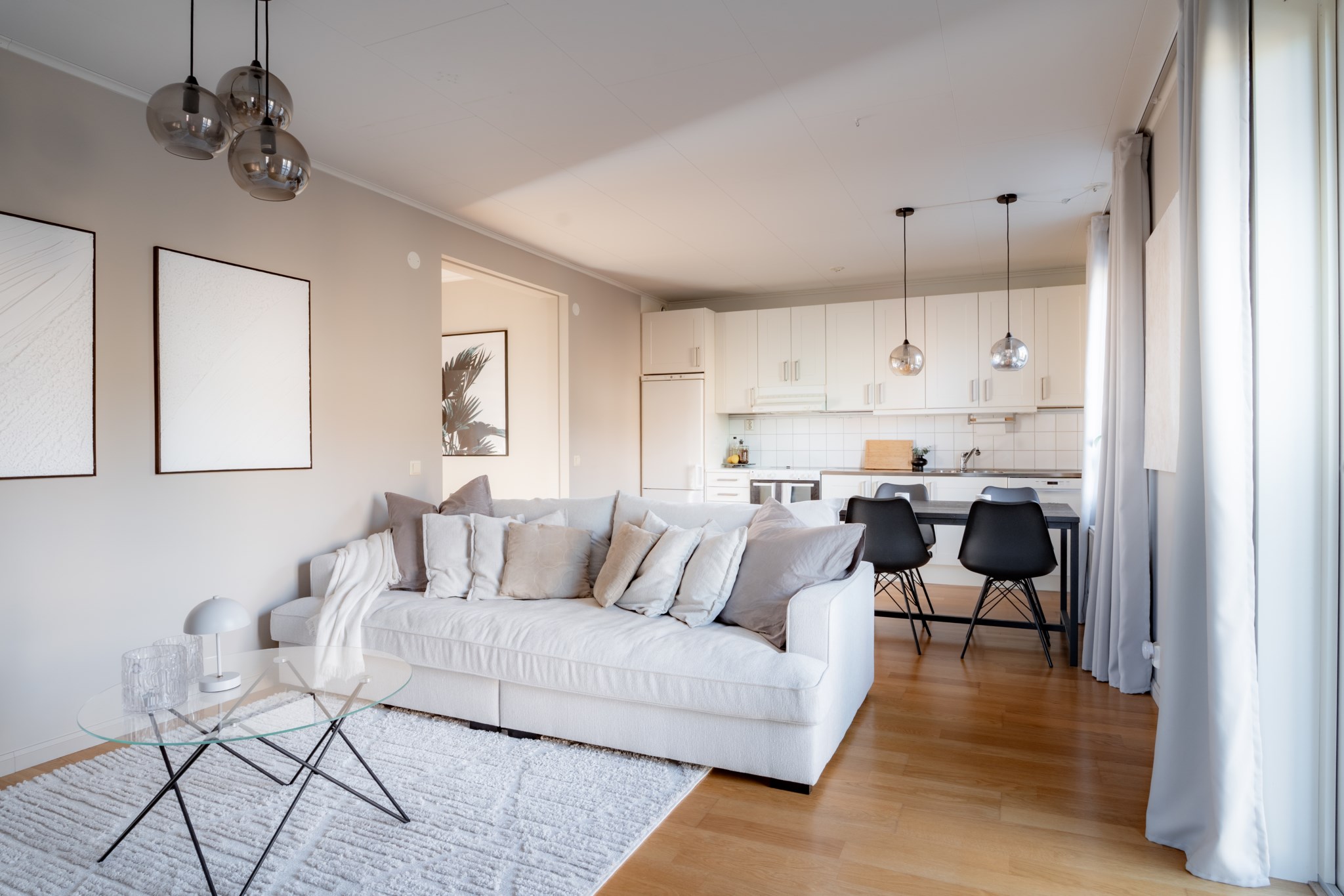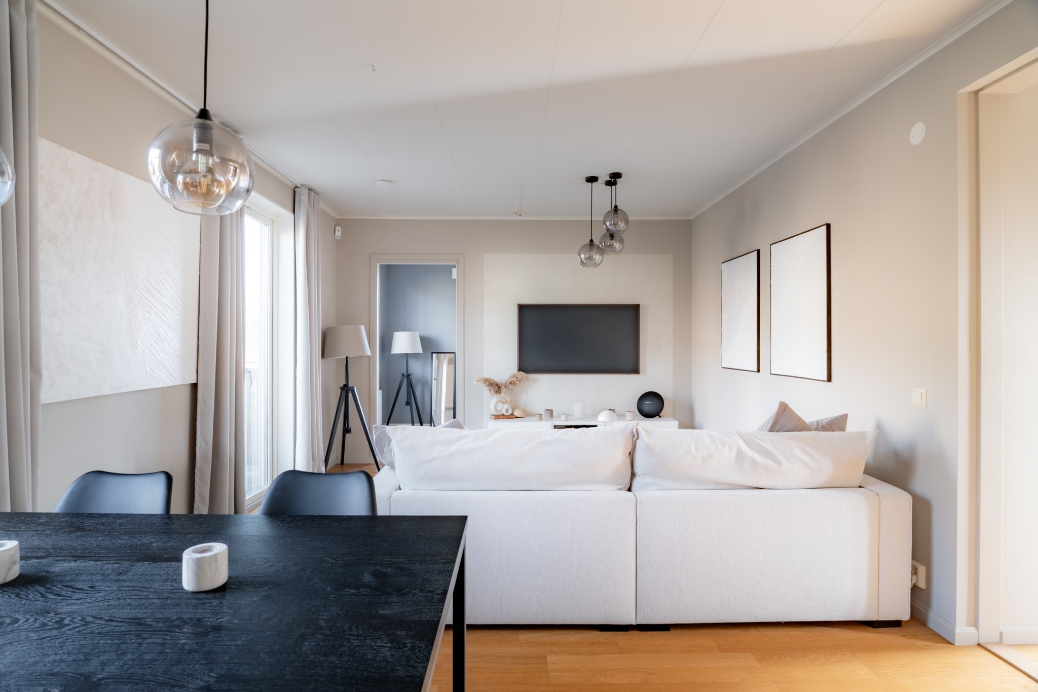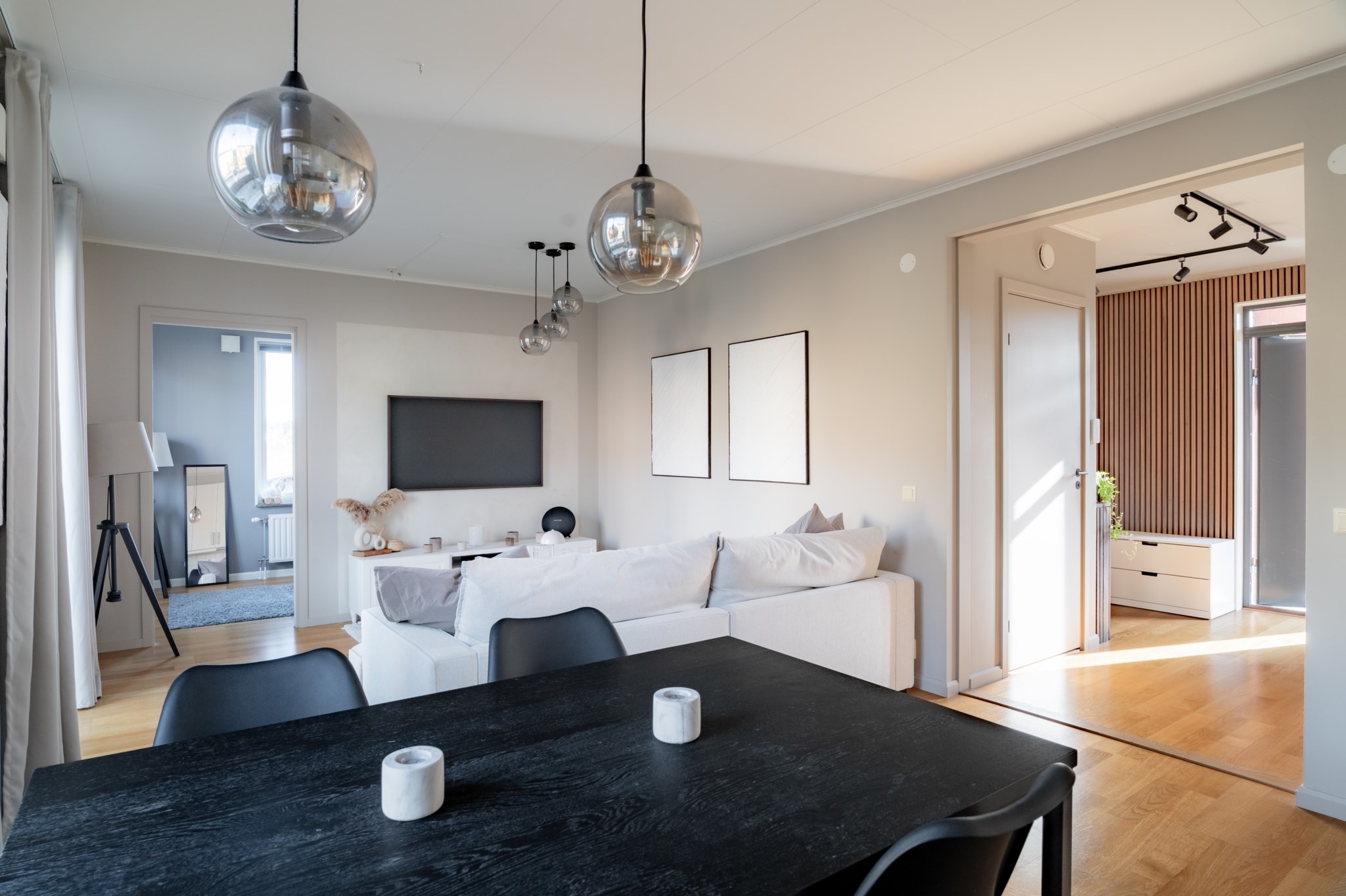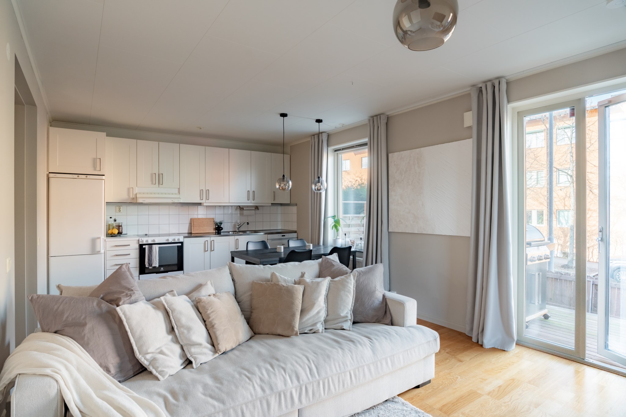 Trivsamt vardagsrum med neutralt målade ytskikt och parkettgolv. Plats för soffa och övrigt möblemang samt personlig inredning. Direkt access till bostadens trevliga uteplats som blir en naturlig förlängning av rummet.