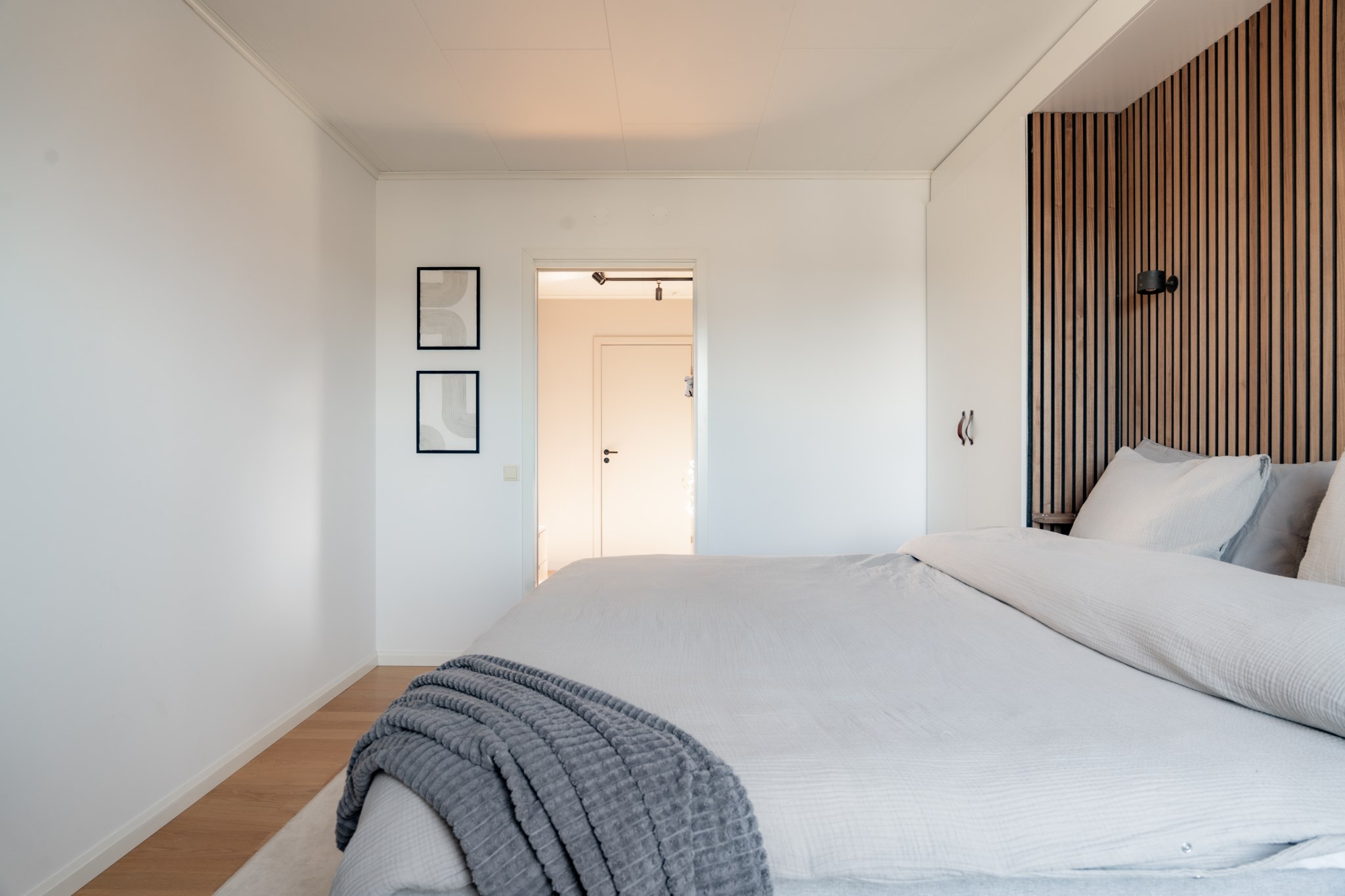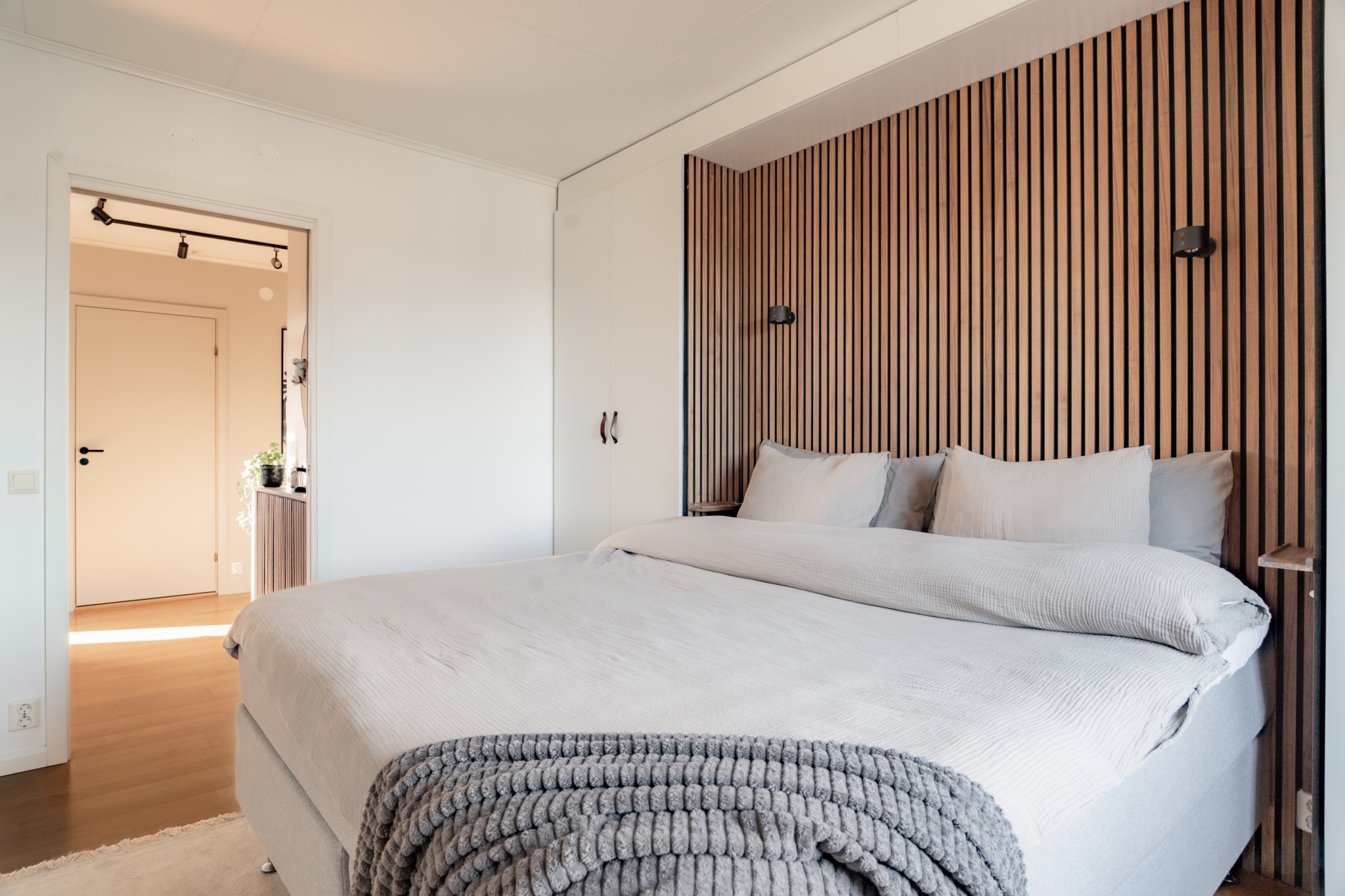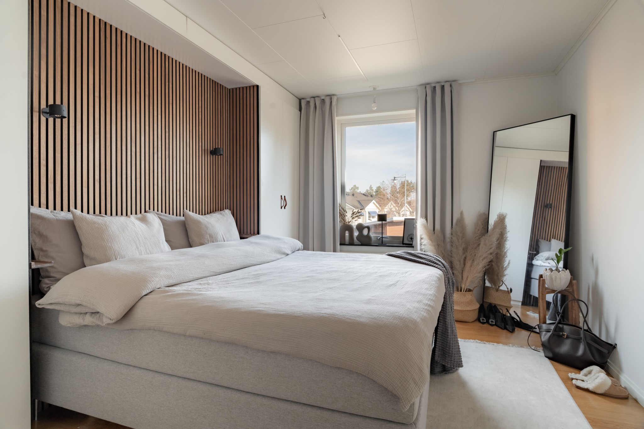 Rogivande Master Bedroom med ljusmålade ytskikt och parkettgolv. Stilren väggpanel i trä som övergår i ljusa, platsbyggda garderober och skapar ett enhetligt uttryck. Plats för dubbelsäng med tillhörande sängbord samt fint ljusinsläpp från stort fönster.