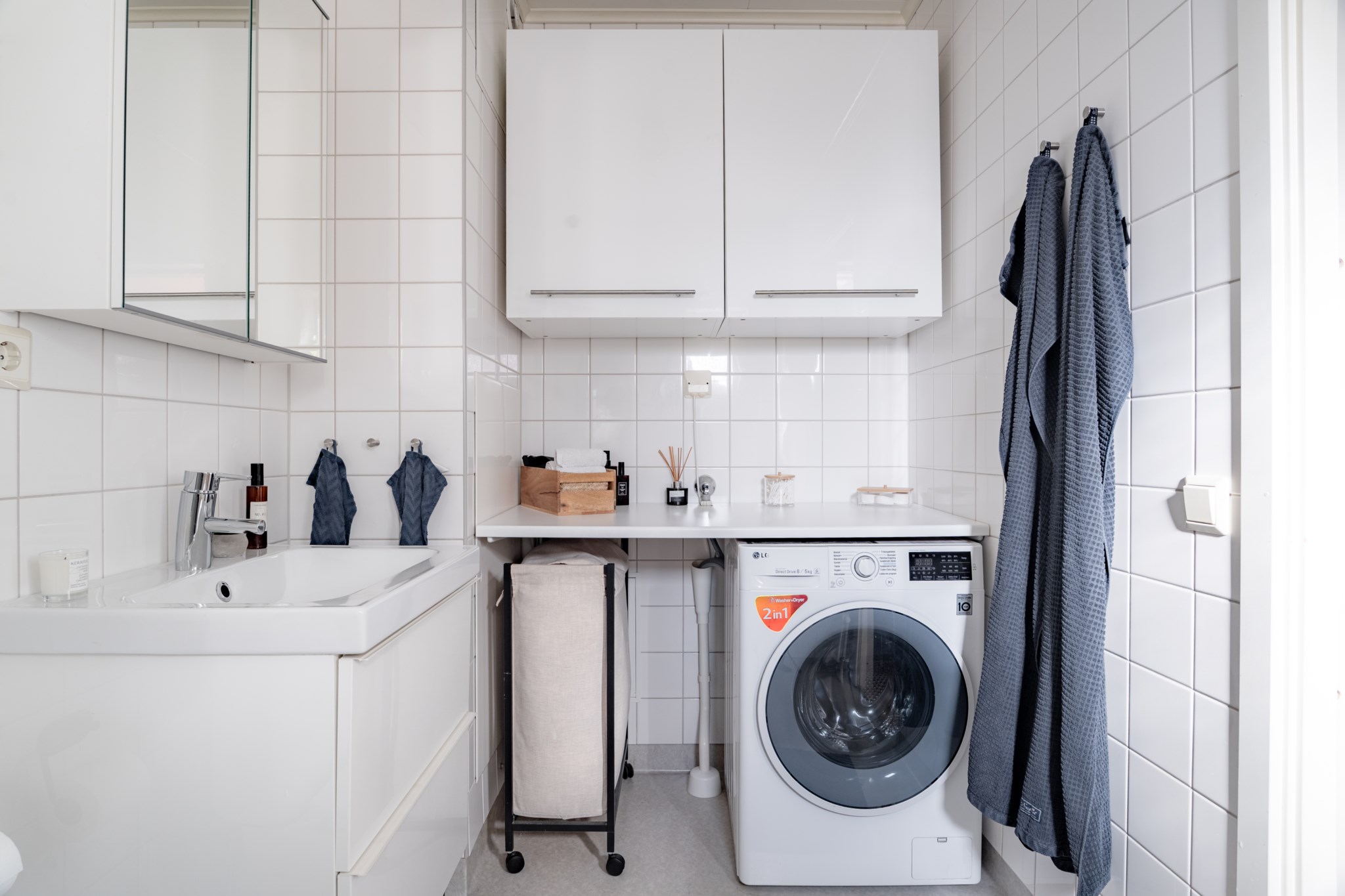 Ljust badrum med kaklade väggar och grå duschmatta. Utrustat med wc, handfat med kommod, spegelskåp, tvättmaskin samt dusch med infällbara duschväggar i industriell stil. Förvaring finns i två badrumsskåp.