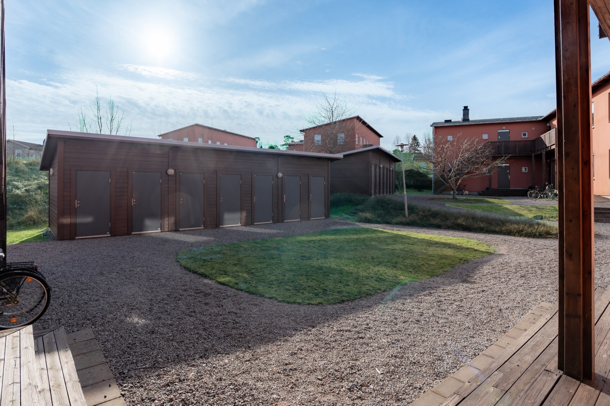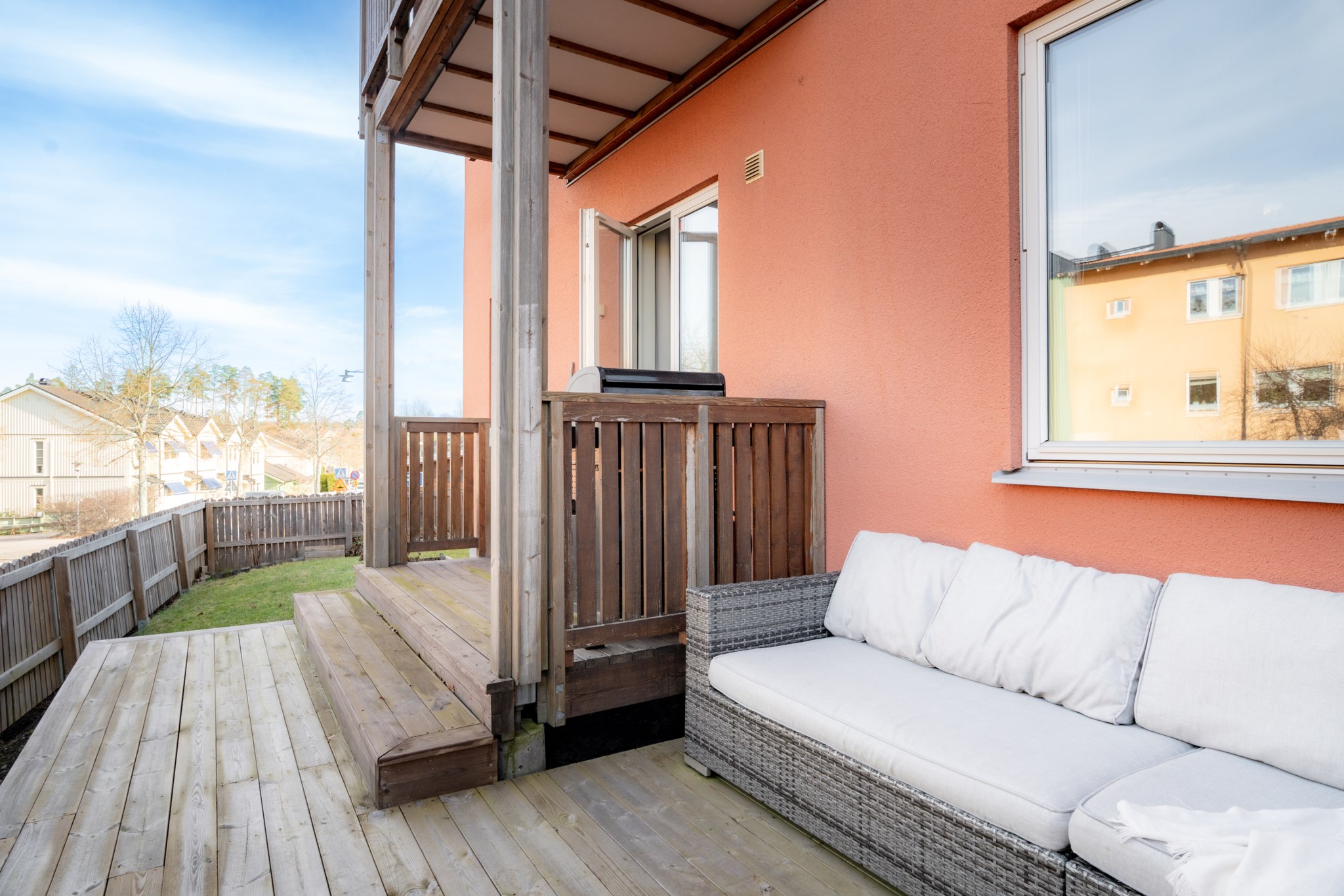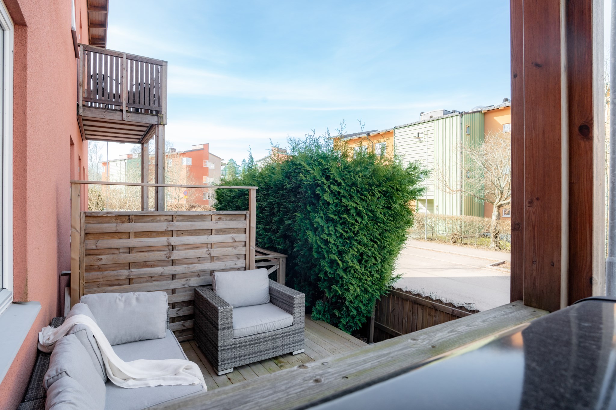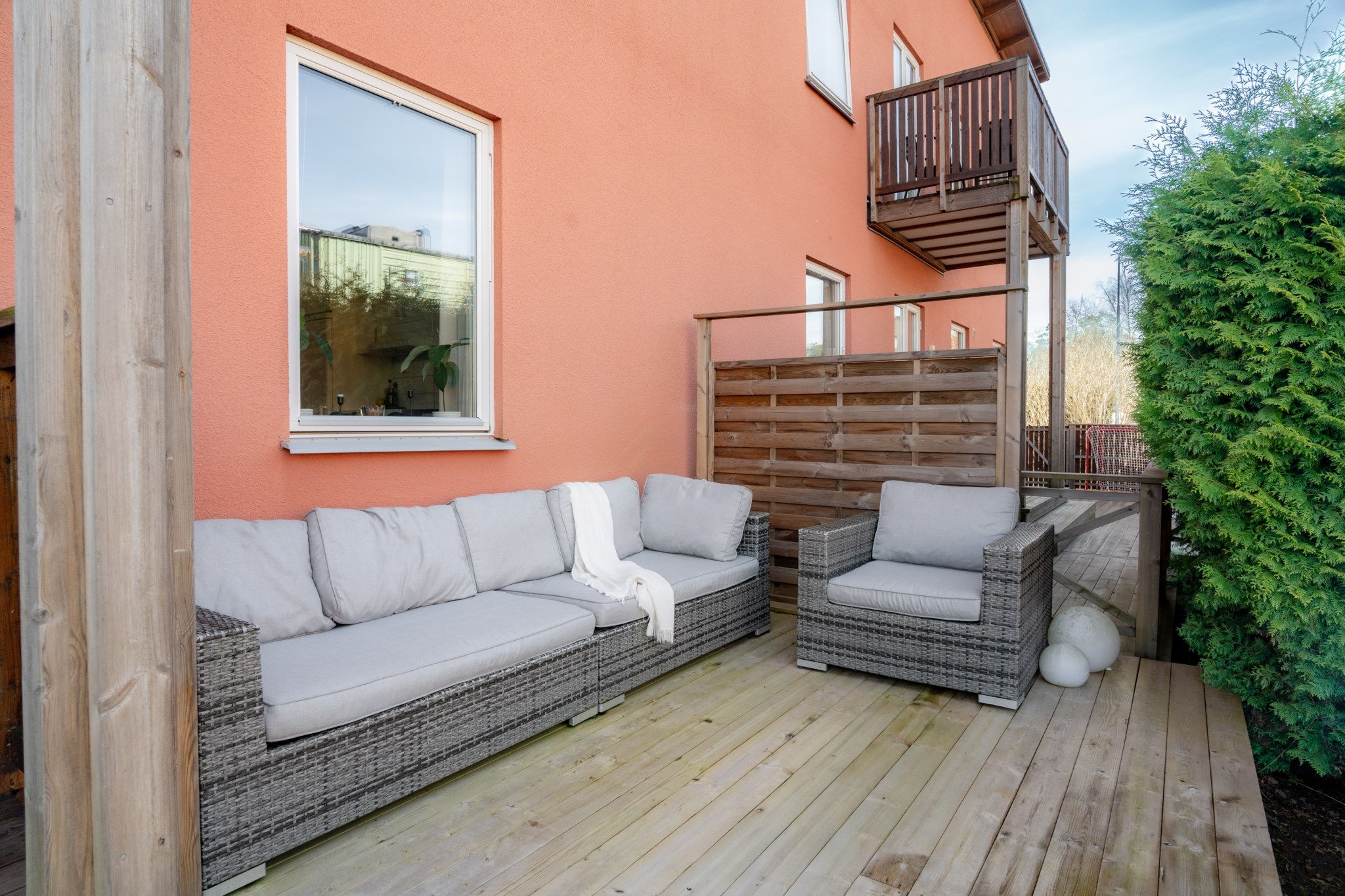 Via vardagsrummet nås bostadens generösa uteplats på ca 50 kvm i sydvästligt läge, här finns en stor rymlig trall som ger plats för loungemöbler och grill samt en gräsmatta med odlingslådor.