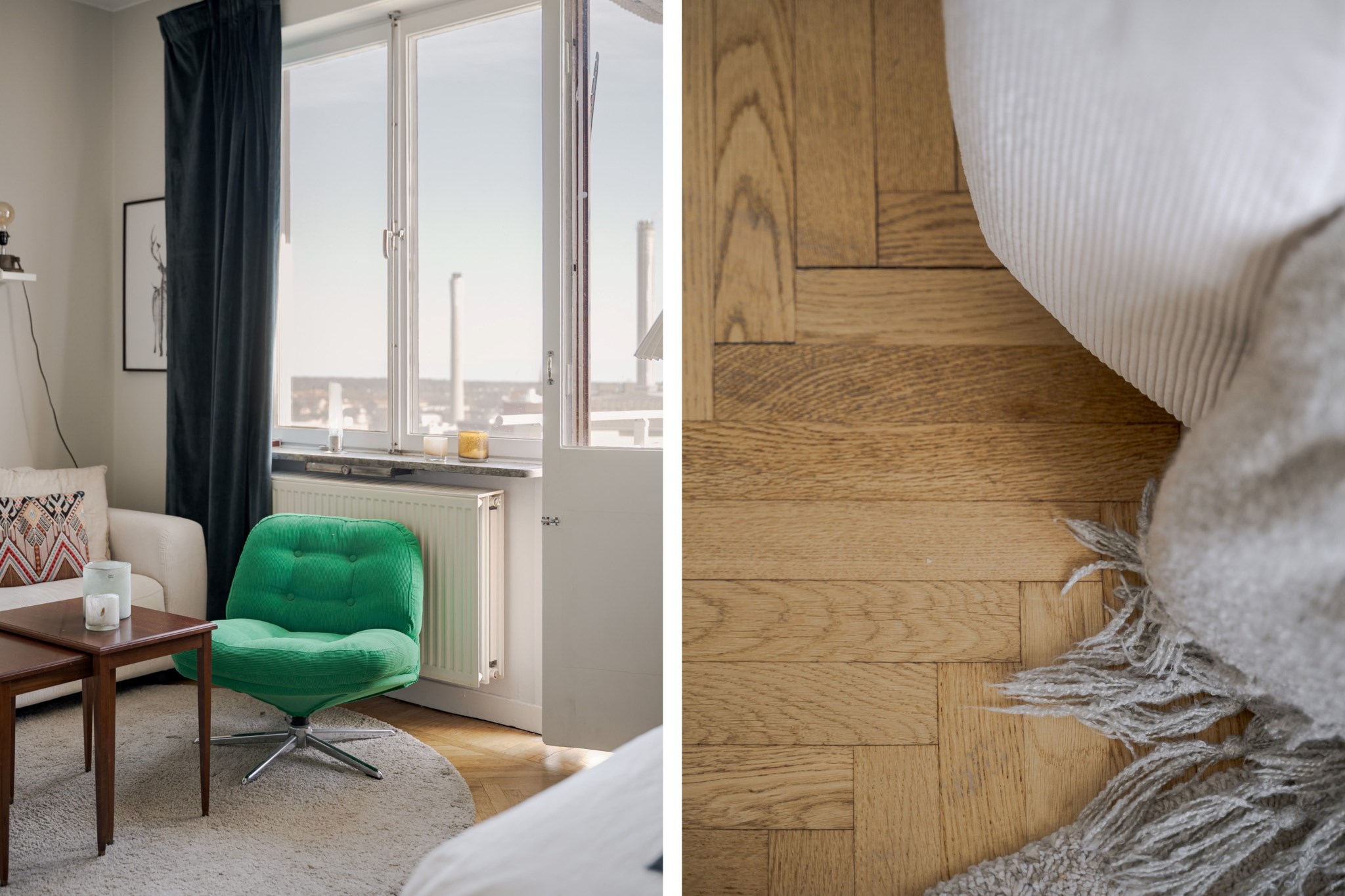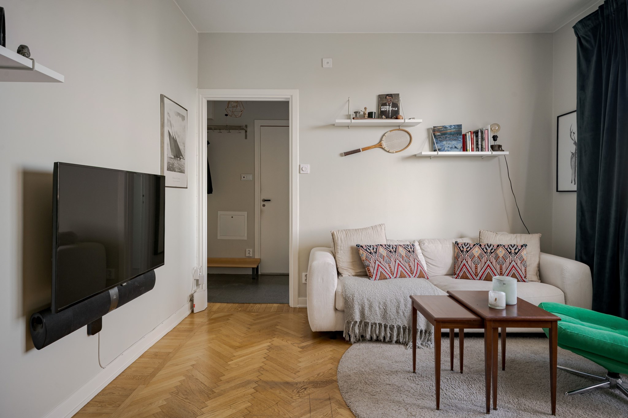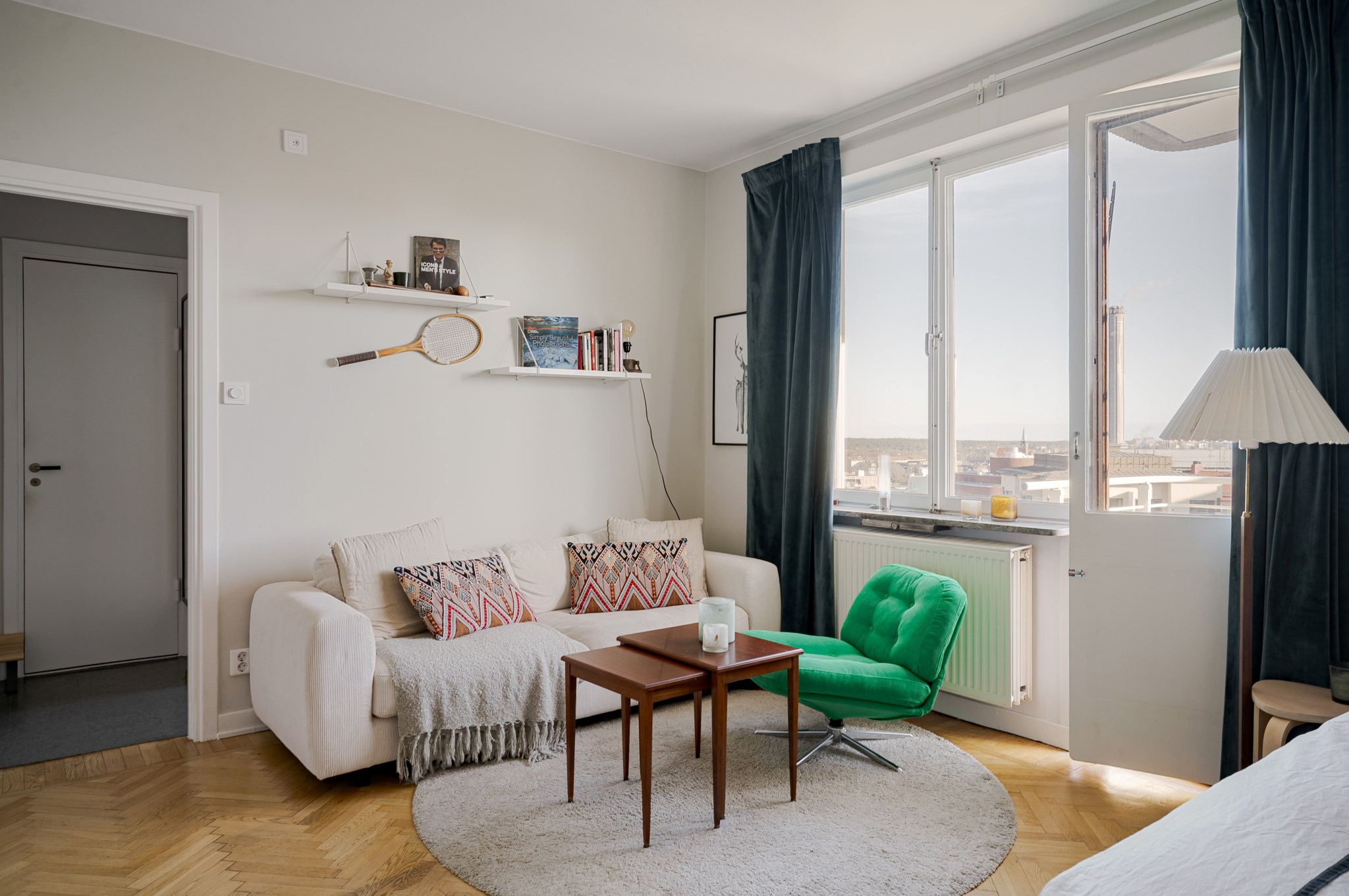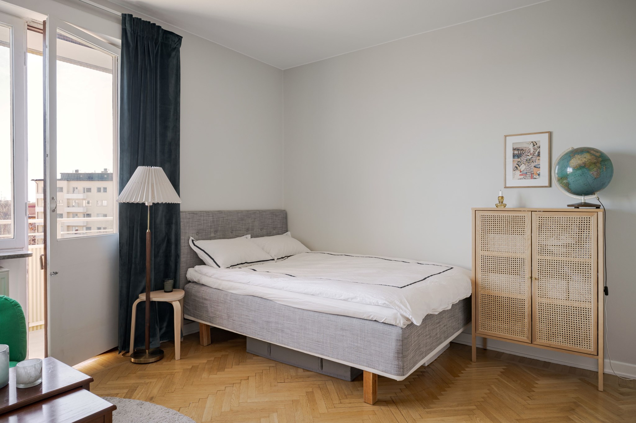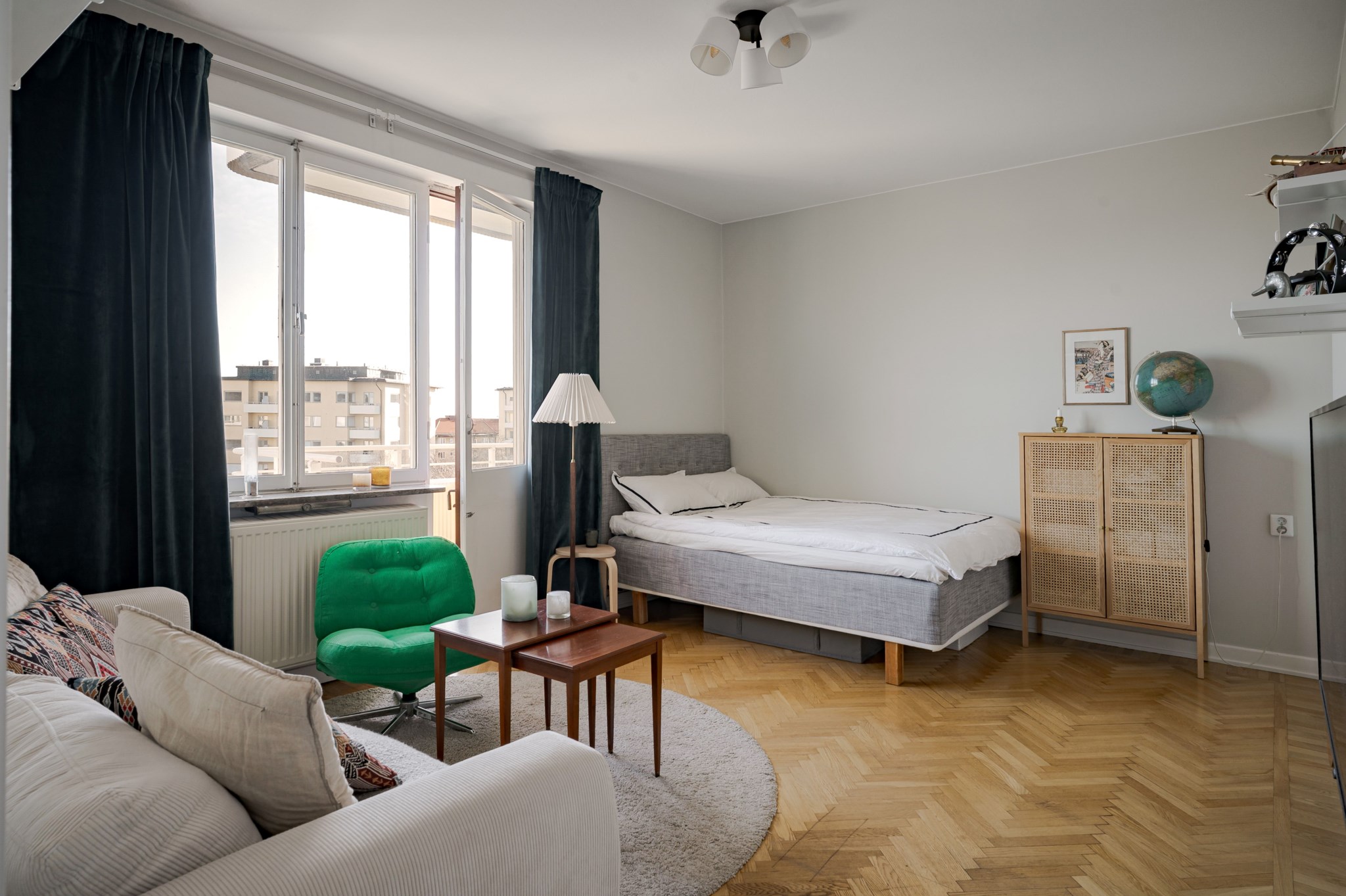 Välplanerat allrum med ljusmålade ytskikt och vacker fiskbensparkett. Här finns plats för både soffa, säng och övrigt möblemang och personlig inredning. Stort fönsterparti ger fint ljusinsläpp och tillsammans med balkongöppningen skapas en naturlig förlängning av rummet under årets varmare månader.