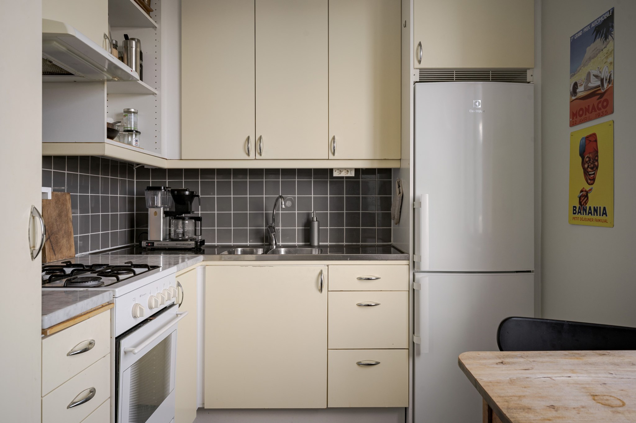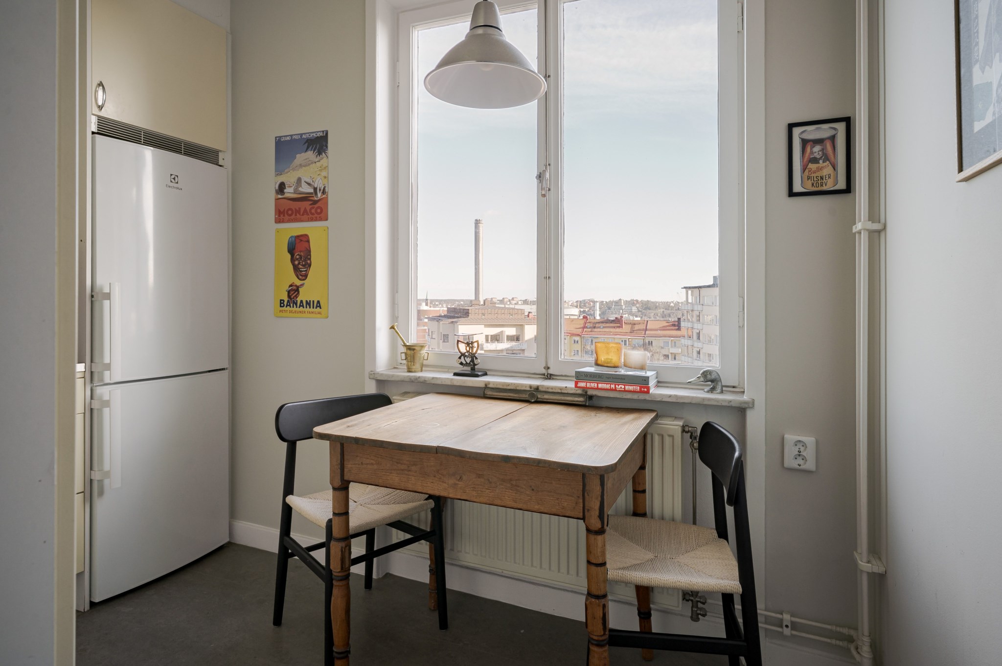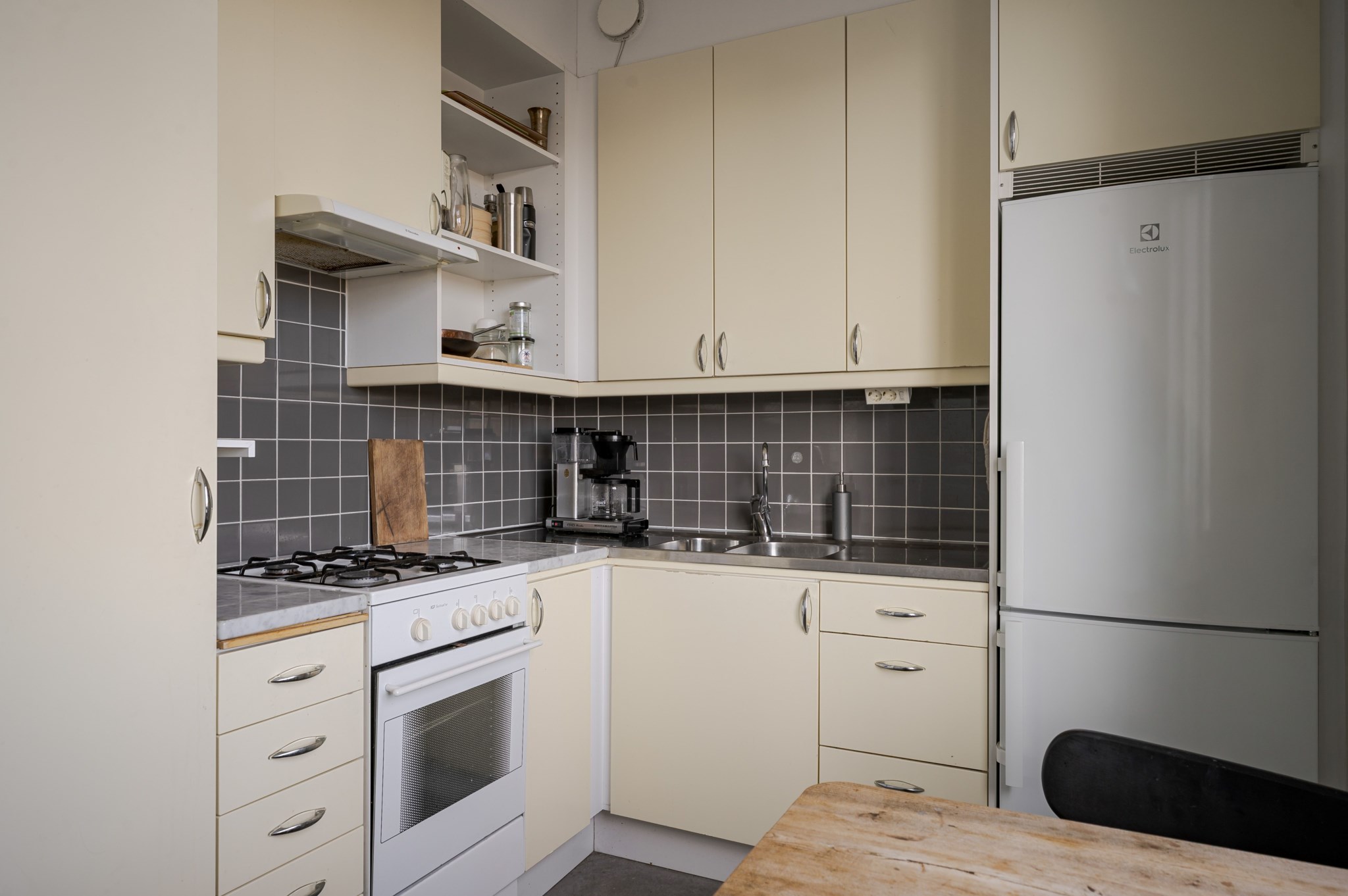 Kök med ljusmålade ytskikt och mörkt golv. Fint ljusinsläpp och utsikt från fönster med plats för ett mindre matbord och stolar intill. Ljusa skåpsfronter kombineras med mörkt kaklad väggpanel samt arbetsbänkar i både melerad skiva och rostfritt stål. Maskinell utrustning i form av kyl/frys, gasspis, ugn och fläkt.