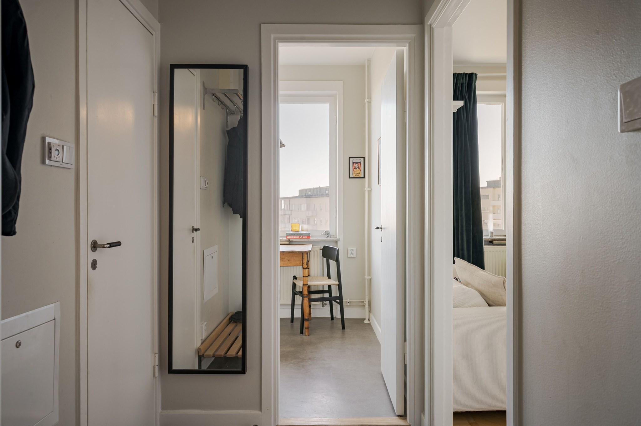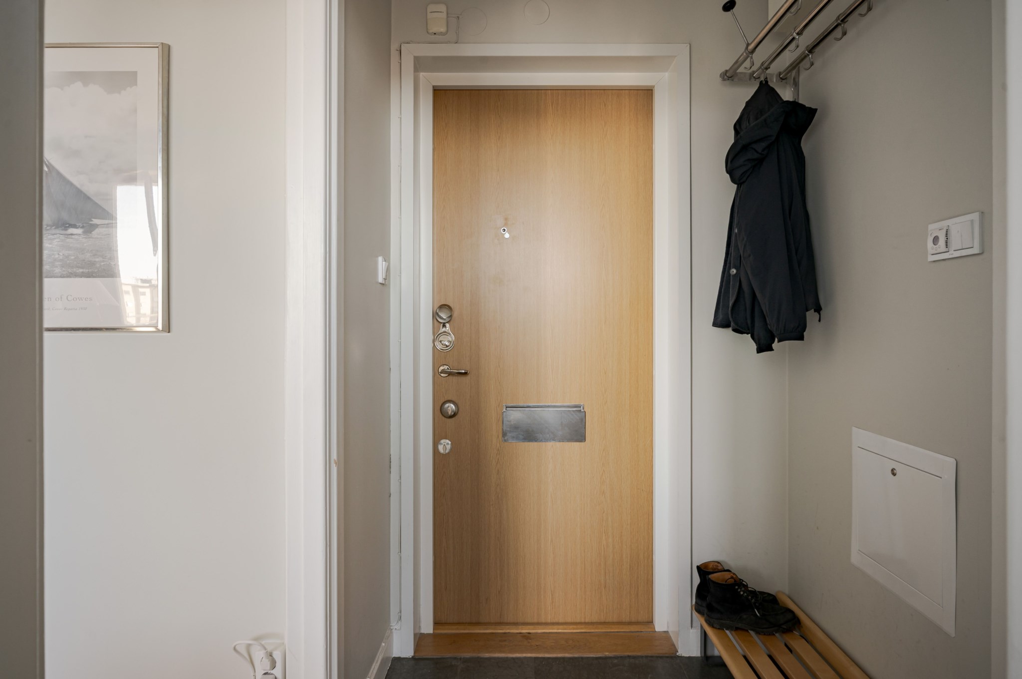 Välkomnande hall med neutralt målade ytskikt och mörkt stengolv. Hatthylla finns placerad intill ytterdörren för smidig avhängning av ytterkläder och skor.
