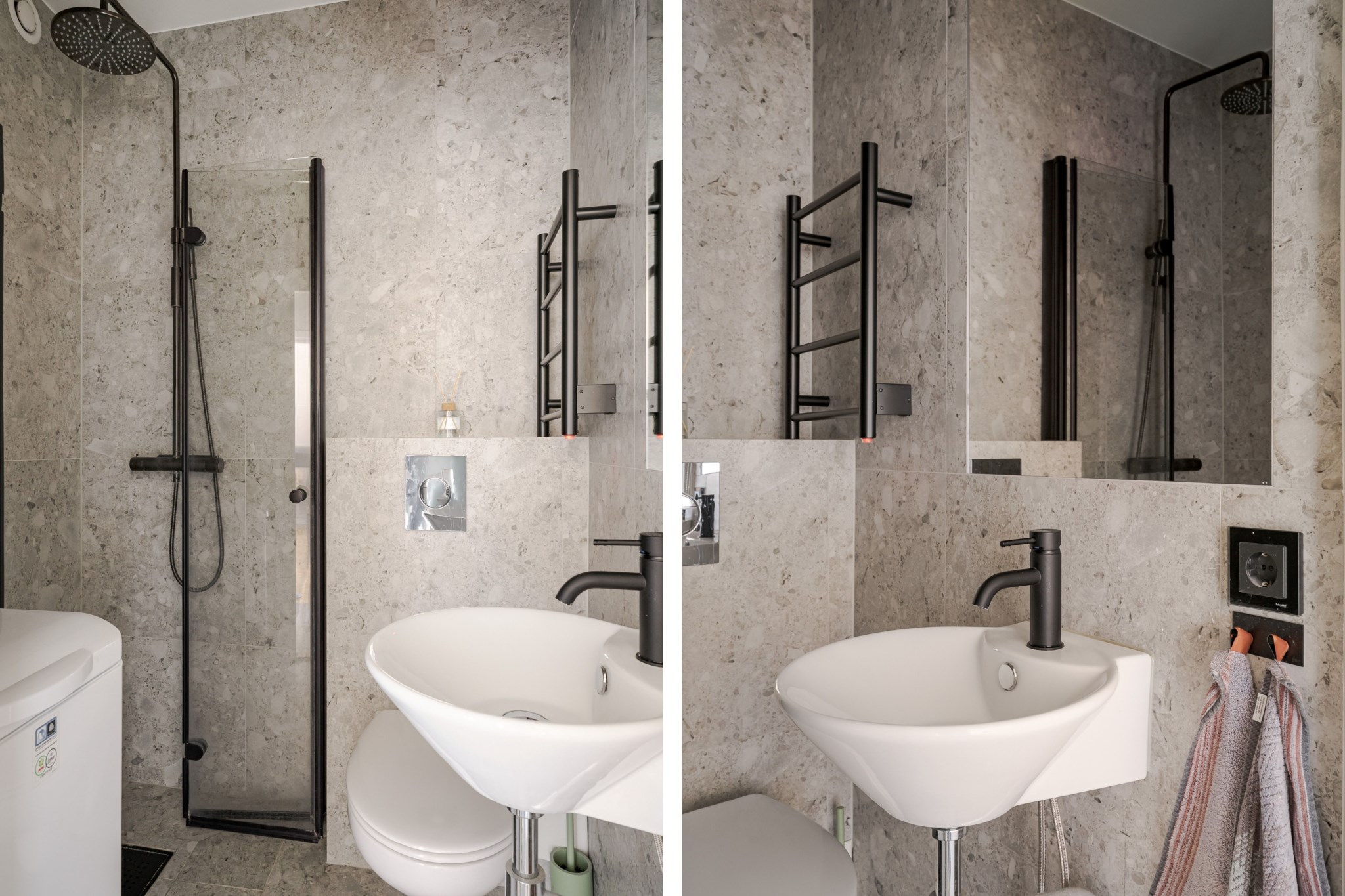 Modernt helkaklat badrum med enhetligt, melerat kakel och klinker. Badrummet är inrett med WC, handfat, spegel, handdukstork samt takdusch med vikbar duschvägg i klarglas.