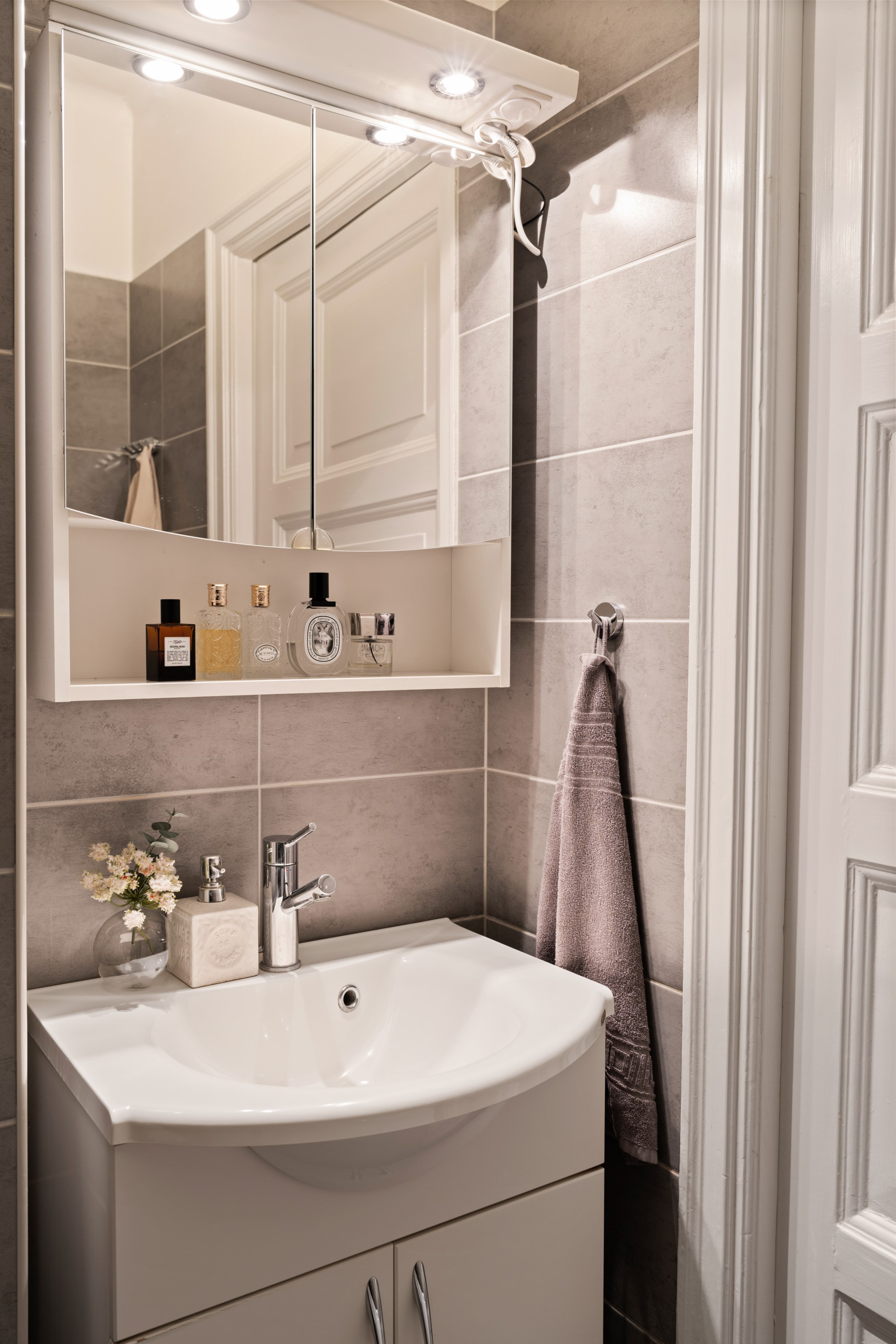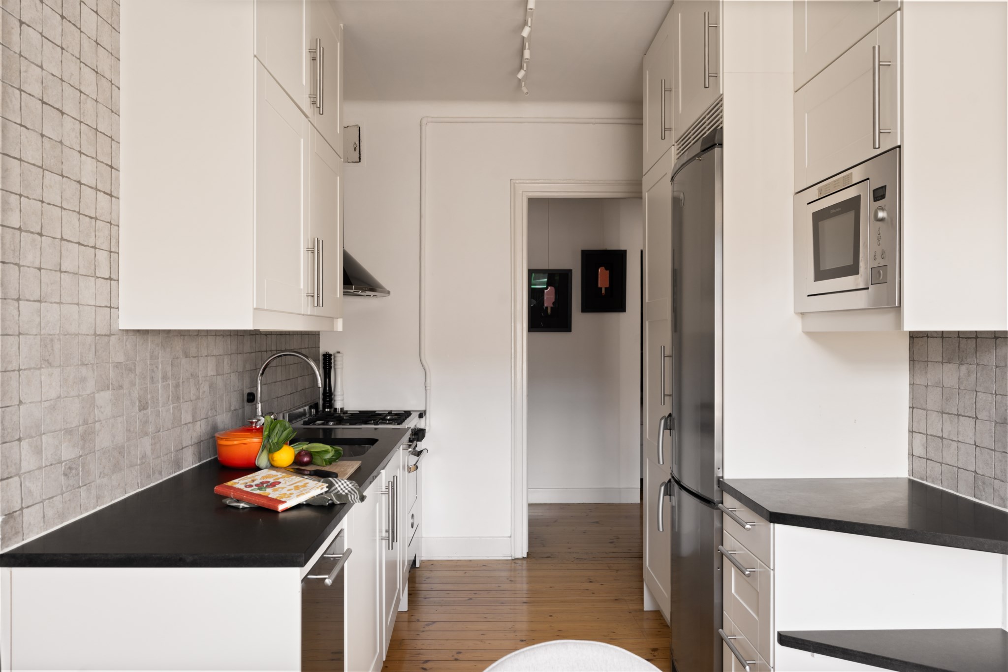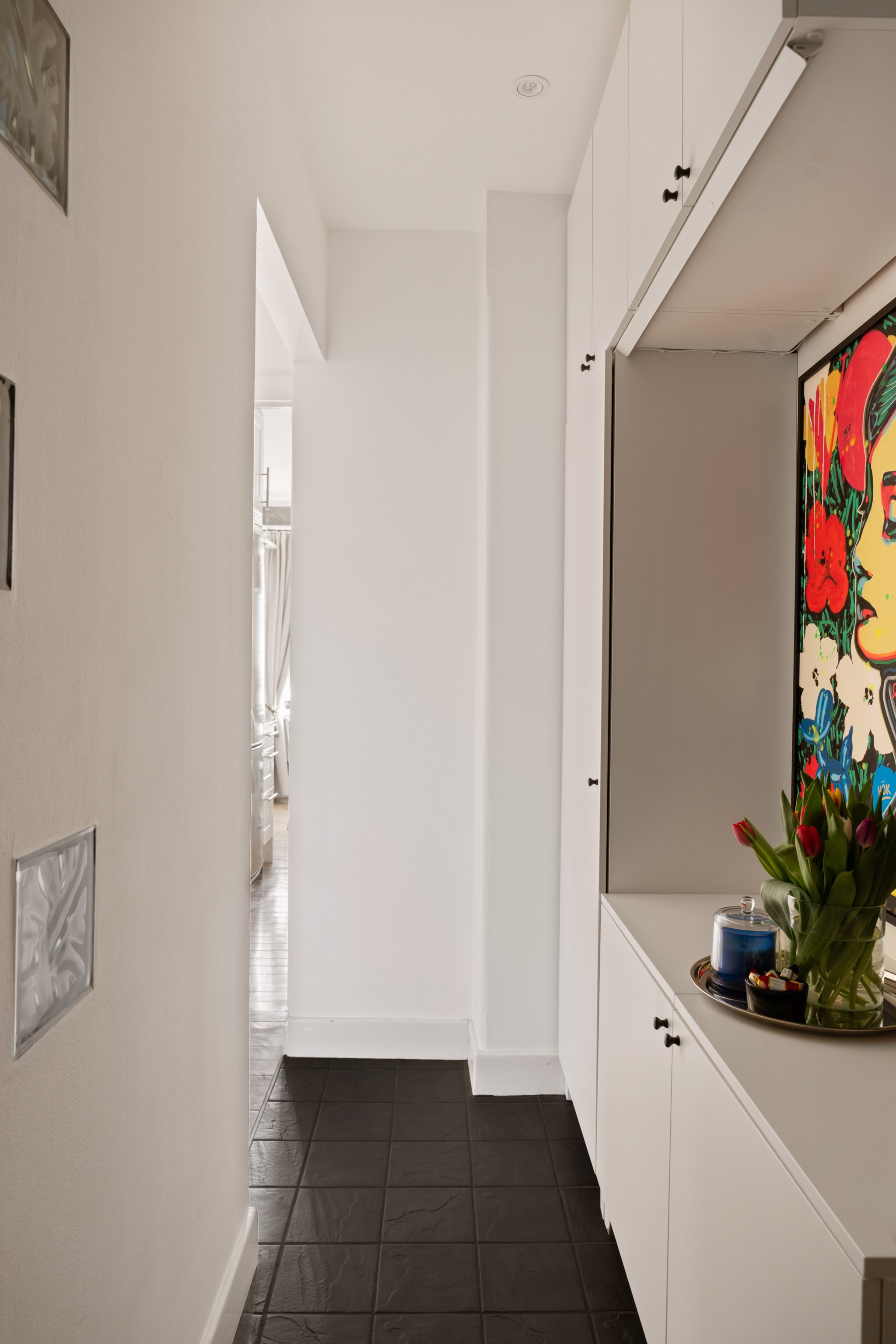 Köket erbjuder stilrent och välplanerat med goda arbetsytor, moderna vitvaror och vackra detaljer som vägg kaklad i grått och mörk bänkskiva. Här finns även plats för en trivsam matgrupp invid ett av fönstren – perfekt för både vardagsmiddagar och sociala tillställningar. Badrummet är funktionellt utrustat med badkar, duschvägg och stilrena kakel- och klinkerytor i grått. Den välkomnande hallen erbjuder genomtänkta förvaringslösningar och de fina detaljer som takrosett och unika inslag som sätter prägel på bostaden och där varje kvadratmeter är perfekt nyttjad. Hiss finns!