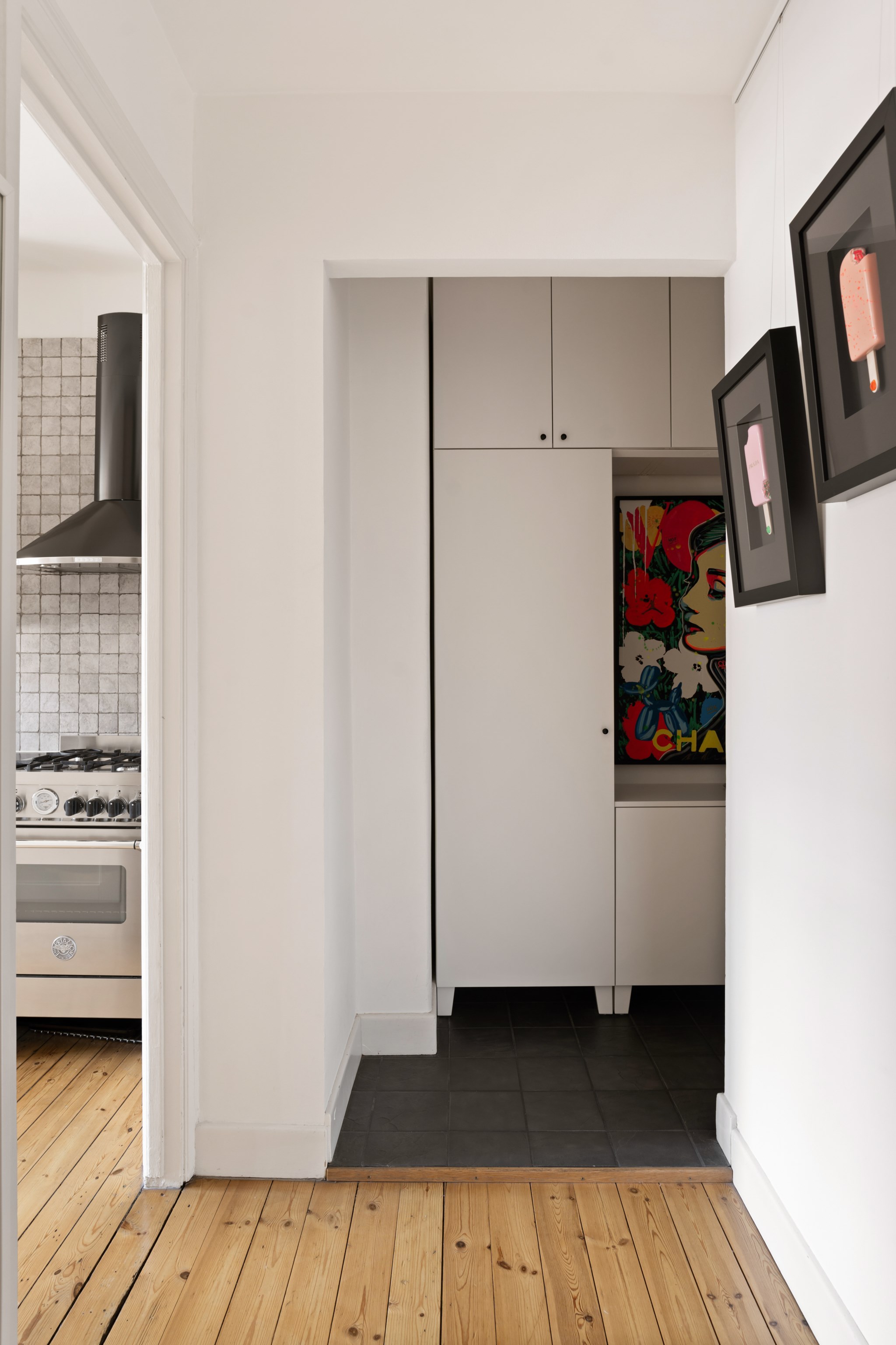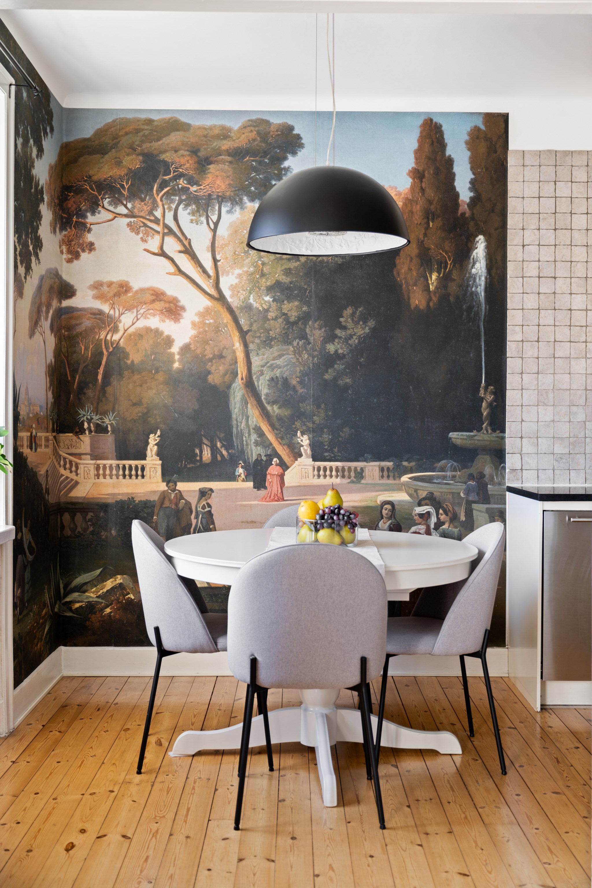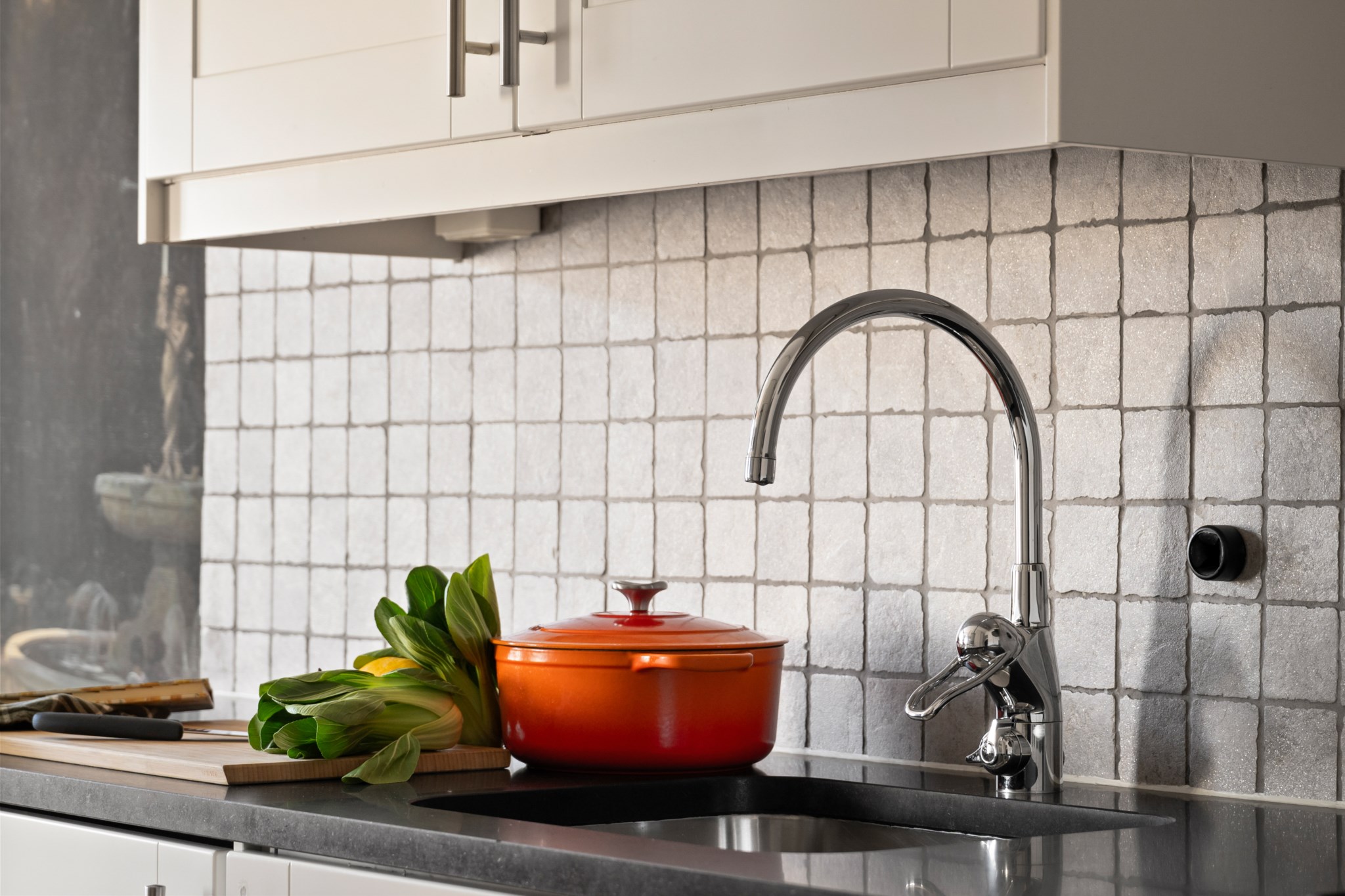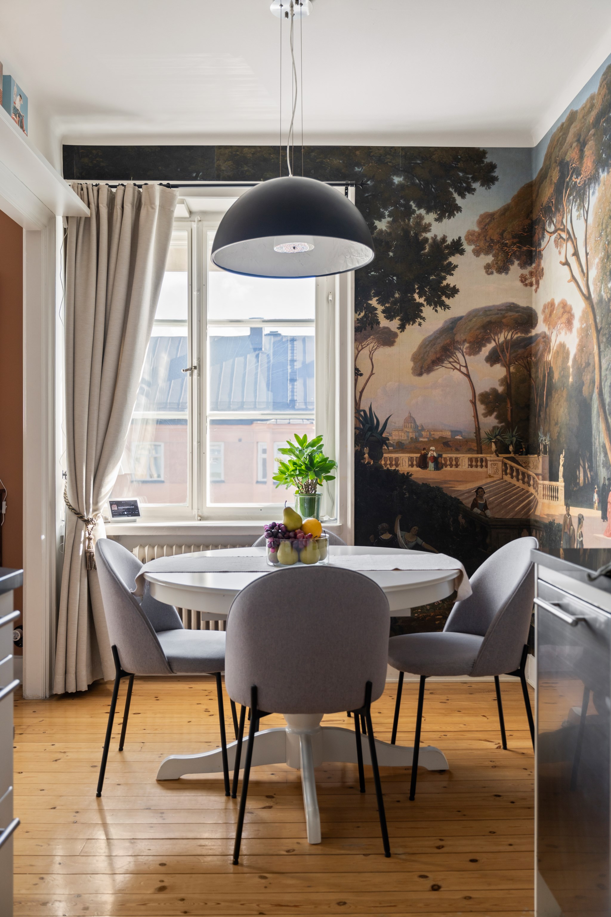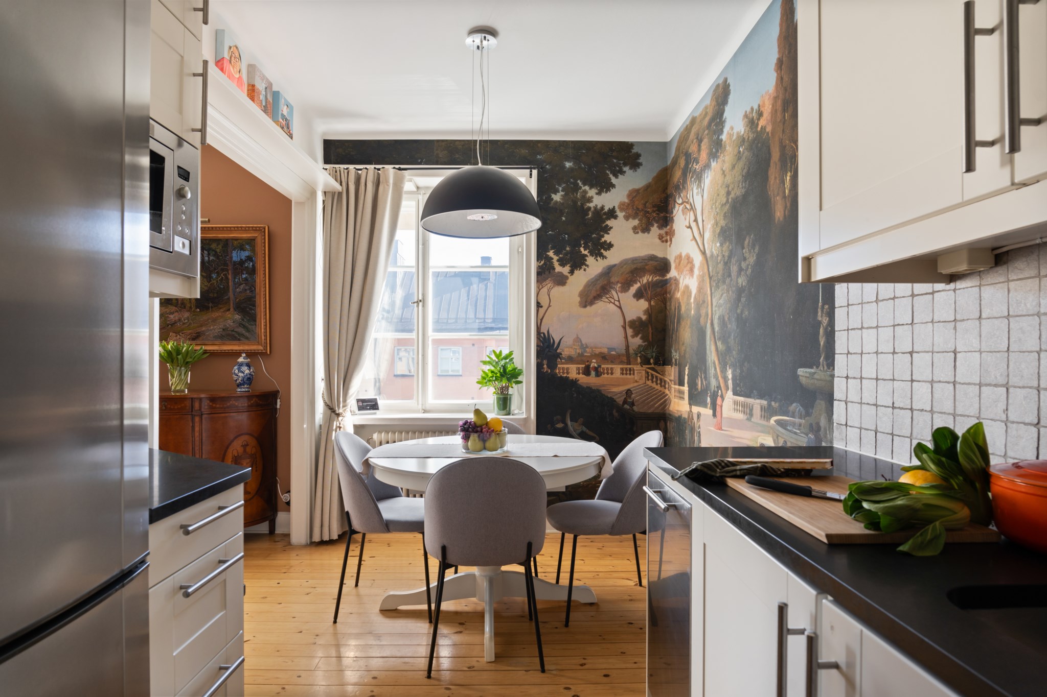 Köket är stilrent och välplanerat med generösa arbetsytor, moderna vitvaror och vackra detaljer som vägg kaklad i grått och mörk bänkskiva. Här finns även plats för en trivsam matgrupp invid fönstret. Den dekorativa fondväggen skapar en unik karaktär och ger rummet en exklusiv känsla.