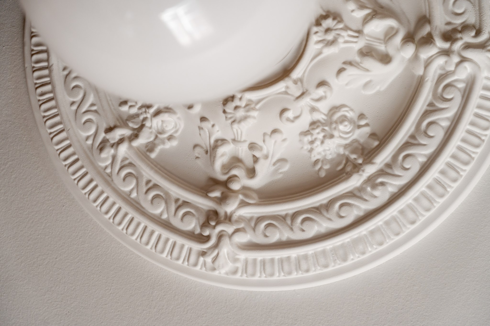Vardagsrummet erbjuder generöst utrymme, ett härligt ljusinsläpp från det spröjsade fönsterpartiet, vackra trägolv, takrosett och rummets färgsättning och detaljer bidrar till en ombonad känsla. Generös öppning mot kök.