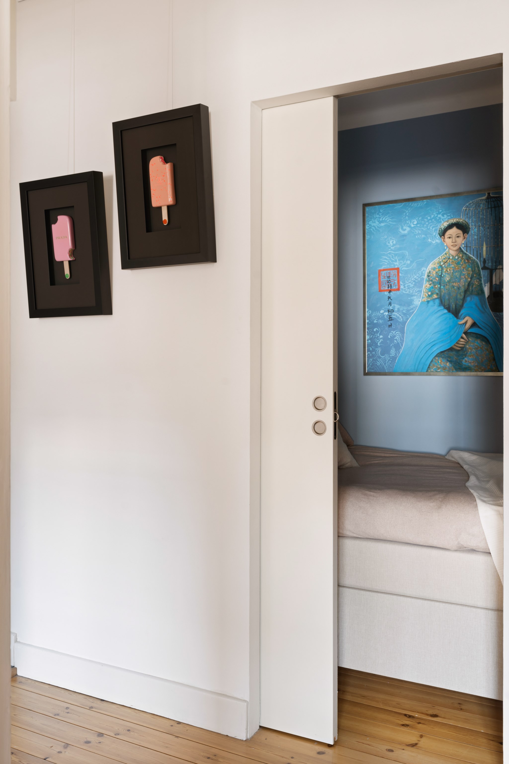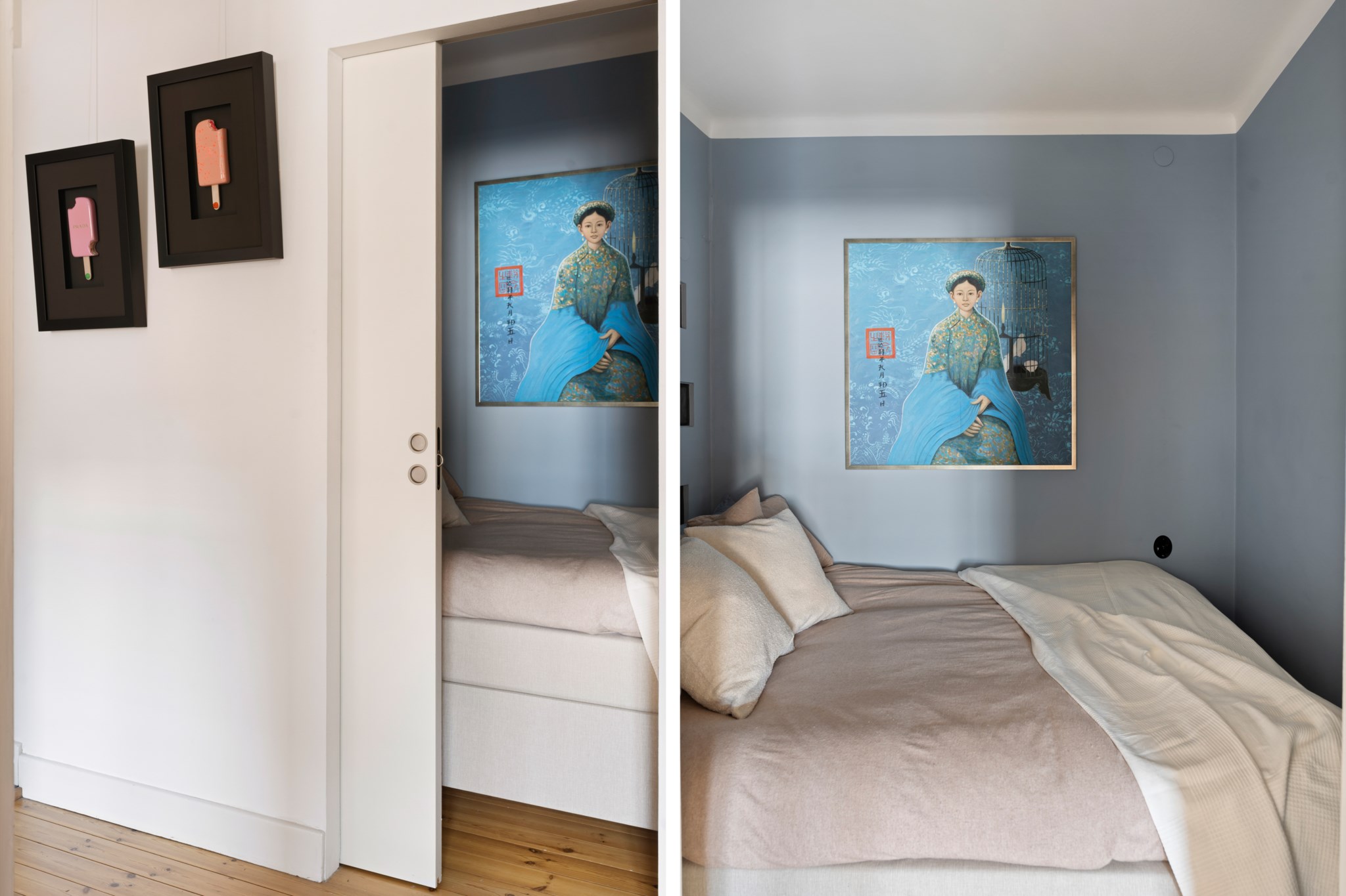 Sovdel avgränsad med praktiska skjutdörrar.