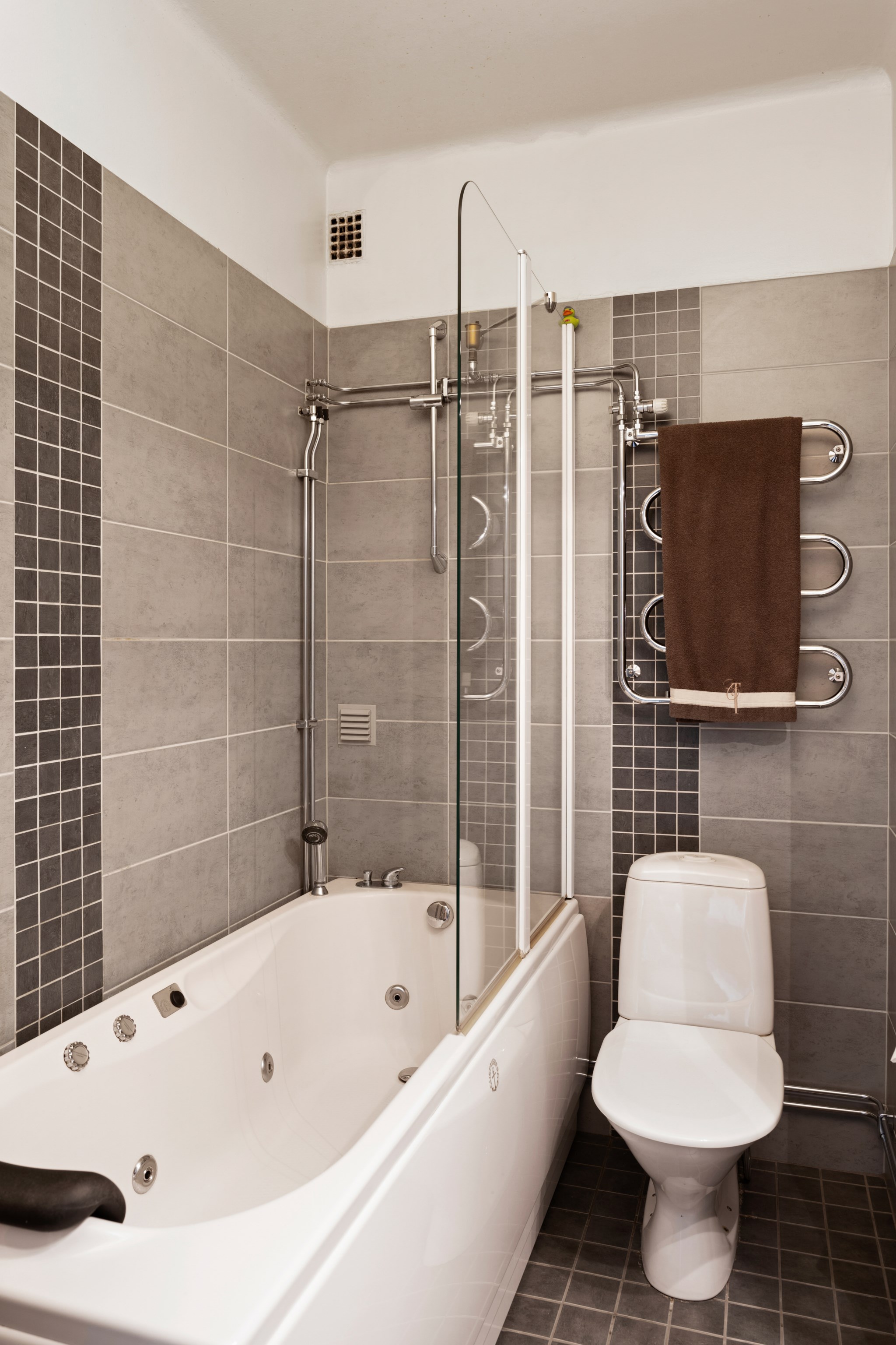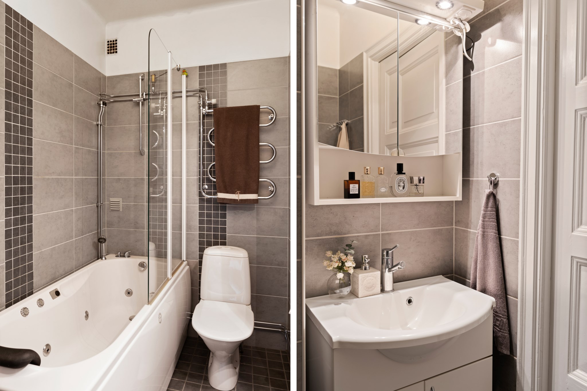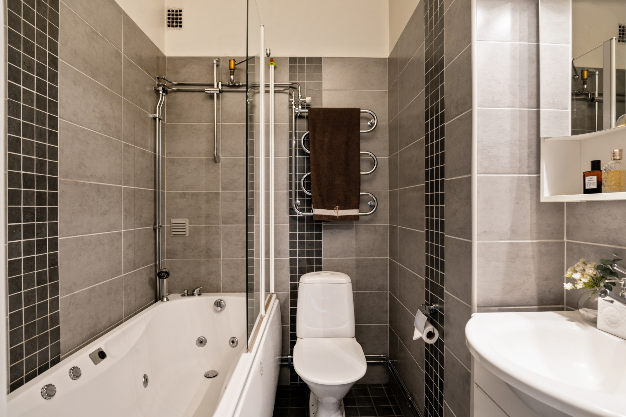 Badrummet är fräscht och funktionellt och är utrustat med badkar, duschvägg och stilrena kakel- och klinkerytor i grått.