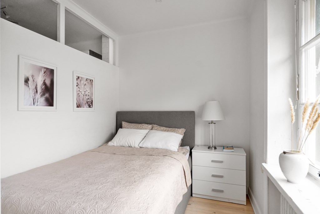 Mysigt sovrum med vita väggar och ekparkett. Plats för en mindre säng med tillhörande nattduksbord. Ljusflöde genom stort fönster.
