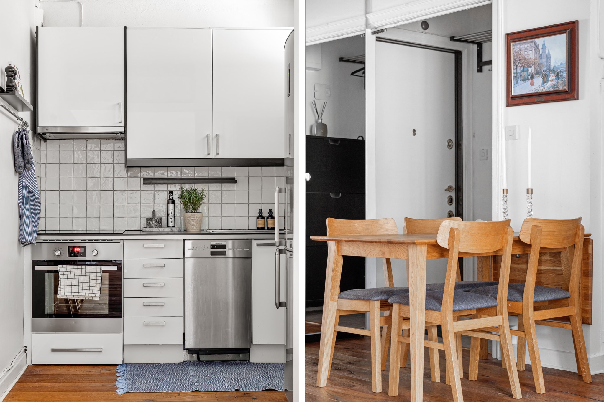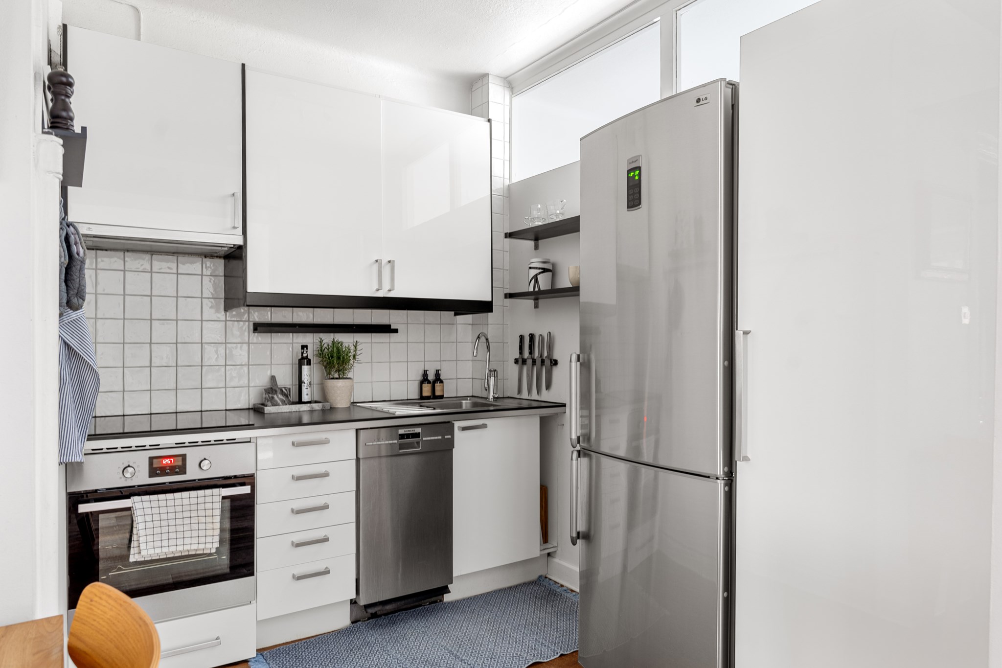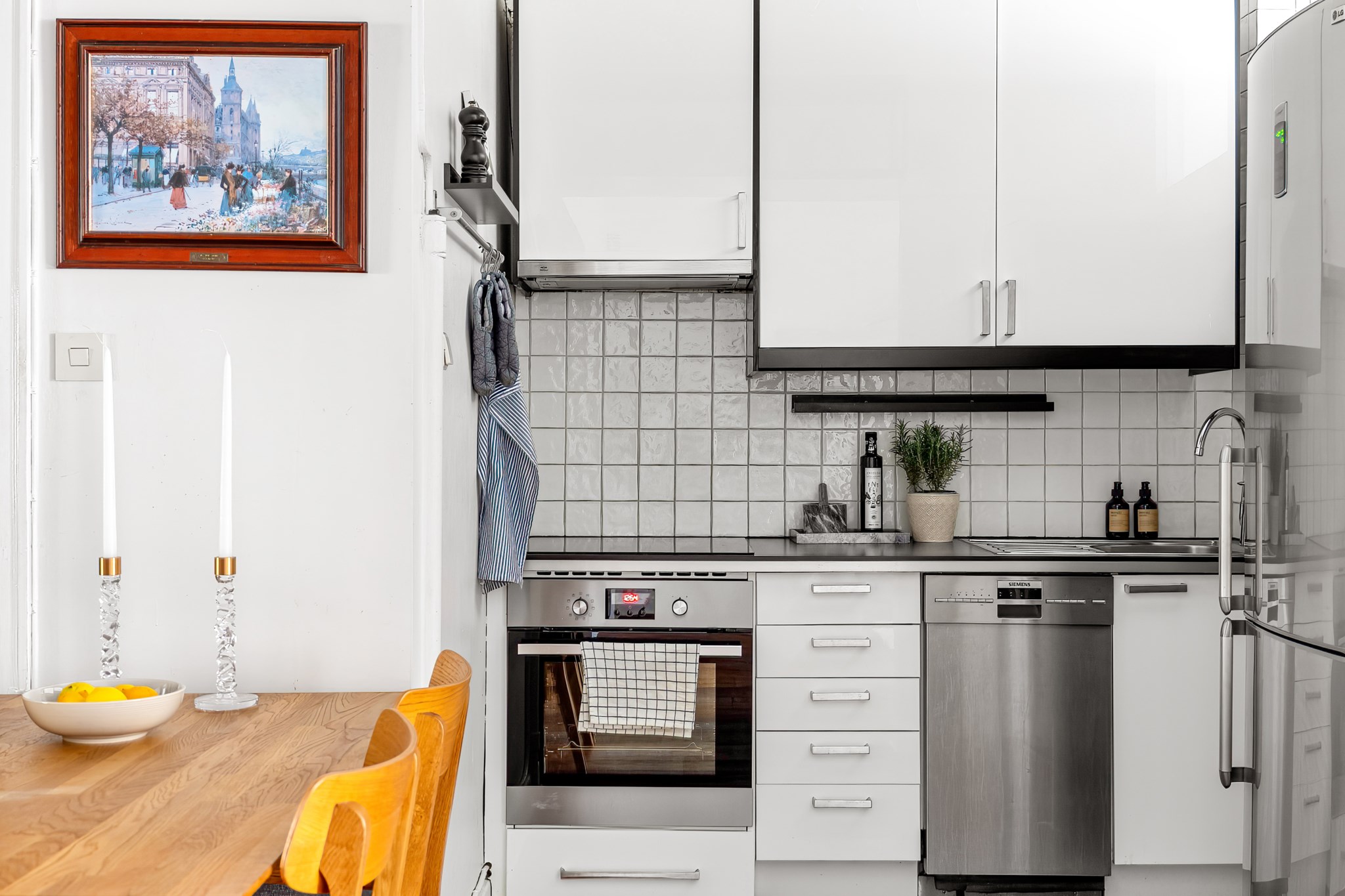 Stilrent vitt kök med släta köksluckor med handtag i rostfritt stål samt vitt kakel ovan. Köket är utrustat med spishäll, ugn, fläkt, diskmaskin samt kombinerad kyl och frys. Det är vita väggar och parkettgolv.