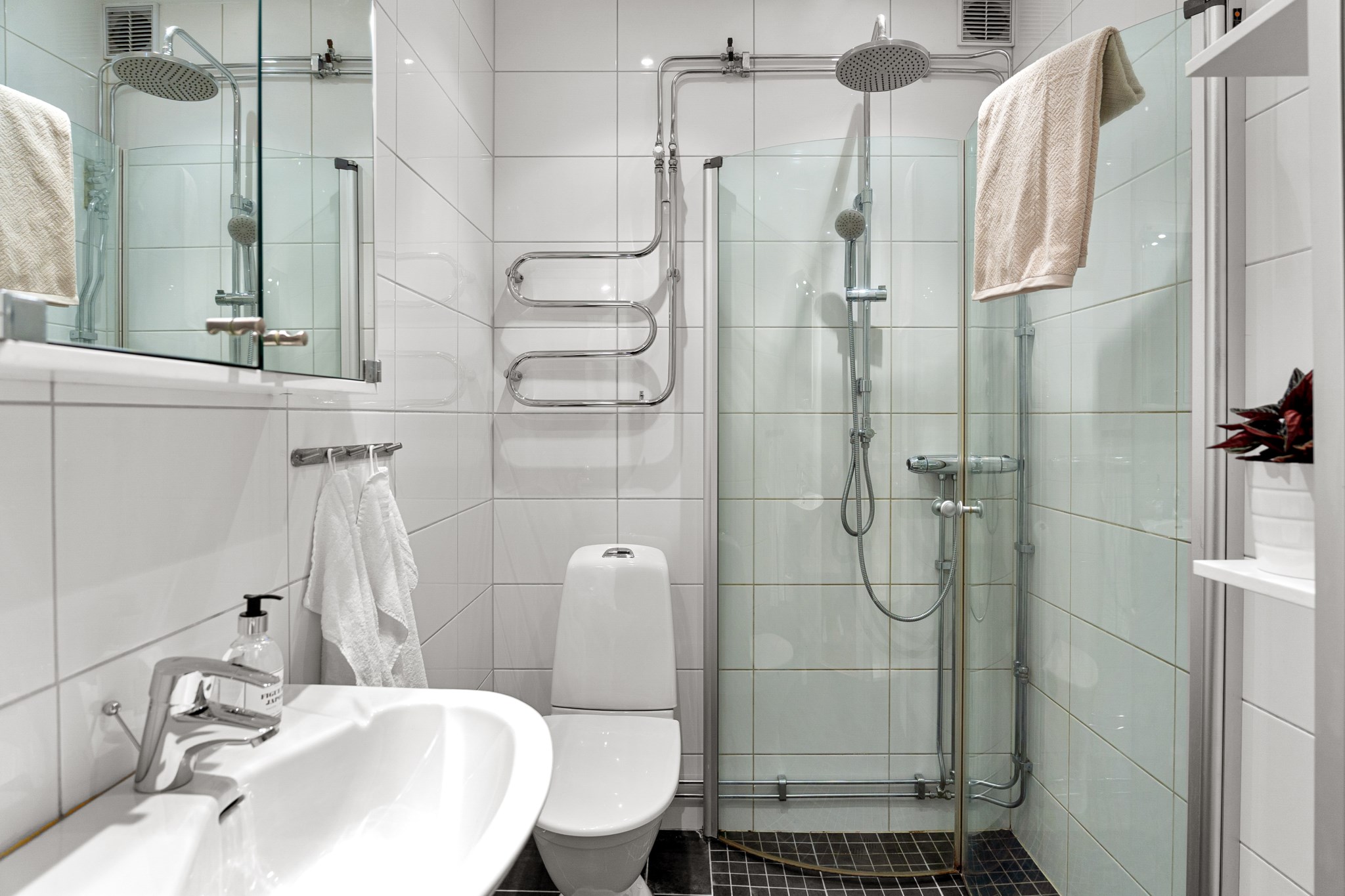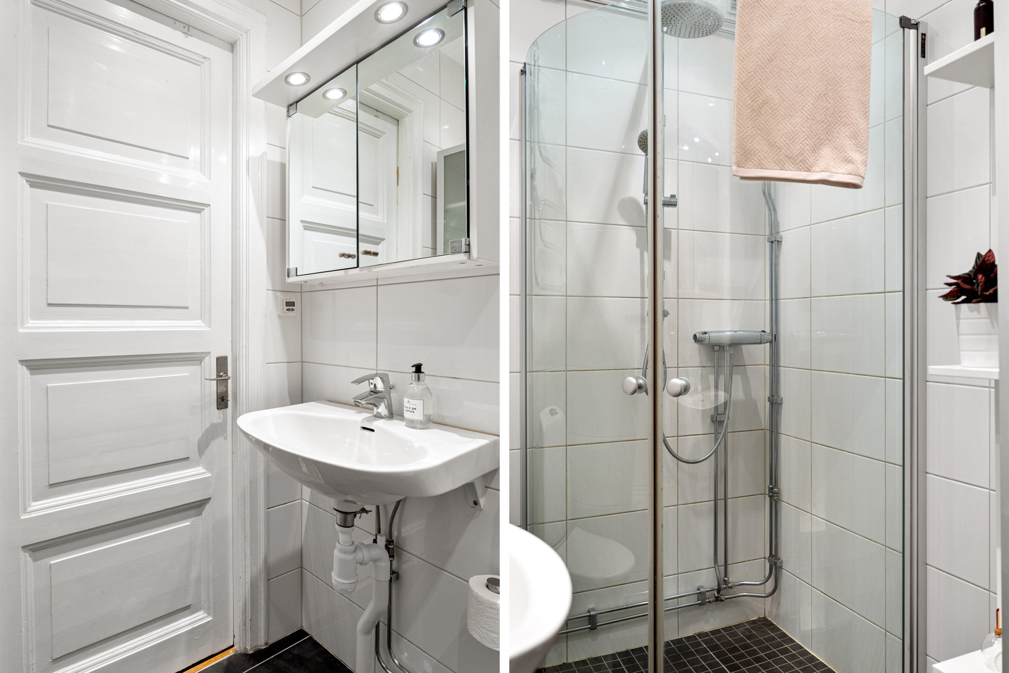 Badrummet är renoverat med kakel och klinker samt utrustat med behaglig golvvärme. Till bostaden hör även nyttjanderätt till ett vindsförråd, vilket ger extra förvaringsmöjligheter.