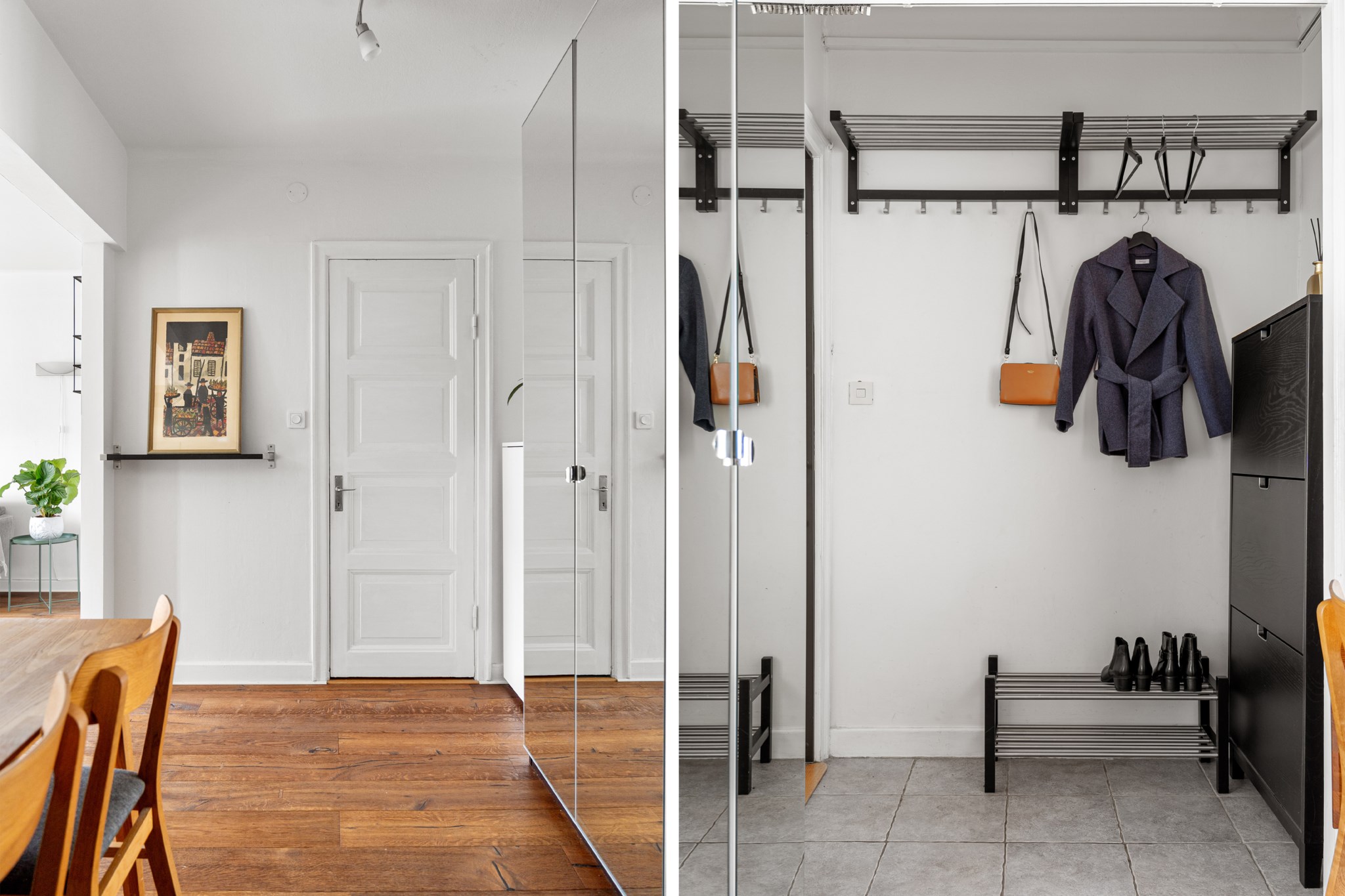 Ljus och välkomnande hall med vita väggar och grått klinkergolv. Förvaring genom spegel skjutdörrsgarderober samt avhägningsmöjligheter genom hatthylla.